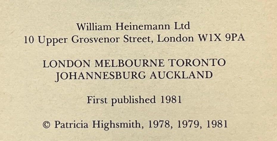 London: Heinemann, 1981. First Edition. Hardcover. Fine/Near Fine. Fine in a Near Fine jacket, unclipped (£6.95 net), faded at the spine, a scratch at the front panel. Blue cloth with silver gilt lettering on the spine. Square and firmly bound, pages toned, clean otherwise. A collection of eleven stories of suspense by the creator of Tom Ripley.
