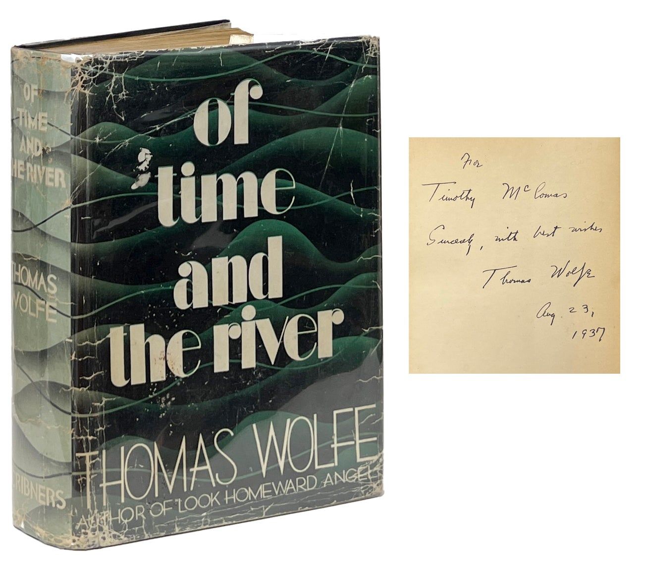 New York: Charles Scribner's Sons, 1935. Hardcover. Very Good/Good. Eighth Printing. Inscribed by Wolfe on the front endpaper. Very Good in a Good jacket, unclipped ($3.00), generally worn, faded at the spine, creases throughout. Black cloth, green ink panels and gilt lettering on the spine and front board, rubbing to the gilt. Square, bound with some reading wear, contemporaneous newspaper clipping laid-in. Wolfe's novel of "an epic quest and pilgrimage of youth--of a young man who has in him the hunger and urge of the creative artist.