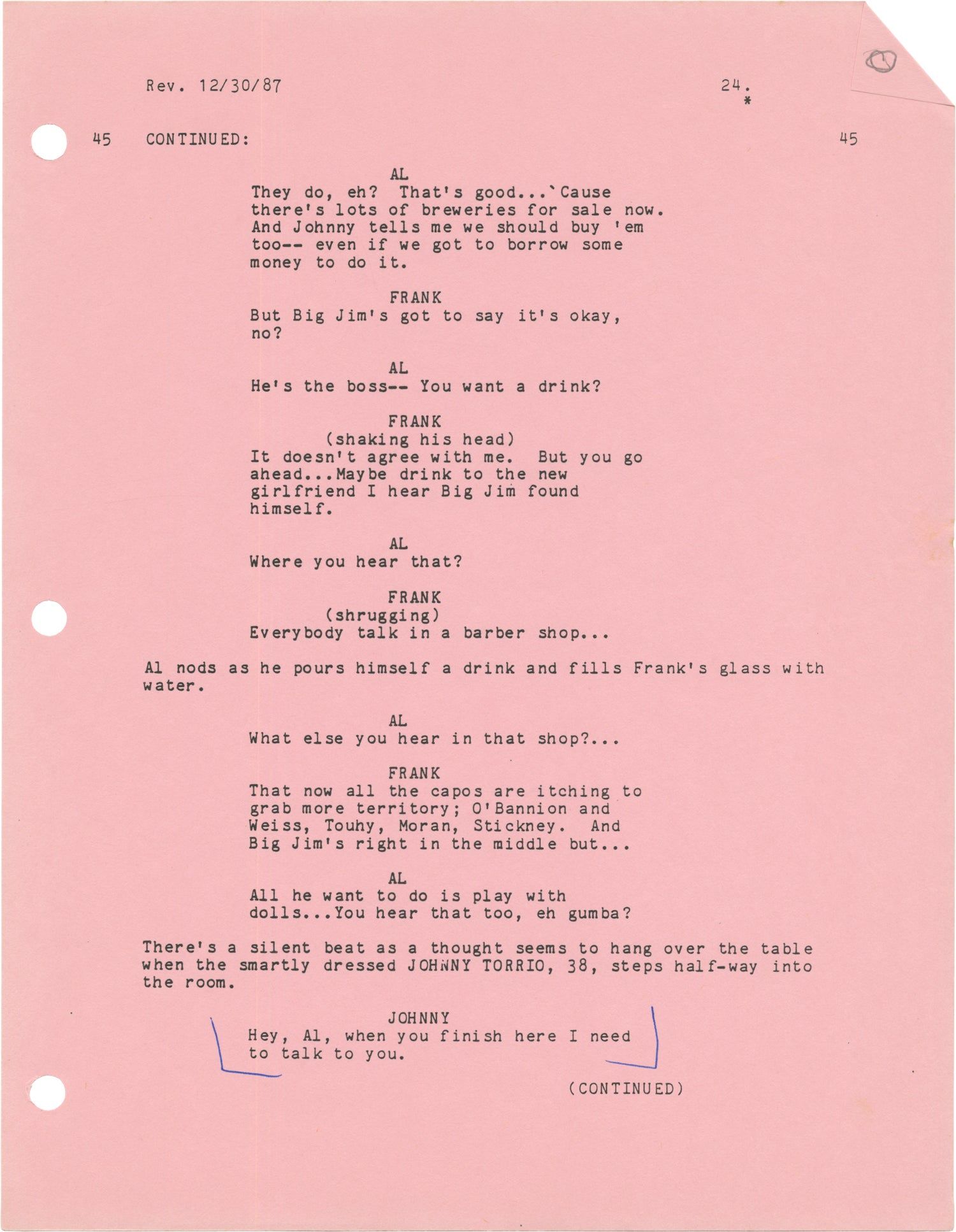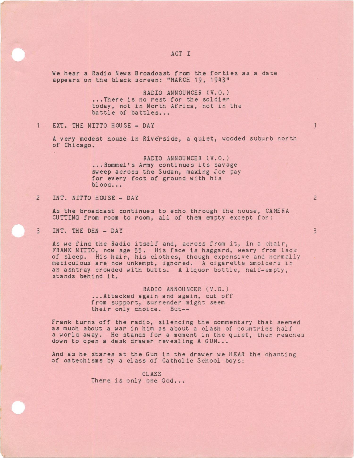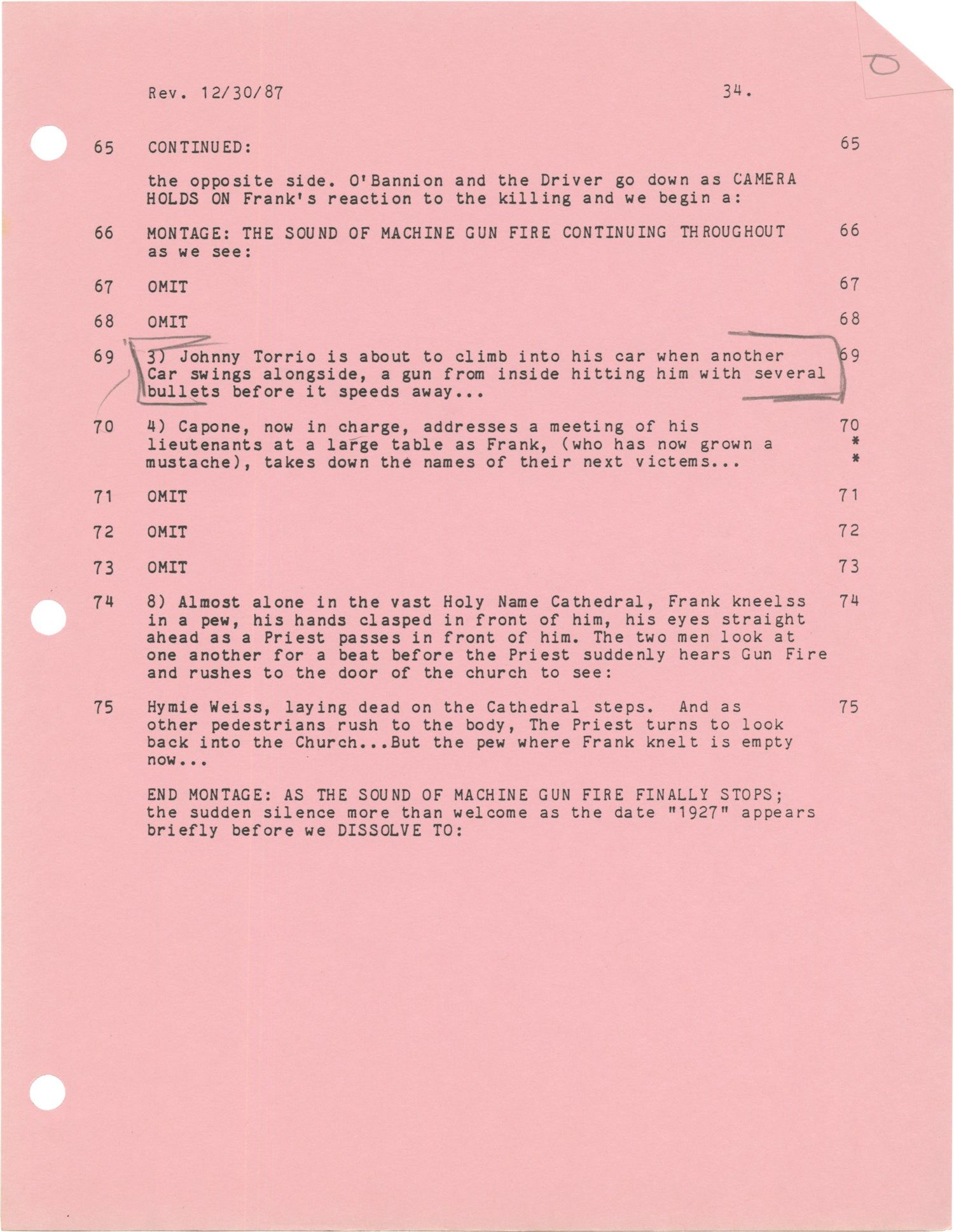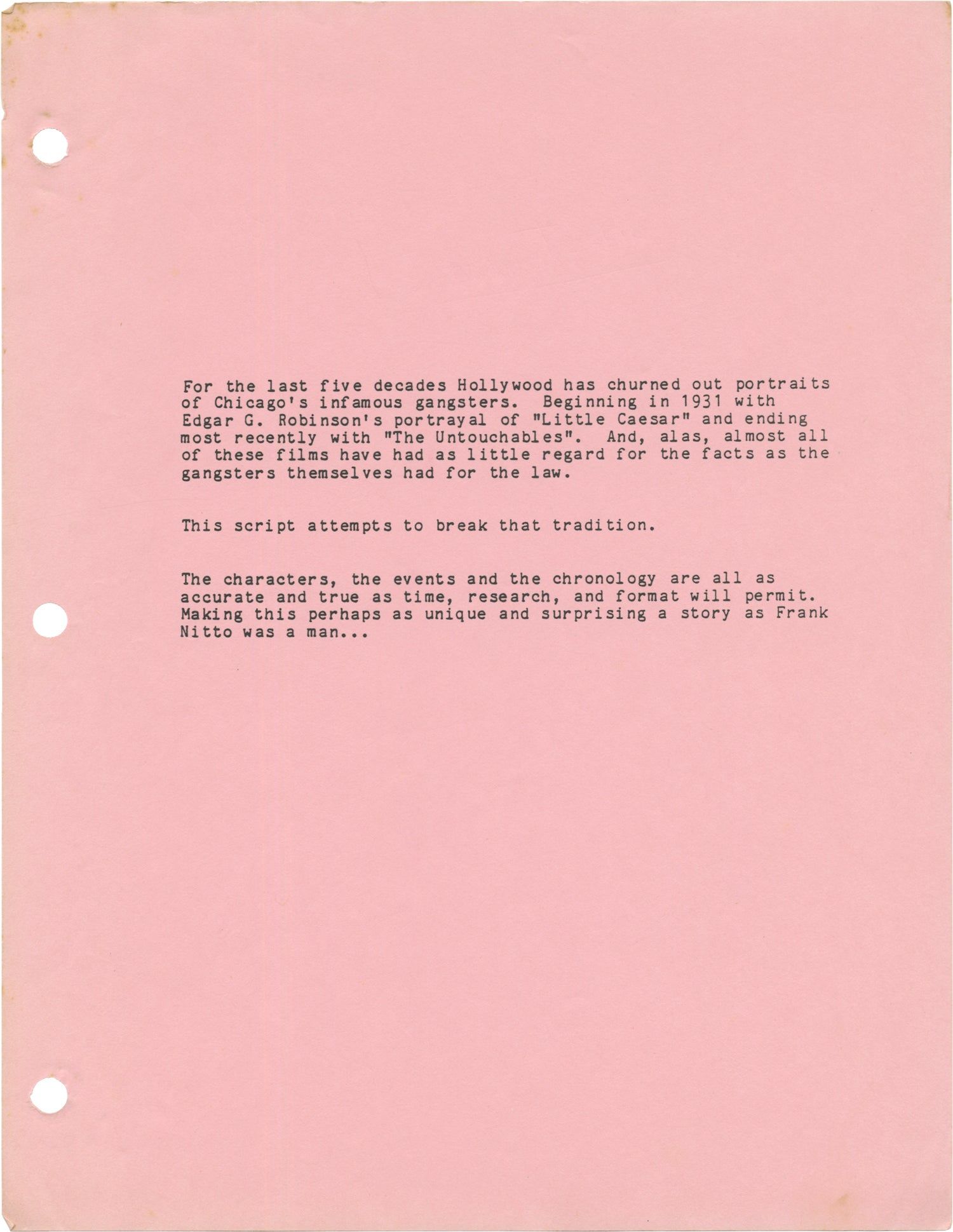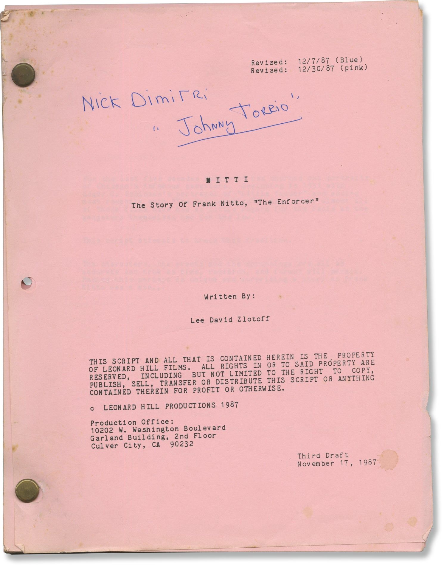 Culver City, CA: Leonard Hill Productions, 1987. Third Draft script for the 1988 television film, which aired on ABC on April 17, 1988, here under the working title "Nitti: The Story of Frank Nitto, 'The Enforcer'." Copy belonging to uncredited actor Nick Dimitri, with the manuscript ink annotation of his name and character's name on the title page, and manuscript ink and pencil annotations on four pages calling out his character's dialog and action.