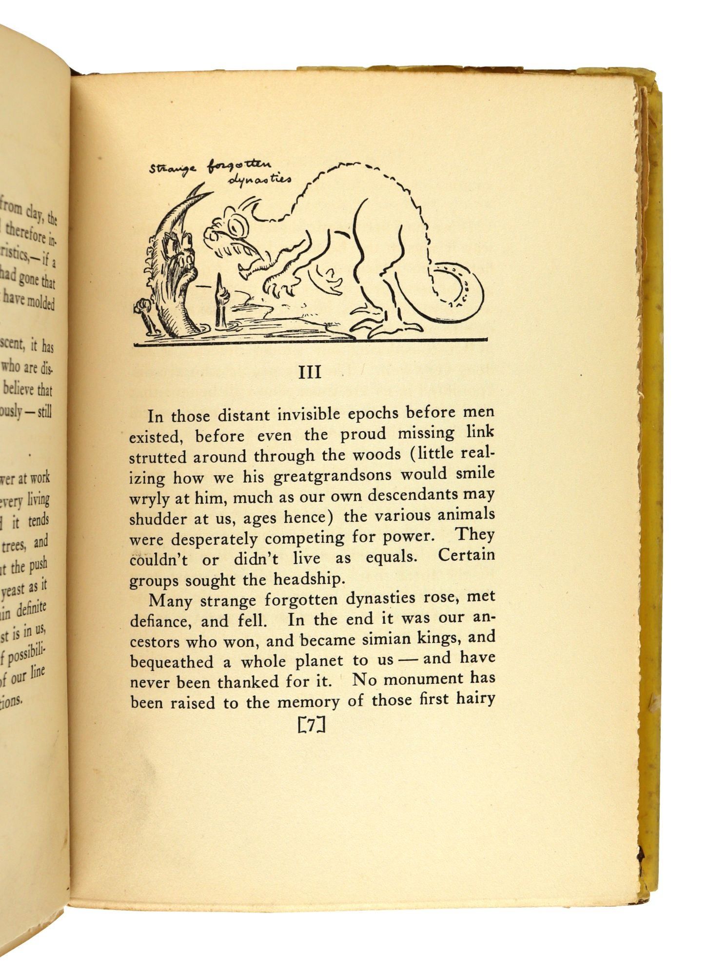 Comic examination of human achievement as seen through the lens of alternative evolution--such as a civilization built by elephants or ants or cats. Portions of this work first appeared in The Metropolitan Magazine where Day was a member of the literary staff.