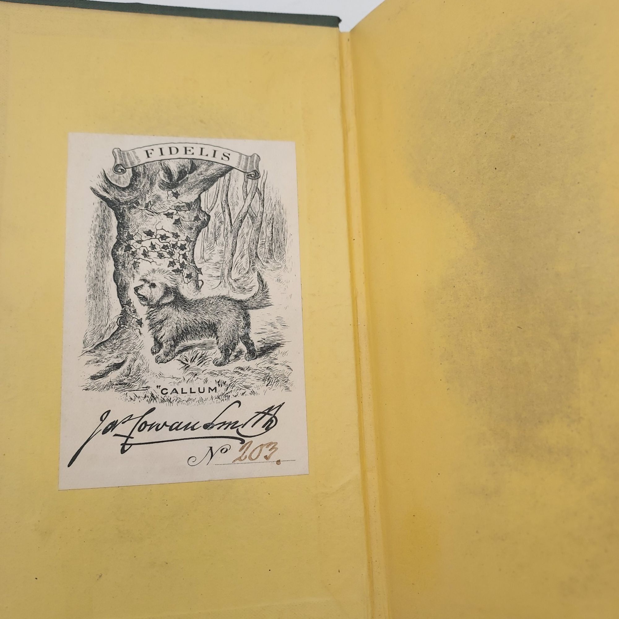 Ex-libris James Cowan Smith, with his bookplate (depicting his beloved dog Callum) on the front pastedown. James Cowan Smith (1843-1919) was a British civil engineer, director of a railway company (British Wagon), and philanthropist. In his will, he bequeathed what would now amount to roughly $4,284,000 to the National Gallery of Scotland to be used to expand its collection. The one stipulation was that the portrait of his dog Callum by John Emms was to be on permanent display in the museum. The condition of the donation helped draw attention to Callum's rare terrier breed, the Dandie Dinmont.