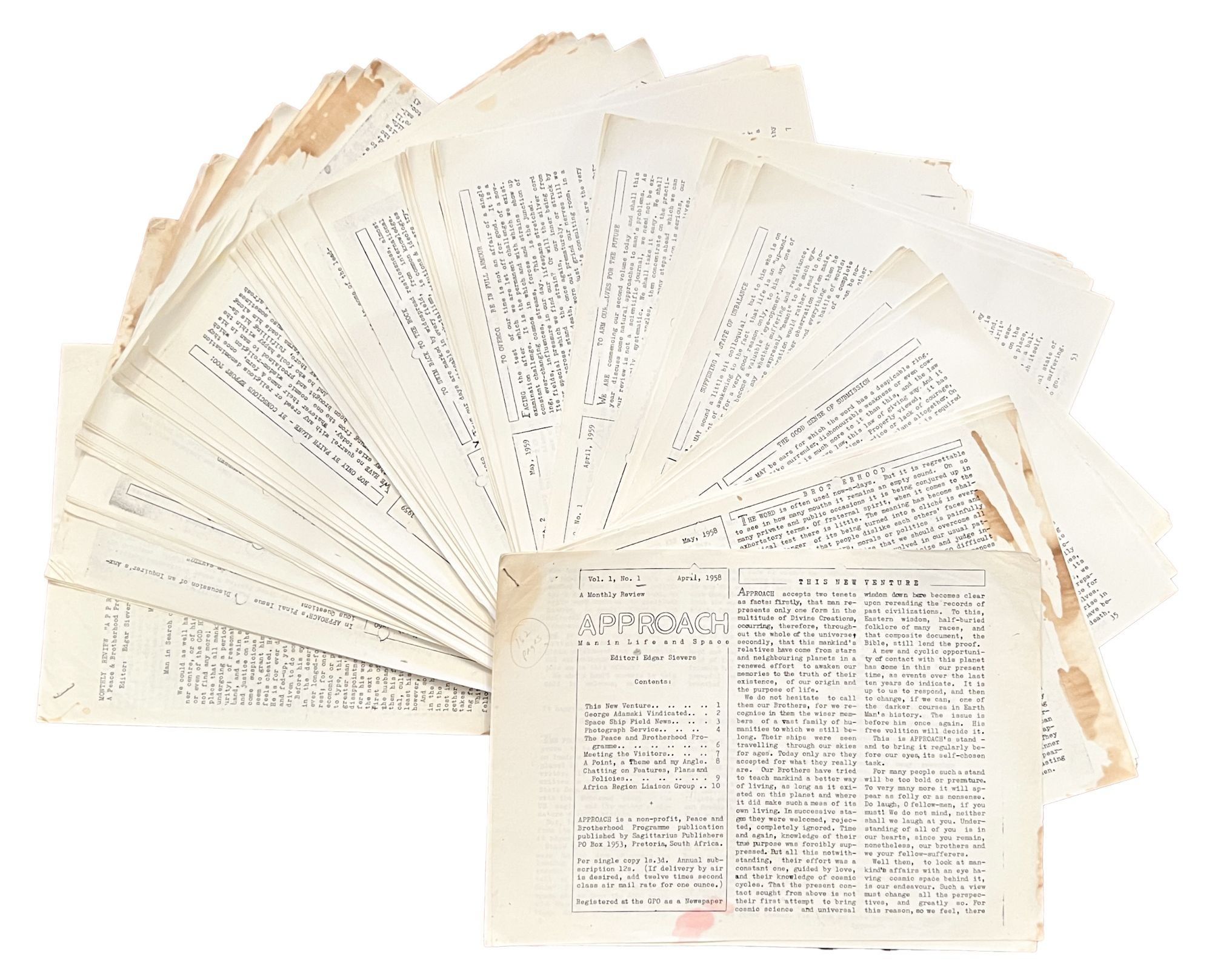 Pretoria: Sagittarius Publishers, 1960. First Edition. Newsletter. Good. Twenty-seven issues: twenty-four volumes and three additional supplements ("A New Year's Message," "Man in Life and Space," and "George Adamski's World Lecture Tour"). Generally Good. Apparent photocopies, brown and red stains to many of the issues, all with a fair amount of shelf and handling wear, some manuscript corrections and marginalia. A proto-New Age publication with two tenets: "that man represents only one form in the multitude of Divine Creation," and that "mankind's relatives have come from stars and neighbouring planets in a renewed effort to awaken our memories of the truth of their existence." Featured are articles by and about George Adamski and his Space Brothers, Lobsang Rampa, African UFO sightings, government conspiracies, and other related ufological topics. From the collection of ufologist Tom Benson. [Eberhart 9375].