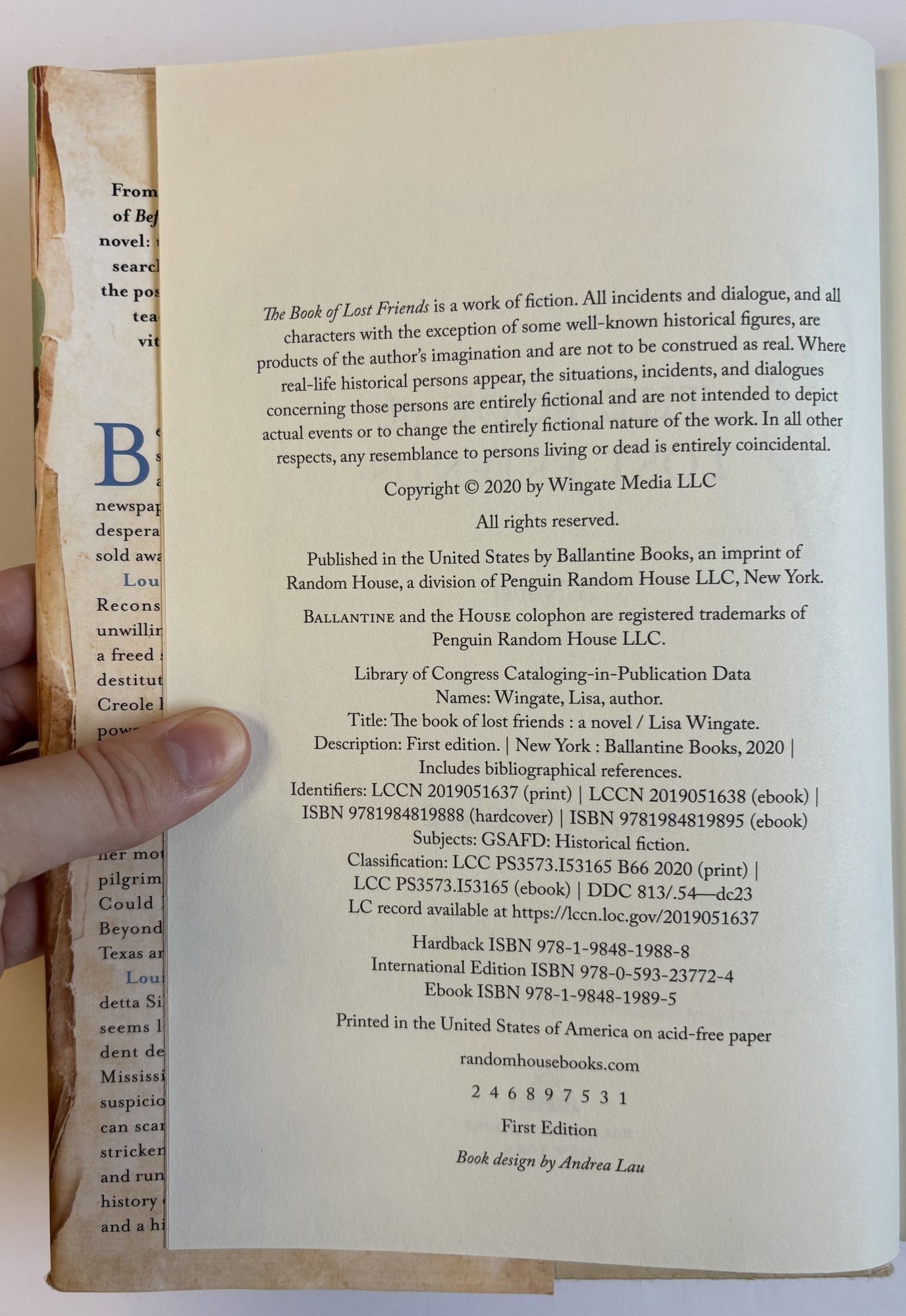 New York: Ballantine Books, 2020. First Edition, First Printing. Hardcover. Octavo, 388 pages. In Very Good minus condition with a Very Good dust jacket. Spine tan with black and red lettering. Dust jacket protected with mylar covering, price uncut: "$28.00". Minor scuffing to edges of text block. Mild staining to boards. Small dog-ear crease to page 5. Signed by Wingate on publisher's tipped-in page. Shelved Hardcover Fiction. 1401349. Shelved Dupont Bookstore.