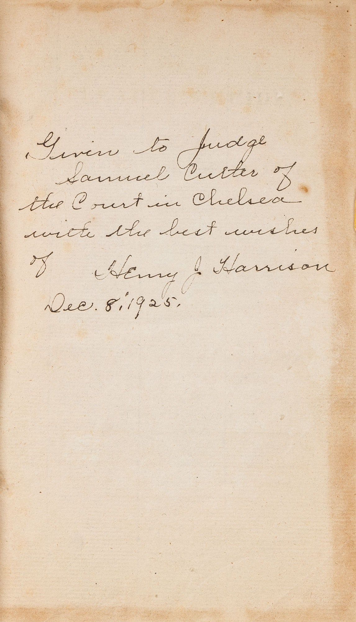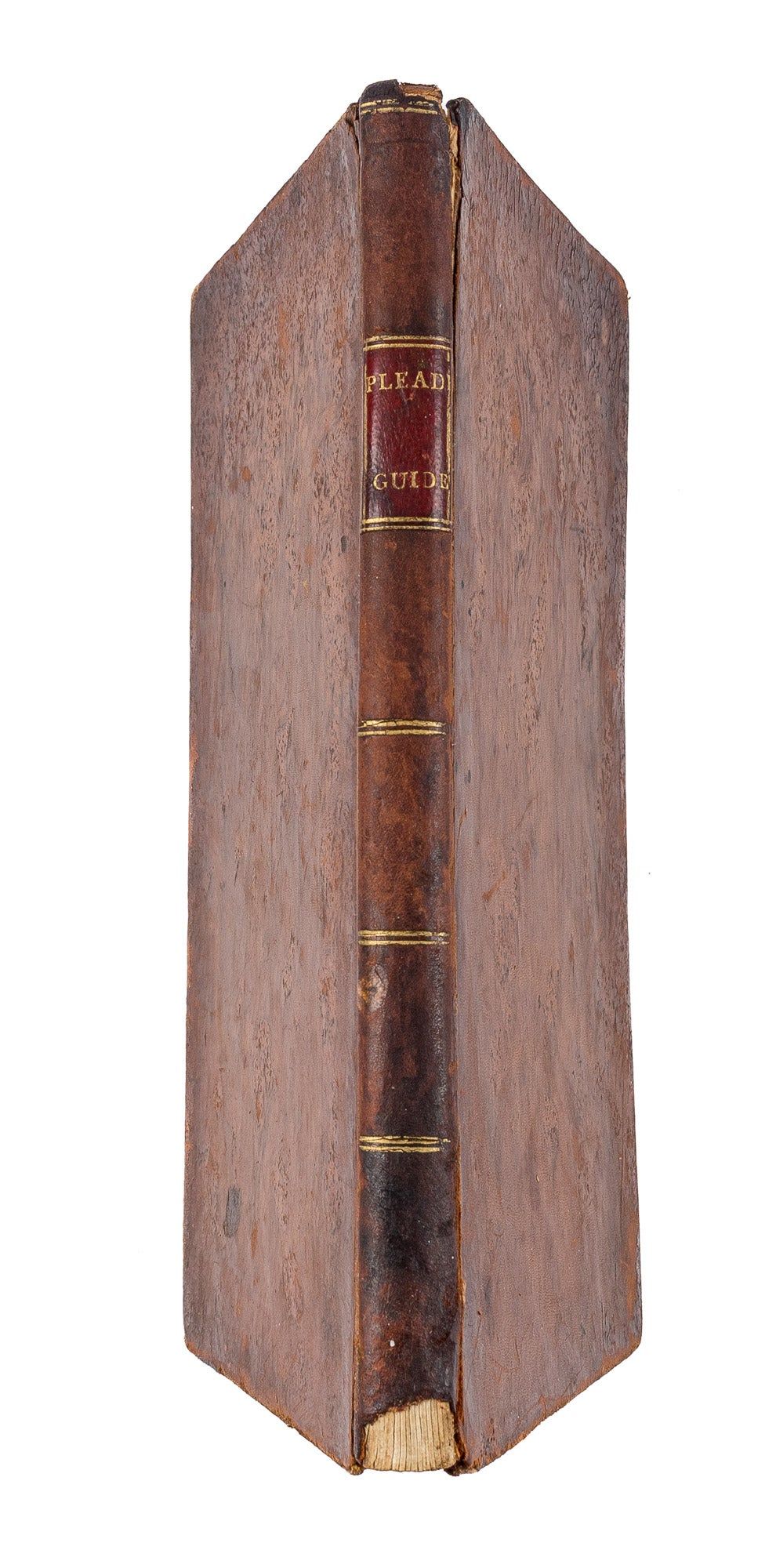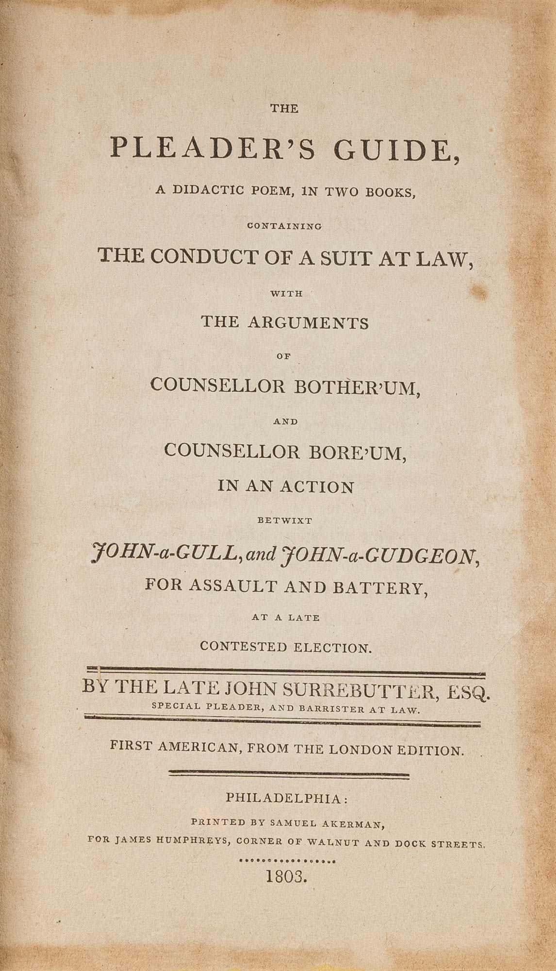 1803. Copy of the First American Edition of a Classic Legal Satire with an Interesting Massachusetts Provenance [Anstey, John (bap. 1757, d. 1819)]. The Pleader's Guide, A Didactic Poem, In Two Books, Containing the Conduct of a Suit at Law, With the Arguments of Counsellor Bother'um, And Counselor Bore'um, In an Action Betwixt John-a-Gull, And John-a-Gudgeon, For Assault and Battery, At a Late Contested Election. By the Late John Surrebutter, Esq. Special Pleader, and Barrister at Law. Philadelphia: Printed by Samuel Akerman, For James Humphreys, 1803. Two parts in one volume, each with title page. 70; 81, [1] pp. Octavo (8-1/2" x 5"; 21.5 x 12.5 cm). Contemporary tree calf, gilt fillets and lettering piece to spine. Light rubbing to boards, moderate rubbing and faint gatoring to extremities, chipping to spine ends, joints starting at ends, corners lightly bumped and worn, faint offsetting and light foxing to endleaves, later presentation inscription, from Henry J. Harrison to Samuel Cutler, dated 1935, to front endleaf. Moderate toning to interior, occasional light foxing. A very good copy. $350. * First American edition. The law of procedure and pleading gave rise to a certain amount of humorous and satirical literature. First issued in London in 1796, The Pleader's Guide is among the finest examples. Holdsworth, who discusses it at length, is among the many scholars, jurists and other readers who hold it in high regard. The first part satirizes the procedural quirks of common and civil lawyers. The second part deals with pleading and the conduct of cases in court. Anstey, an English poet and barrister of Lincoln's Inn, was the son of Christopher Anstey [c.1757-1819], one of the greatest satirical poets of the eighteenth century.. The later inscriber and recipient were residents of Chelsea, Massachusetts. Samuel Cutler [1866-1936] was the presiding judge of Chelsea District Court. A search of historical records locates a Henry Jervis Harrison [1873-1940] who was a police lieutenant there. Holdsworth, History of English Law XIII:460-463. Cohen, Bibliography of Early American Law 5147.