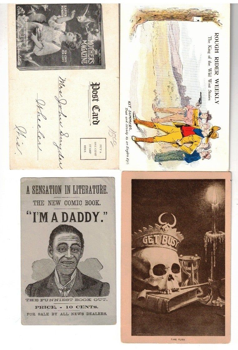The collection as a whole uses deltiology to explore the first half of the 20th century through a unique cultural eye. Postcards, although that name was not established, first began circulation during the era of the Civil War, when the United States government transitioned from the stampless covers type of mail, to letters enclosed in envelopes with revenue stamps sold to mail them. Thus plain penny postcards were created.