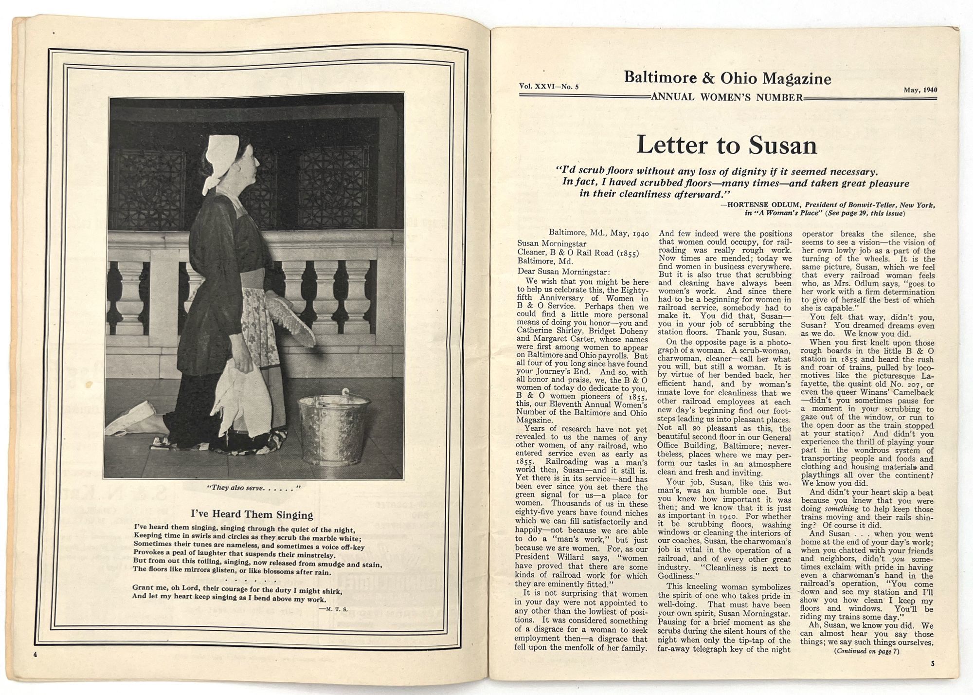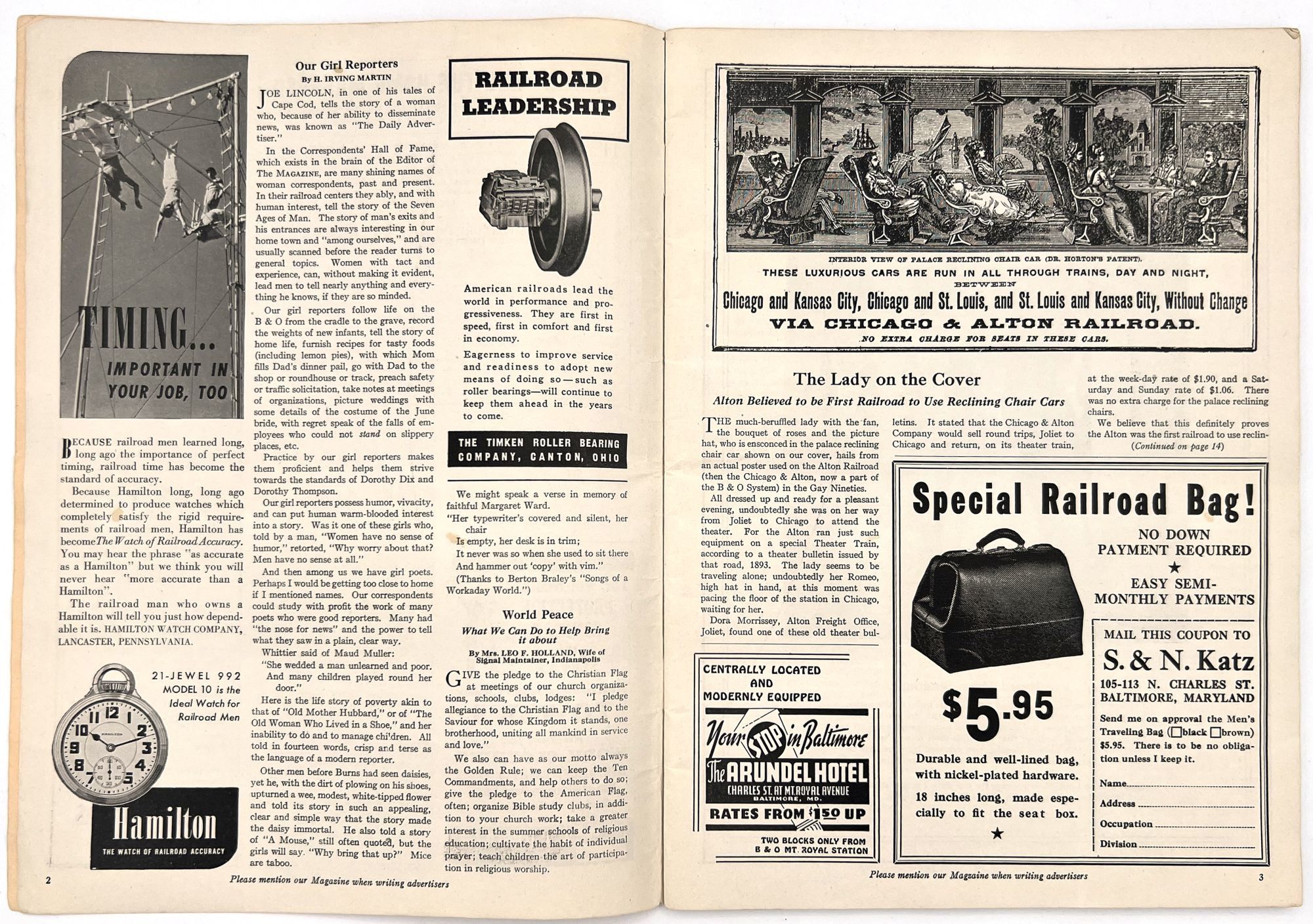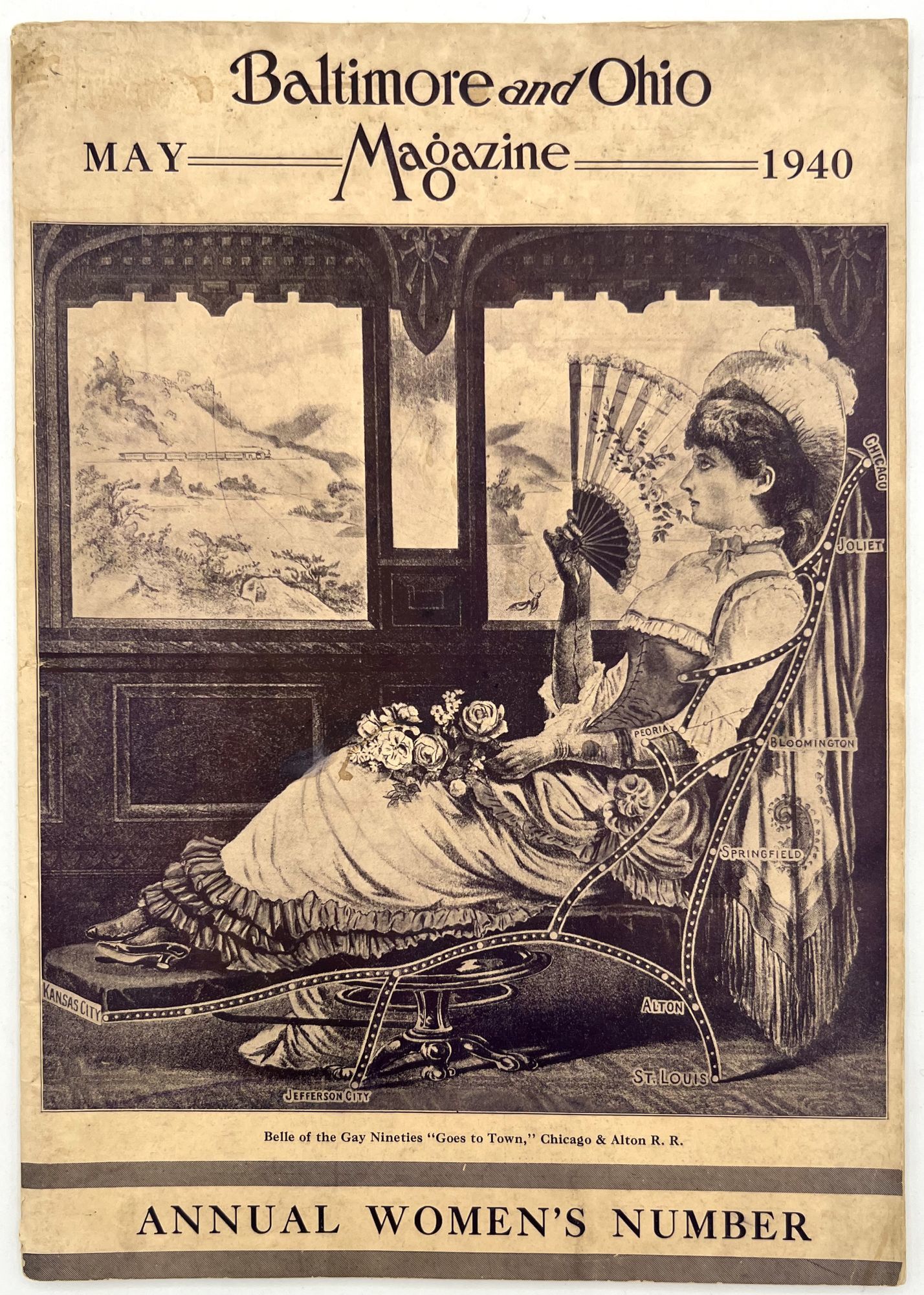 Baltimore, Maryland: The Baltimore and Ohio Railroad Company, 1940. Good to very good. Dust soiling, wear, a couple short tears.. The May 1940 issue of the Baltimore & Ohio Magazine Annual Women's Number, published by The Baltimore and Ohio Railroad Company, celebrating 85 years of "Women in B&O Service" (p.5). The women's issue of the Magazine was published for the women who worked for the B and O Railroad Company, with the aim of relating company news and bolstering morale and efficiency. Content includes: a financial report (inside upper cover); an explanation of the upper cover illustration (p.3); "Letter to Susan", an ode to early women workers in the company; histories of various first ladies of states including Maryland, New Jersey, Indiana, and more (beginning p.8); poetry (p.30); a feature on actress Fanny Kemble (p.36); a small section of content for children (p.38); an article on stuttering in children (p.43); an article about "Women in War-- and Peace" (p.44); an article on how the U.S. Dept. of Agriculture helps women (p.53); a brief word on the prevalence of cancer (p. 88); and much more. Includes photo illustrations and line drawings throughout related to the content. From the p.5 "Letter to Susan": "Years of research have not yet revealed to us the names of any other women, of any railroad, who entered service even as early as 1855. Railroading was a man's world then, Susan--and it still is. Yet there is in its service ... a place for women. Thousands of us in these eighty-five years have found niches which we can fill satisfactorily and happily--not because we are able to do a 'man's work', but just because we are women" (p.5). Single vol. (11" by 8"), pp. 88, illus., in original illus. wrps. Features a clever cover design, showing an 1890's woman reclining on an iron railcar chair, with the outline of the chair doubling as a map of the railroad's route map including stops at Kansas City, Jefferson City, St. Louis, Alton, Peoria, Joliet, Chicago, and Springfield.
