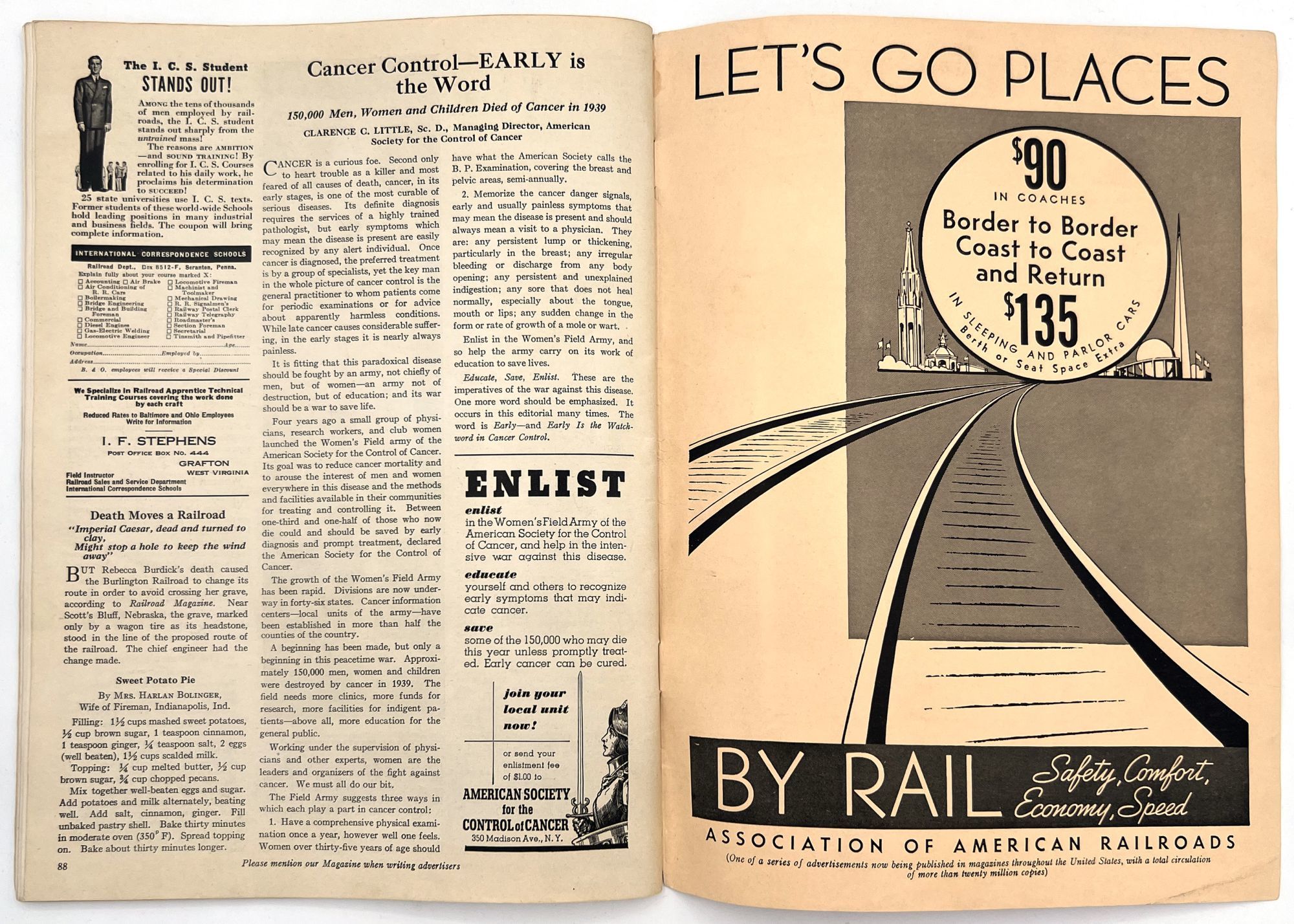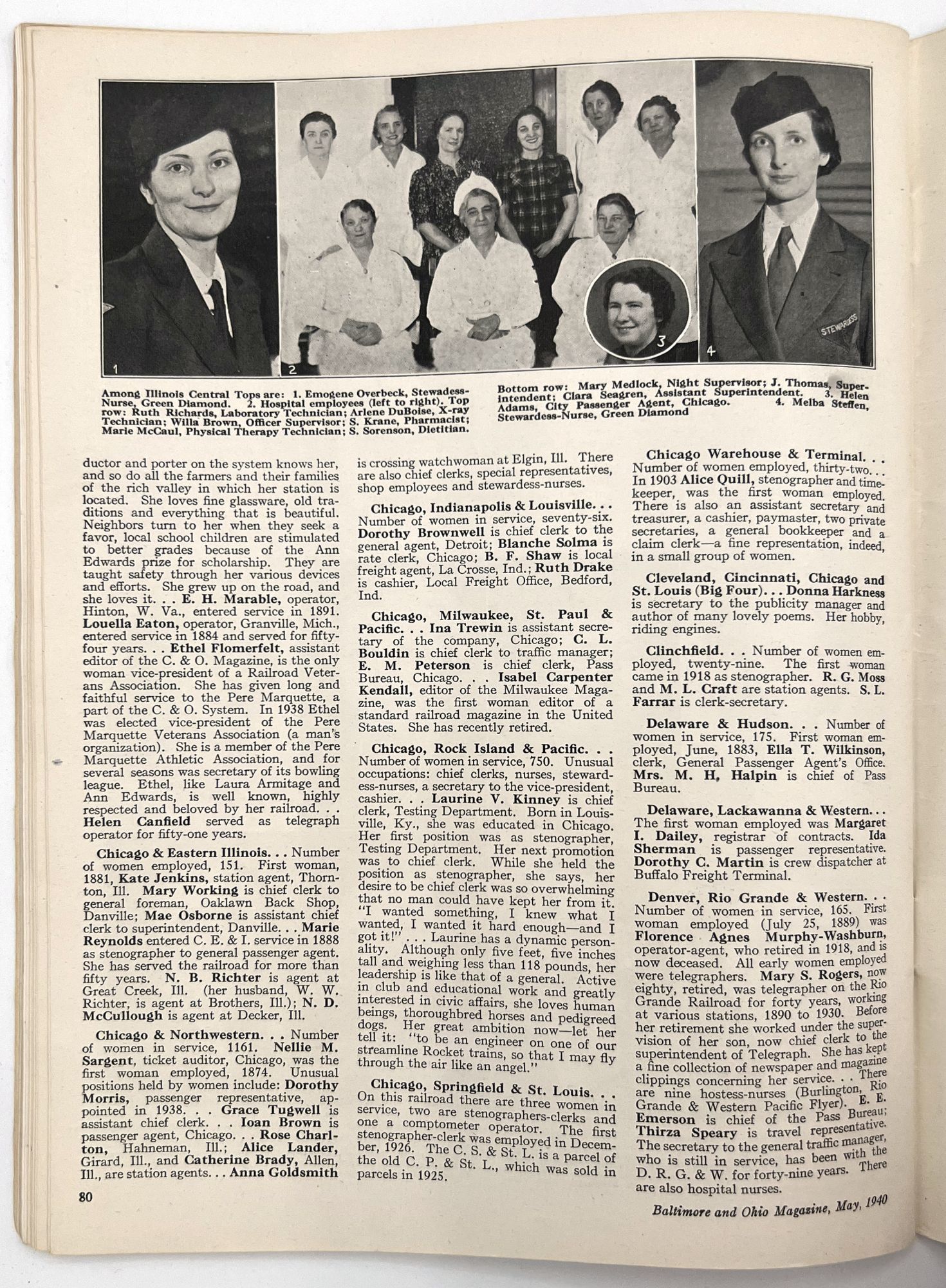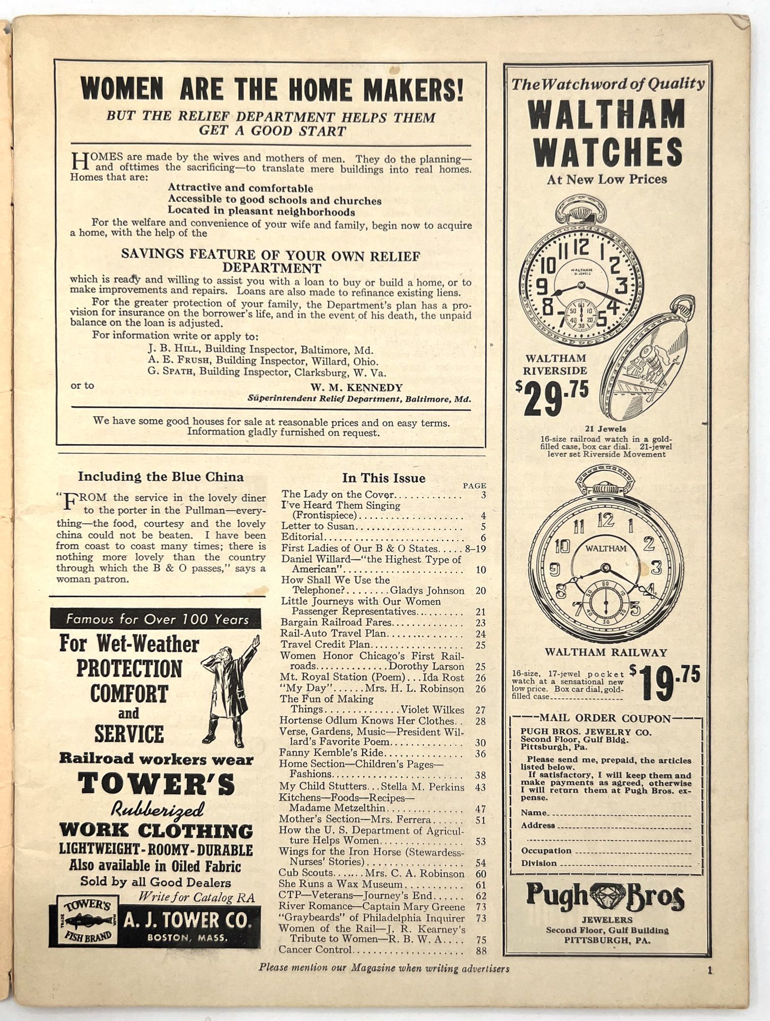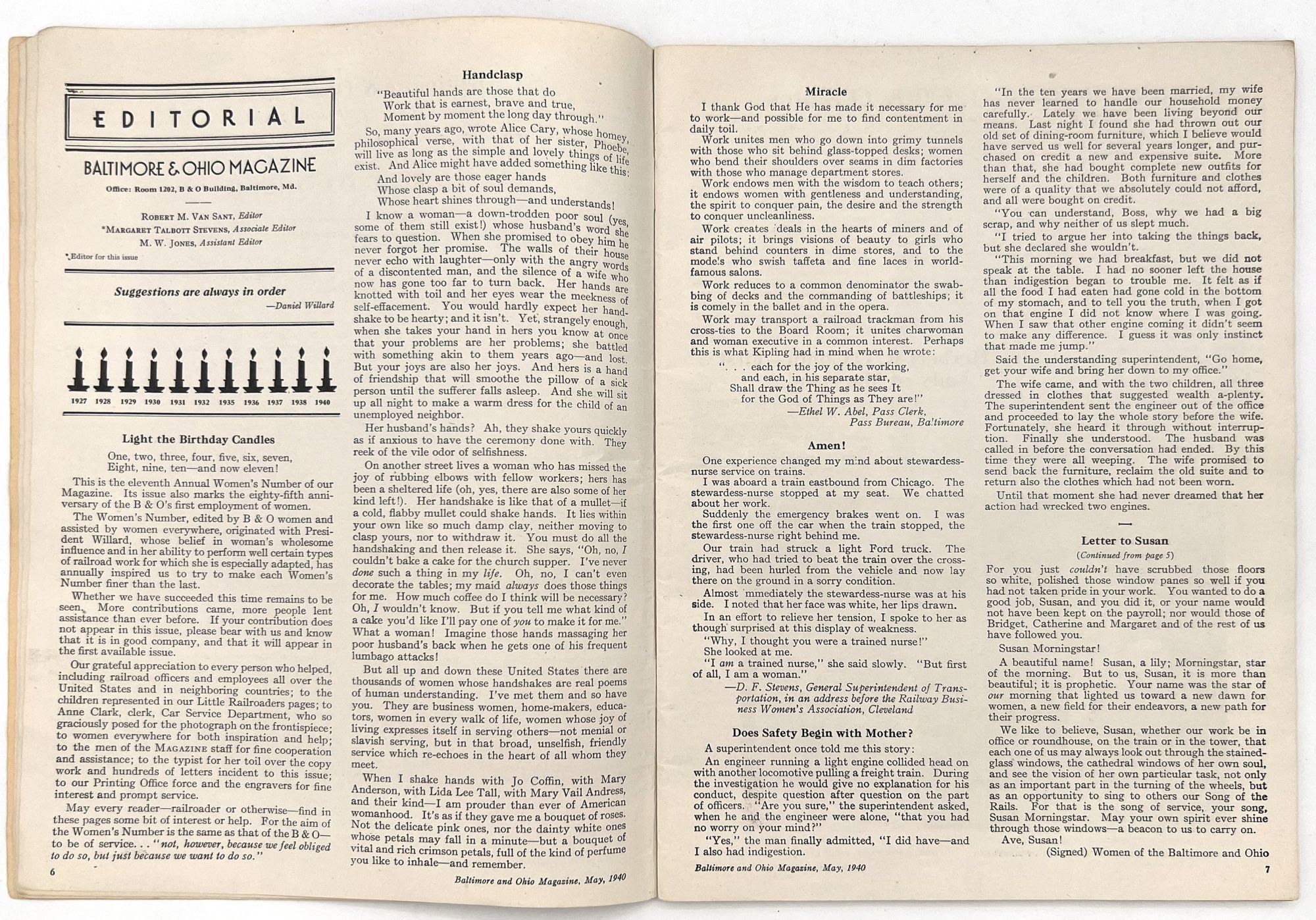 Baltimore, Maryland: The Baltimore and Ohio Railroad Company, 1940. Good to very good. Dust soiling, wear, a couple short tears.. The May 1940 issue of the Baltimore & Ohio Magazine Annual Women's Number, published by The Baltimore and Ohio Railroad Company, celebrating 85 years of "Women in B&O Service" (p.5). The women's issue of the Magazine was published for the women who worked for the B and O Railroad Company, with the aim of relating company news and bolstering morale and efficiency. Content includes: a financial report (inside upper cover); an explanation of the upper cover illustration (p.3); "Letter to Susan", an ode to early women workers in the company; histories of various first ladies of states including Maryland, New Jersey, Indiana, and more (beginning p.8); poetry (p.30); a feature on actress Fanny Kemble (p.36); a small section of content for children (p.38); an article on stuttering in children (p.43); an article about "Women in War-- and Peace" (p.44); an article on how the U.S. Dept. of Agriculture helps women (p.53); a brief word on the prevalence of cancer (p. 88); and much more. Includes photo illustrations and line drawings throughout related to the content. From the p.5 "Letter to Susan": "Years of research have not yet revealed to us the names of any other women, of any railroad, who entered service even as early as 1855. Railroading was a man's world then, Susan--and it still is. Yet there is in its service ... a place for women. Thousands of us in these eighty-five years have found niches which we can fill satisfactorily and happily--not because we are able to do a 'man's work', but just because we are women" (p.5). Single vol. (11" by 8"), pp. 88, illus., in original illus. wrps. Features a clever cover design, showing an 1890's woman reclining on an iron railcar chair, with the outline of the chair doubling as a map of the railroad's route map including stops at Kansas City, Jefferson City, St. Louis, Alton, Peoria, Joliet, Chicago, and Springfield.