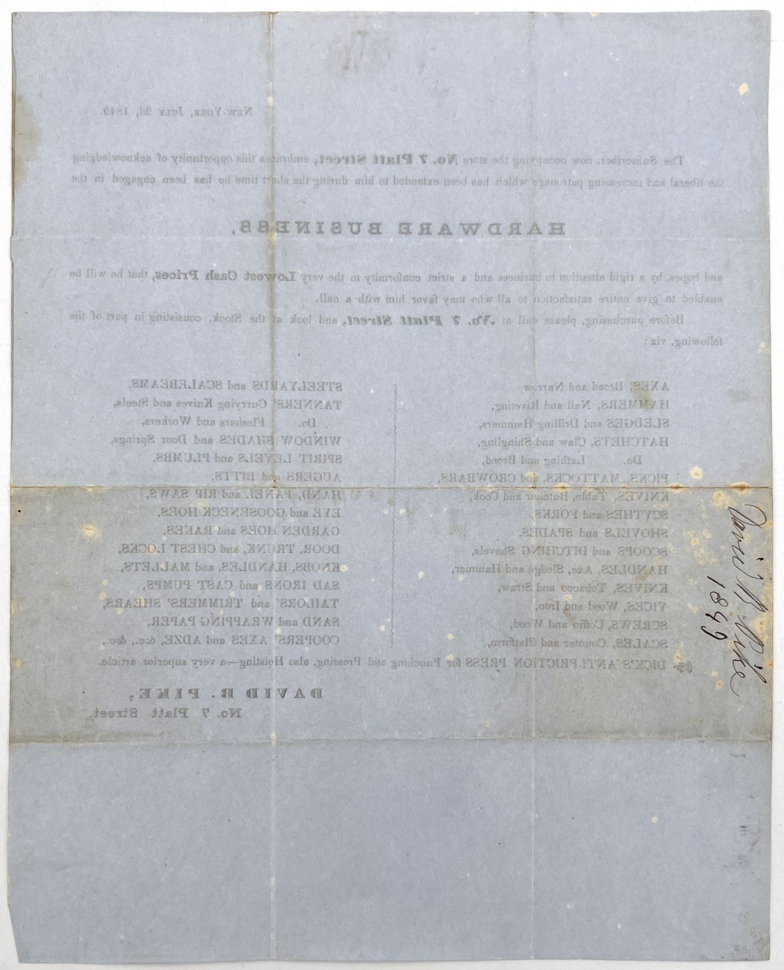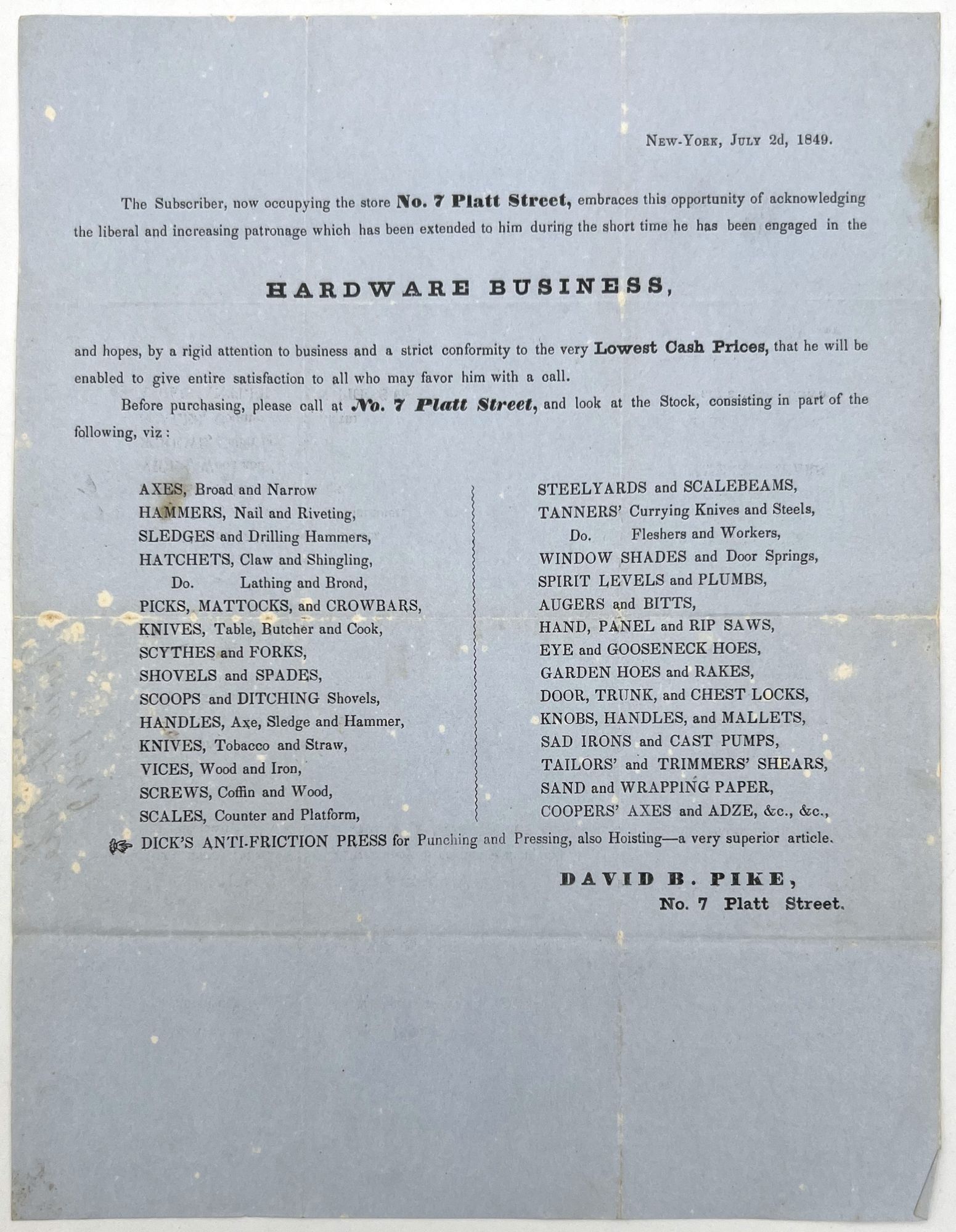 New York, New York: David B. Pike, 1849. Very good. Letter folds, spotting/light discoloration in places.. Printed flyer from July 1849 advertising a new hardware business located in lower Manhattan, selling everything from axes, hammers, hatchets, knives and vices to window shades, tanners' tools, locks, wrapping paper and counter scales. Also promotes "Dick's Anti-Friction Press for Punching and Pressing, also Hoisting-- a very superior article". Includes the name of the proprietor at the foot, David B. Pike. Today, 7 Platt Street has been transformed into a massive luxury residential skyscraper, leaving little evidence behind of the hardware store mentioned in this flyer. An important reminder of New York's ever-changing, palimpsest-like history and landscape.