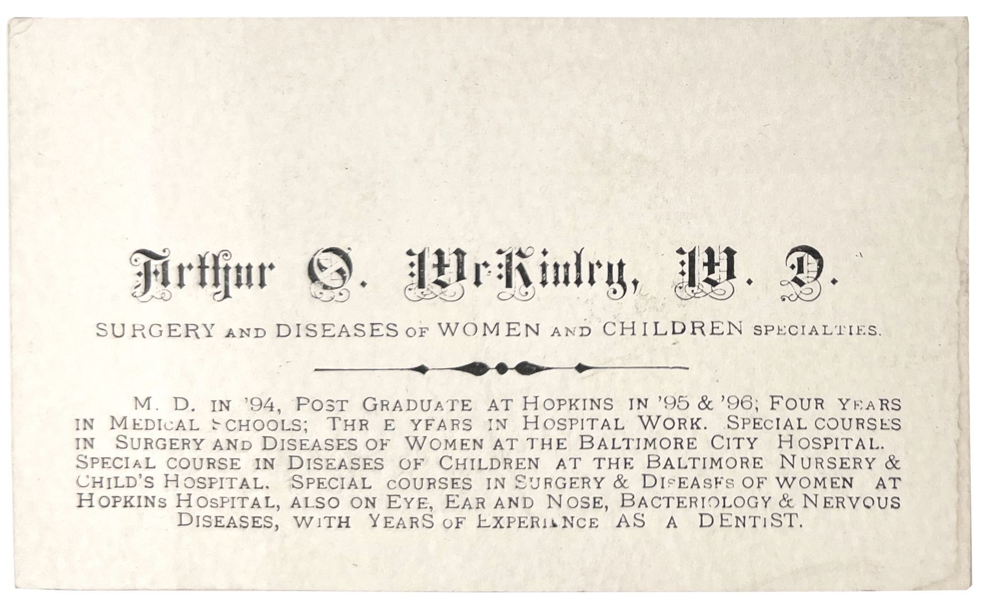 1900. Good to very good. A little dust soiling.. Lithographed business card of Arthur O. McKinley, M.D., a doctor specializing in "Surgery and Diseases of Women and Children". Interesting to see how pediatrics and gynecology were related here. Includes the following information about the doctor's qualifications: "M.D. in '94, Post Graduate at Hopkins in '95 & '96; Four Years in Medical Schools; Three Years in Hospital Work. Special Courses in Surgery and Diseases of Women at the Baltimore City Hospital. Special Course in Diseases of Children at the Baltimore Nursery & Child's Hospital. Special Courses in Surgery & Diseases of Women at Hopkins Hospital, also on Eye, Ear and Nose, Bacteriology & Nervous Diseases, with Years of Experience as a Dentist". Measures approx. 2.5" by 4.25