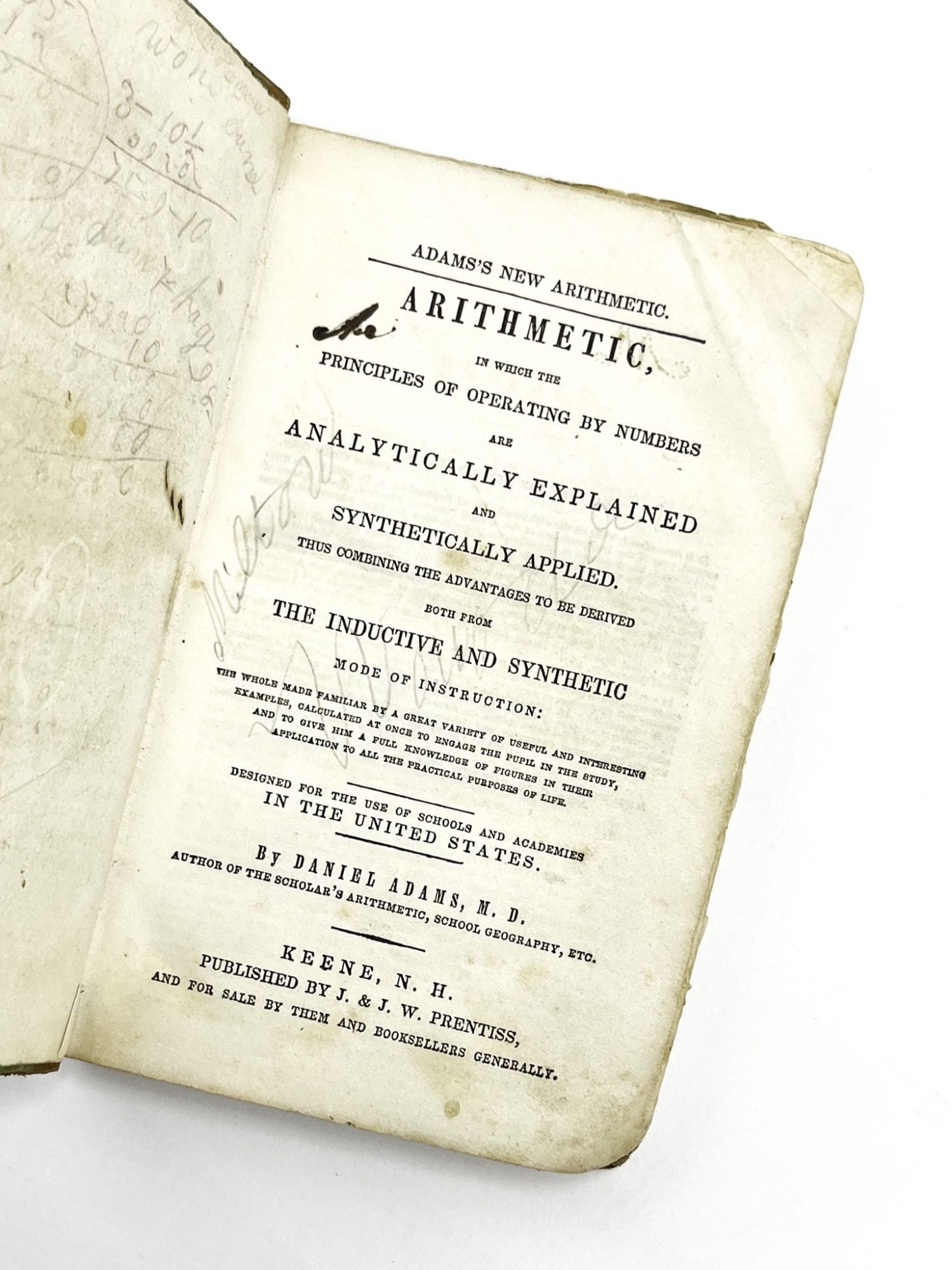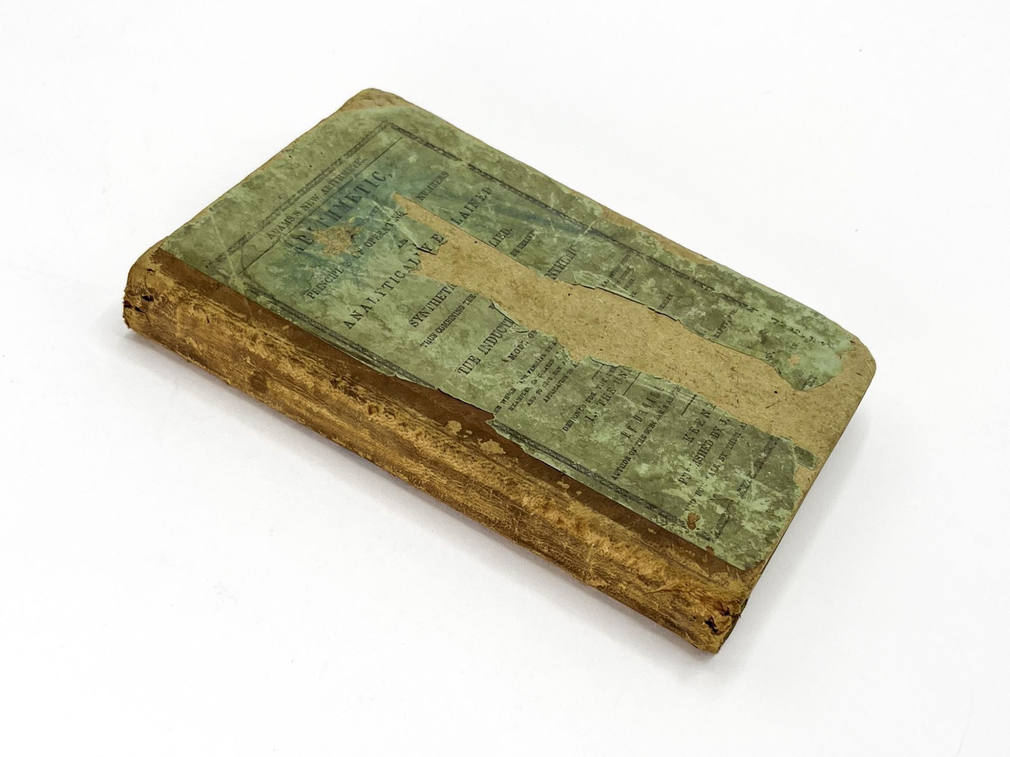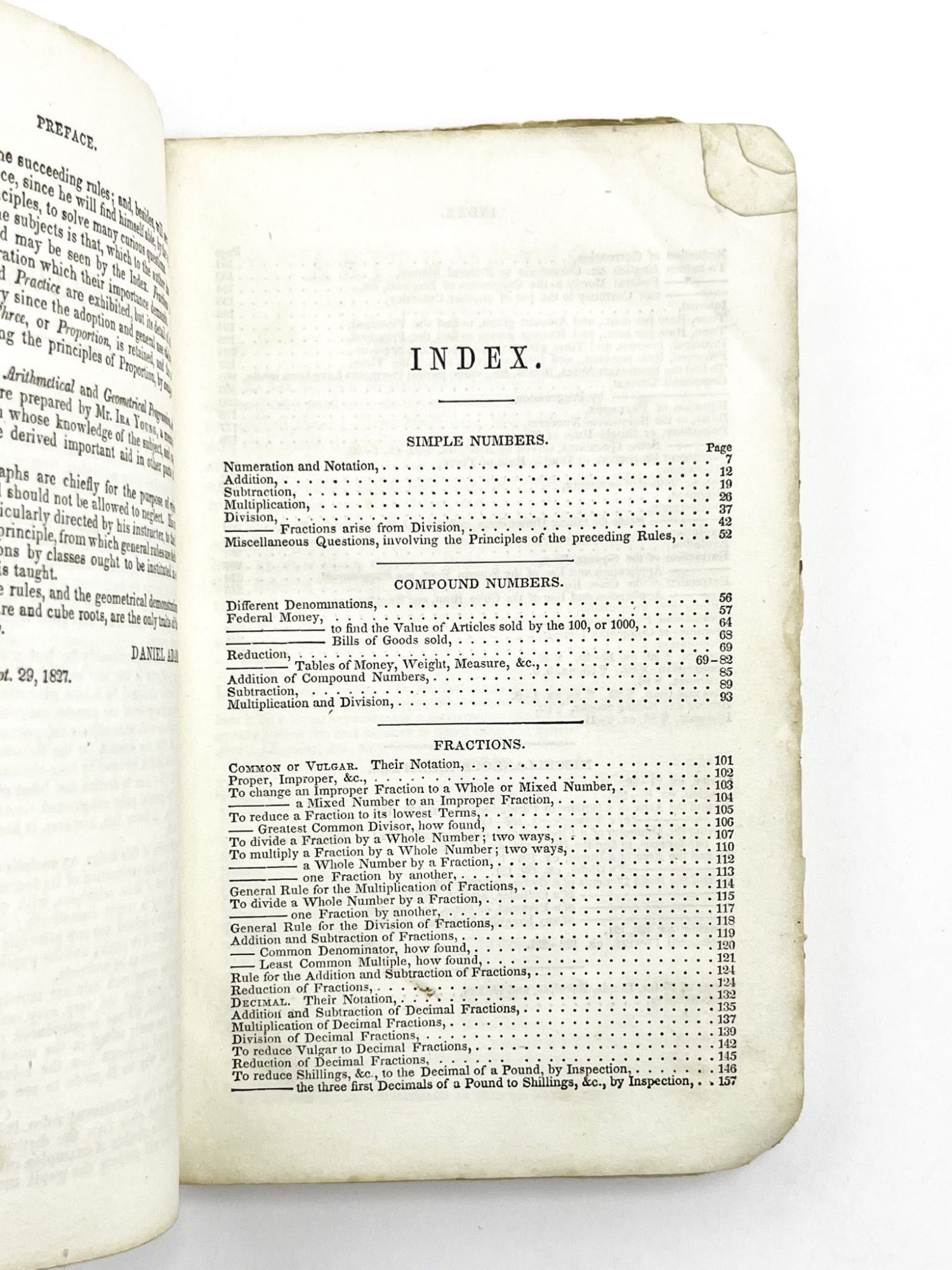 New Hampshire: J. & J. W. Prentiss, 1827. First printing. Very good minus.. First edition of this late Regency arithmetic textbook for American schools — by the author of THE SCHOLAR'S ARITHMETIC, one of the era's most popular mathematical textbooks. 4.5" x 6.75" Original brown quarter calf with green typographically printed paper boards. 264 pages. Previous owner names/notes to endpapers. Rubbing to spine, large abrasion with some paper loss to front board, some chipping and bumping to corners. A bit of foxing and soiling to textblock, several leaves with a bit of loss to bottom edge. A touch fragile, but firm.