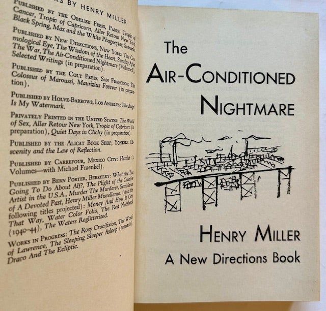 New York: New Directions, 1945. Cloth. Very Good/Very Good. A solid, presentable copy of the 1945 1st edition. Tight and VG (very light offsetting along the pastedowns and the inner hinges) in a crisp, price-clipped, VG dustjacket, with ,ild soiling to the panels and a touch of wear at the spien ends. Octavo, Henry Miller's dystopian masterpiece about his bitter impressions --from an ex-pat's perspective-- of America at the end of World War II.