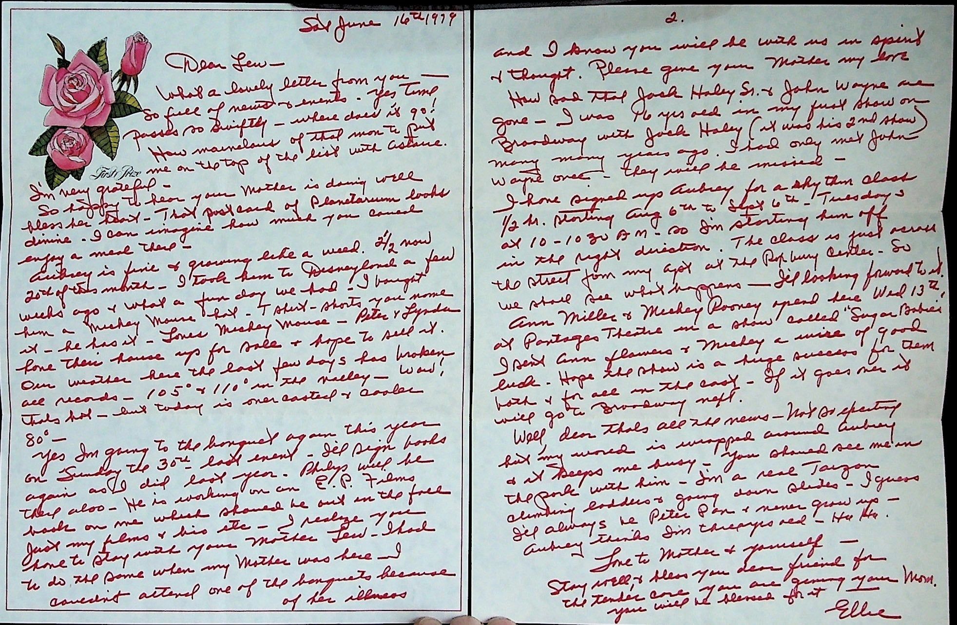 * Two page letter written in red ink in 1979 to Lew Young in Victoria British Columbia from her home in Beverly Hills. It is a chatty letter about taking Aubrey to Disneyland; saying that she is going to the banquet this year to sign books; sending her love to his mother and lamenting the loss of Jack Haley Sr. and John Wayne; more about Aubrey; and seeing Ann Miller and Mickey Rooney at teh Pontages theater. She signs the letter "Ellie."