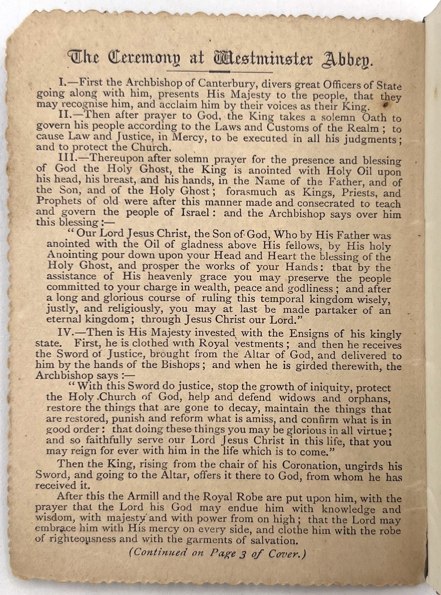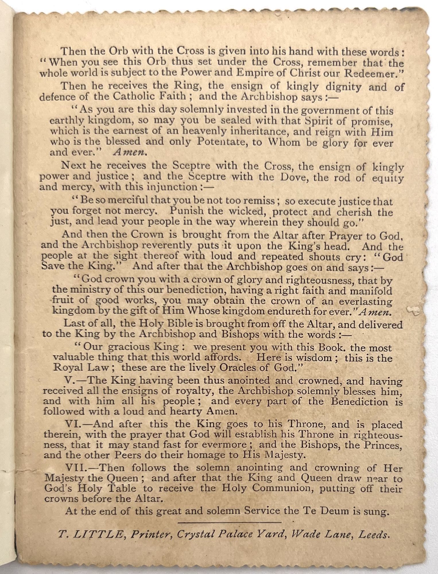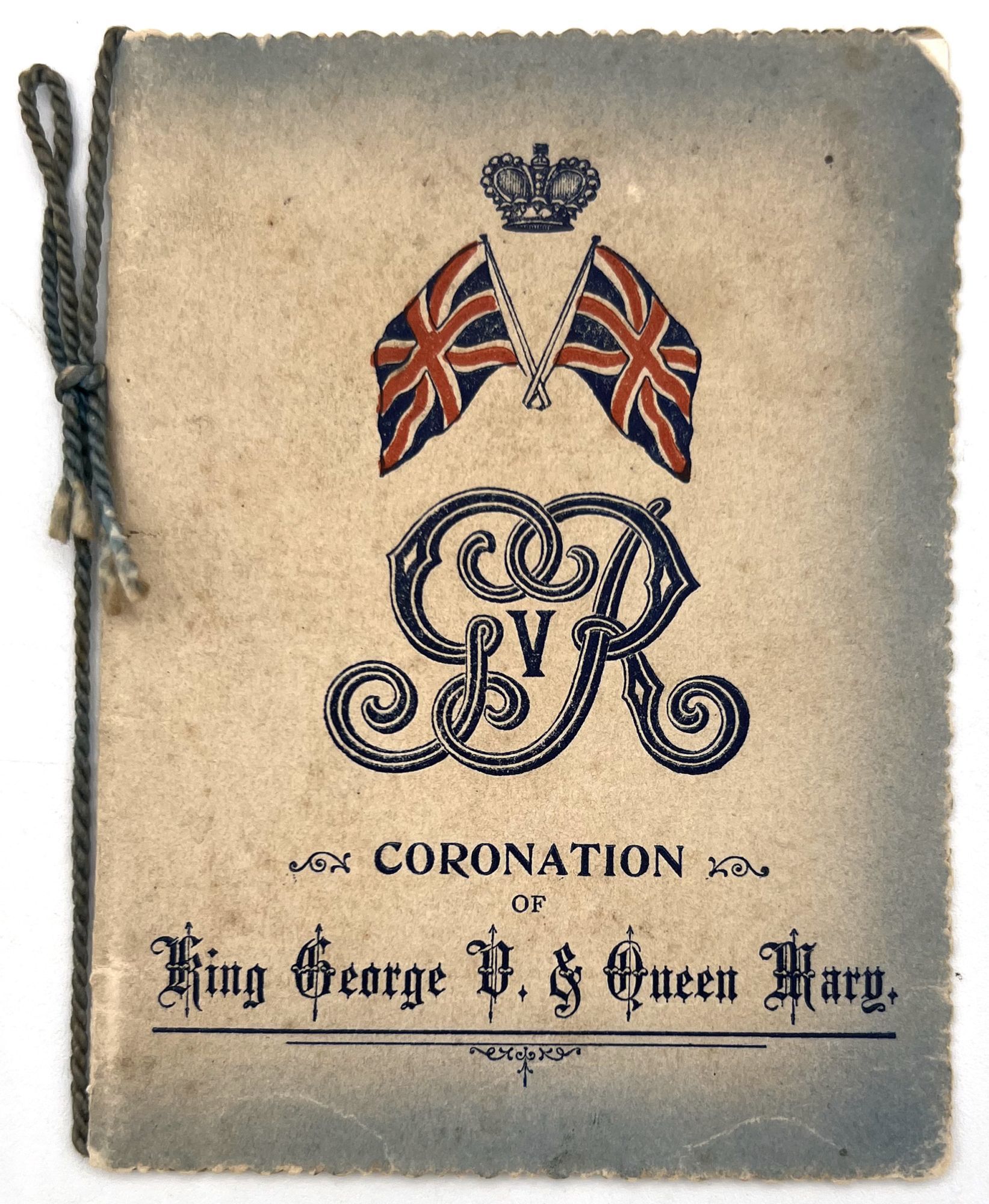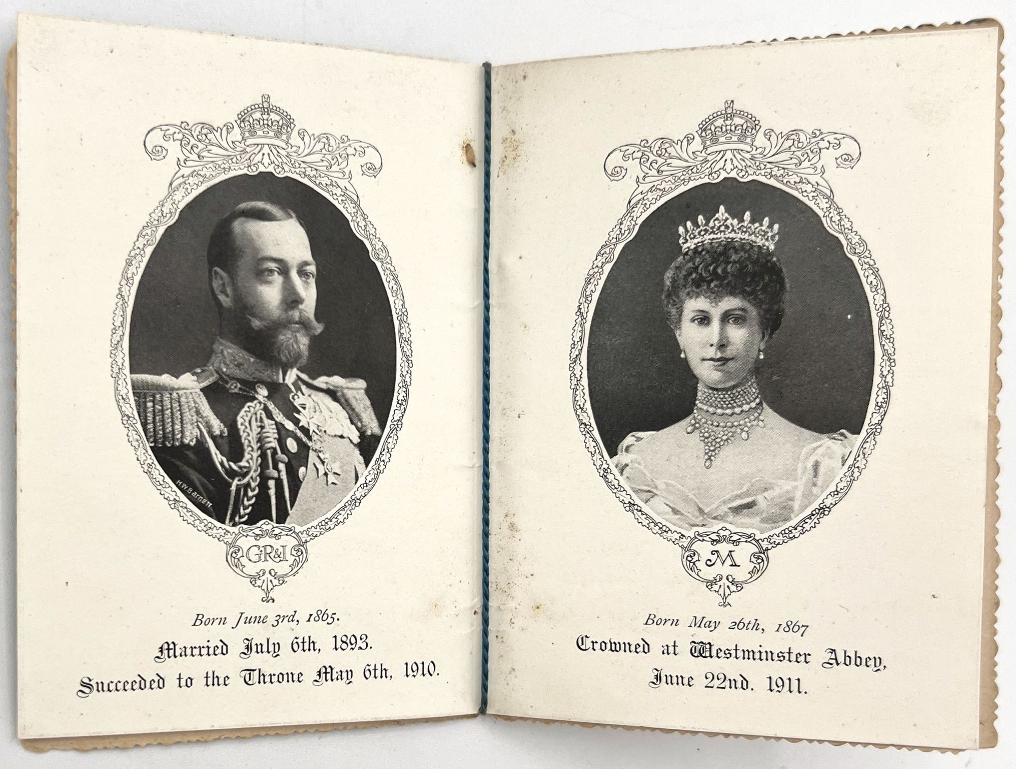 Leeds: T. Little, Printer, 1911. Good. Dust soiling, a couple short tears.. An attractive souvenir booklet produced for the coronation of King George V and Queen Mary, crowned in 1910 and 1911, respectively. Such booklets and trinkets would have been proudly sold to the public as a way of celebrating the start of the new king's reign. Inside are two portraits of the monarchs with their birth dates, date of marriage, and the days they were crowned at Westminster Abbey. On the inside of both covers is a printed order of events, explaining the ceremony to the public. Single vol. (4.5" by 3.25"), pp. [4], illus., in original illus. wrps, secured at left by blue silk cord.