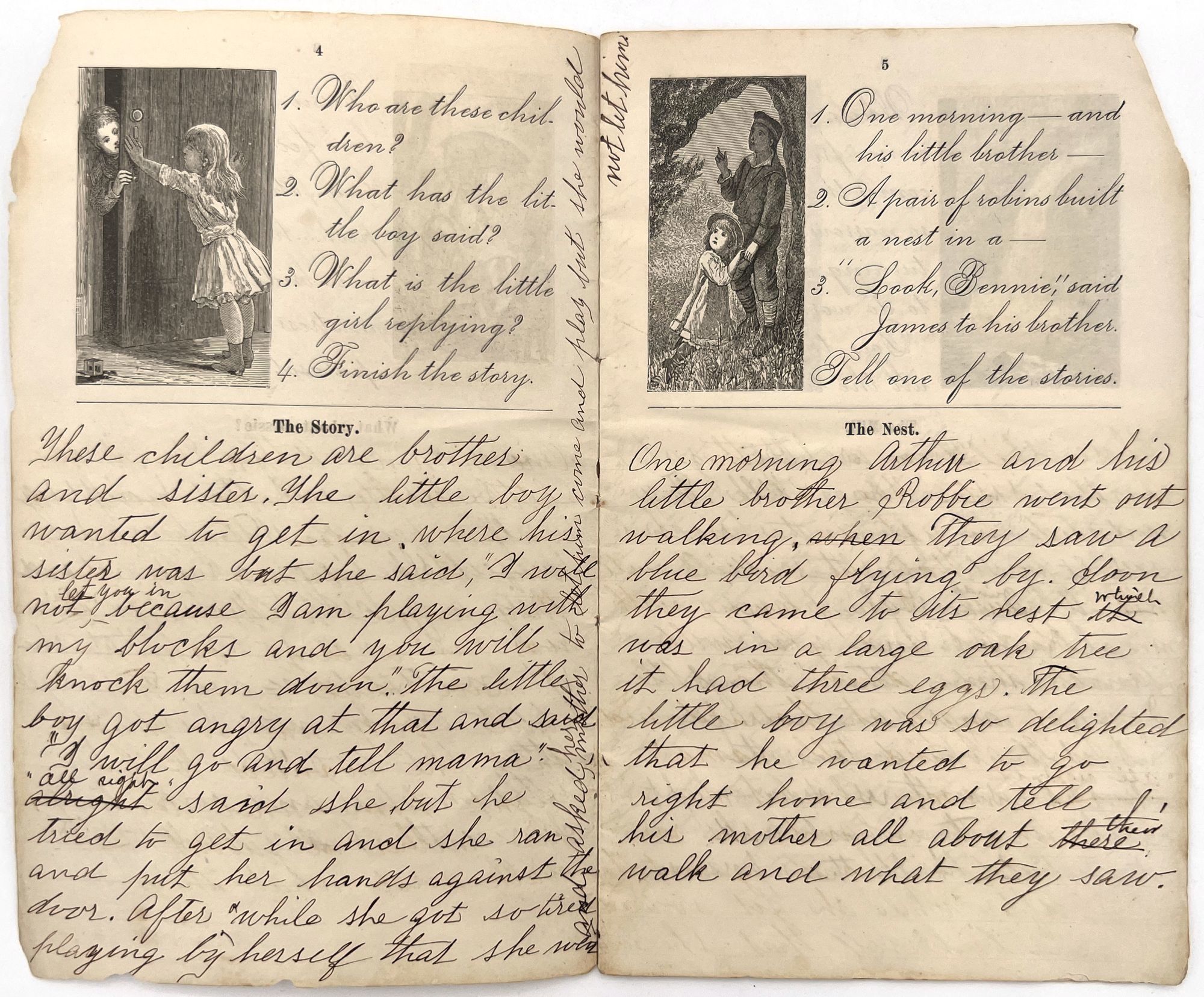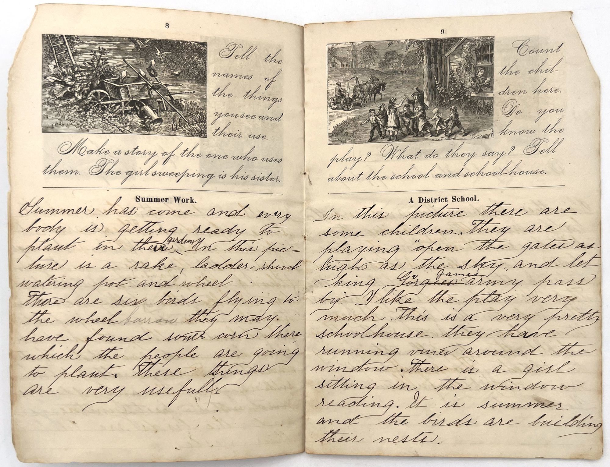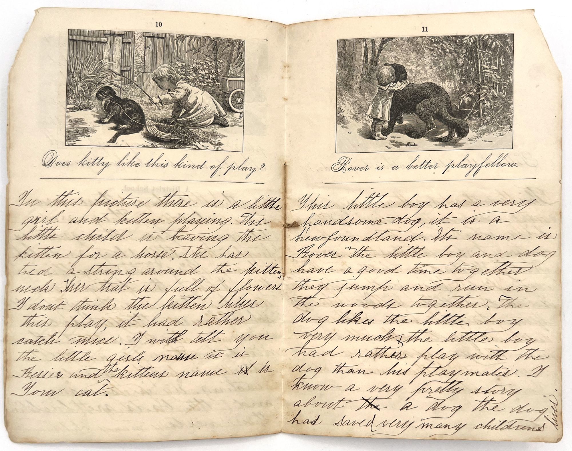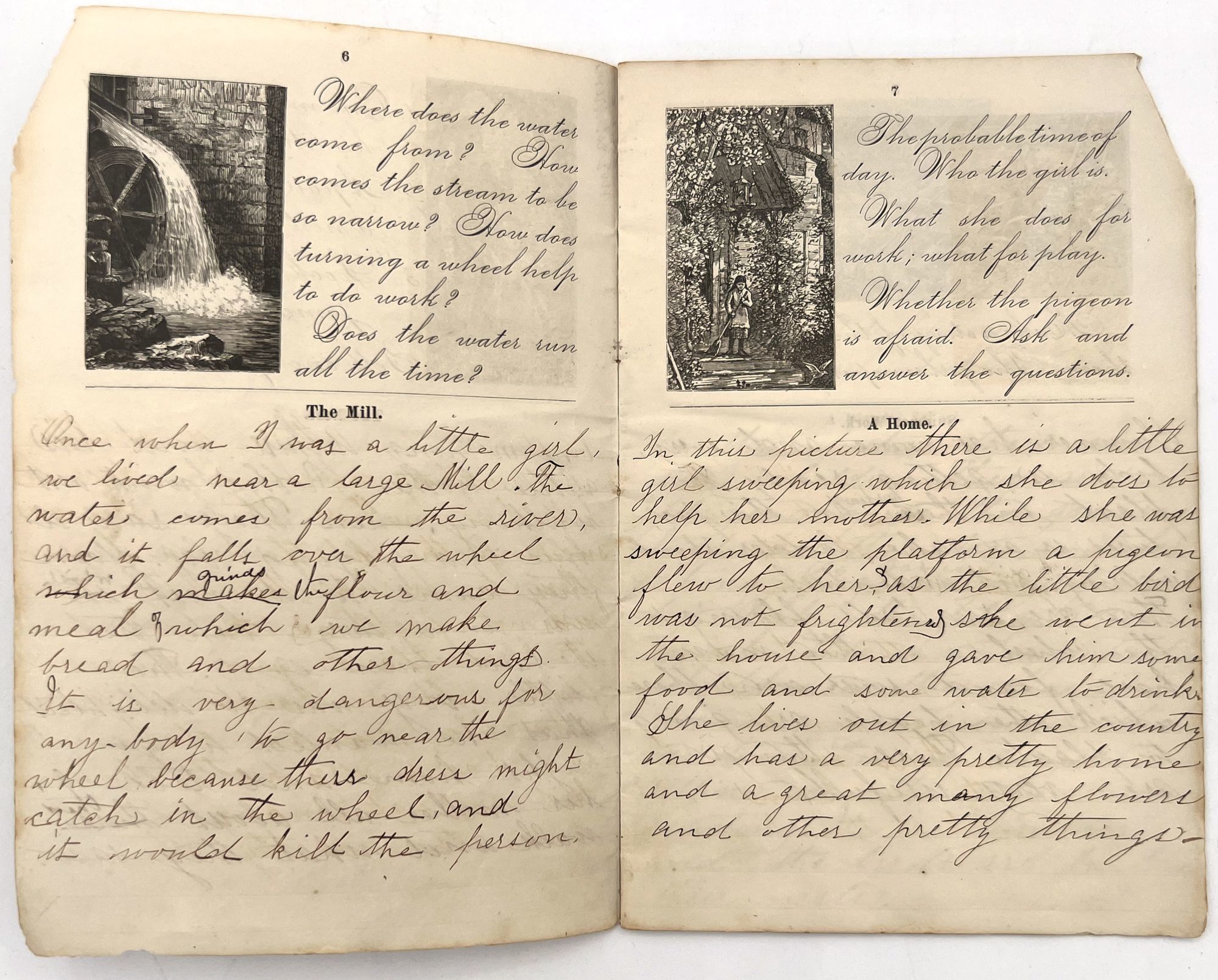 United States, 1890. Poor. Worn, lacking covers and first leaf (p.1-2).. An endearing composition book for children, this example completed on every page by a child in ink manuscript. Each page has a different prompt for the child in the form of a black and white image and either a description, a question, or other prompt. Below the child writes their response or summary. An example of the prompts: an image of a working mill with questions ("Where does the water come from? How does turning a wheel help to do work?"). Note how Victorian gender roles are taught here. Page 7 depicts a little girl sweeping the front step of a house. The answer to the prompt begins, "In this picture there is a little girl sweeping which she does to help her mother...". Single vol. (8.25" by 5.25"), pp. 3-18, illus., lacking original covers and first leaf (p.1-2).