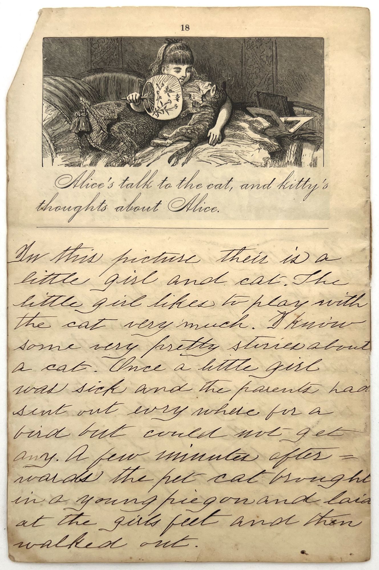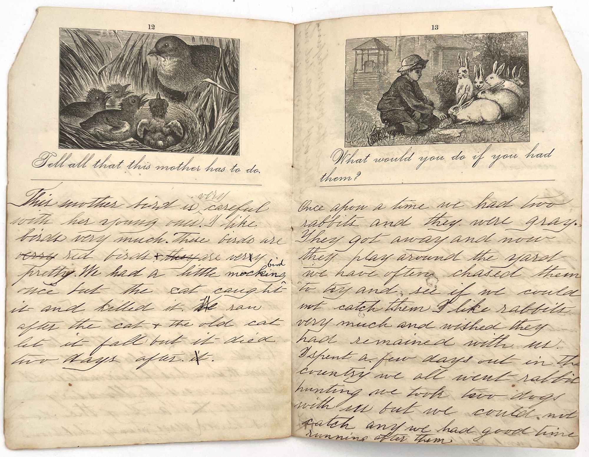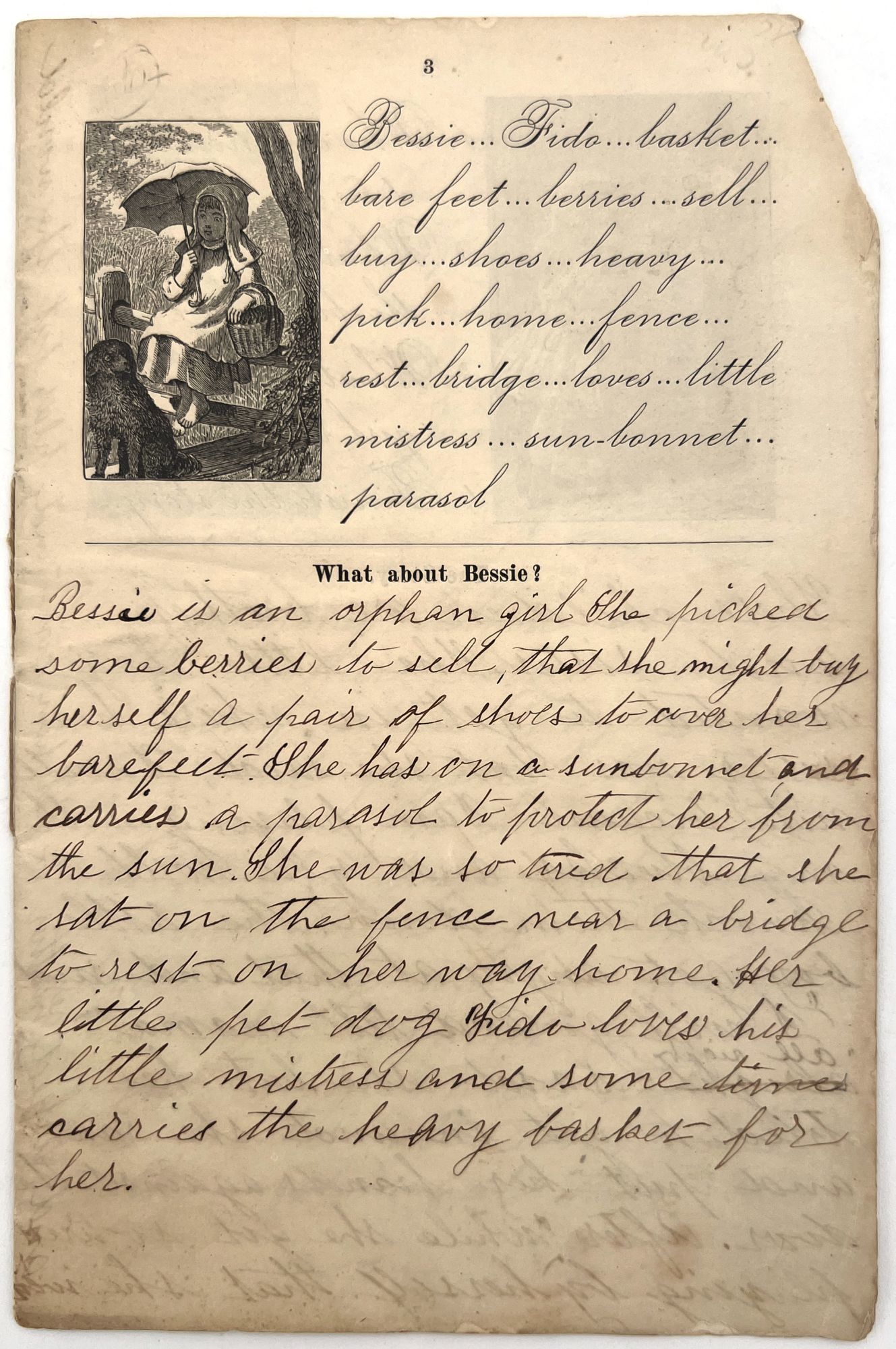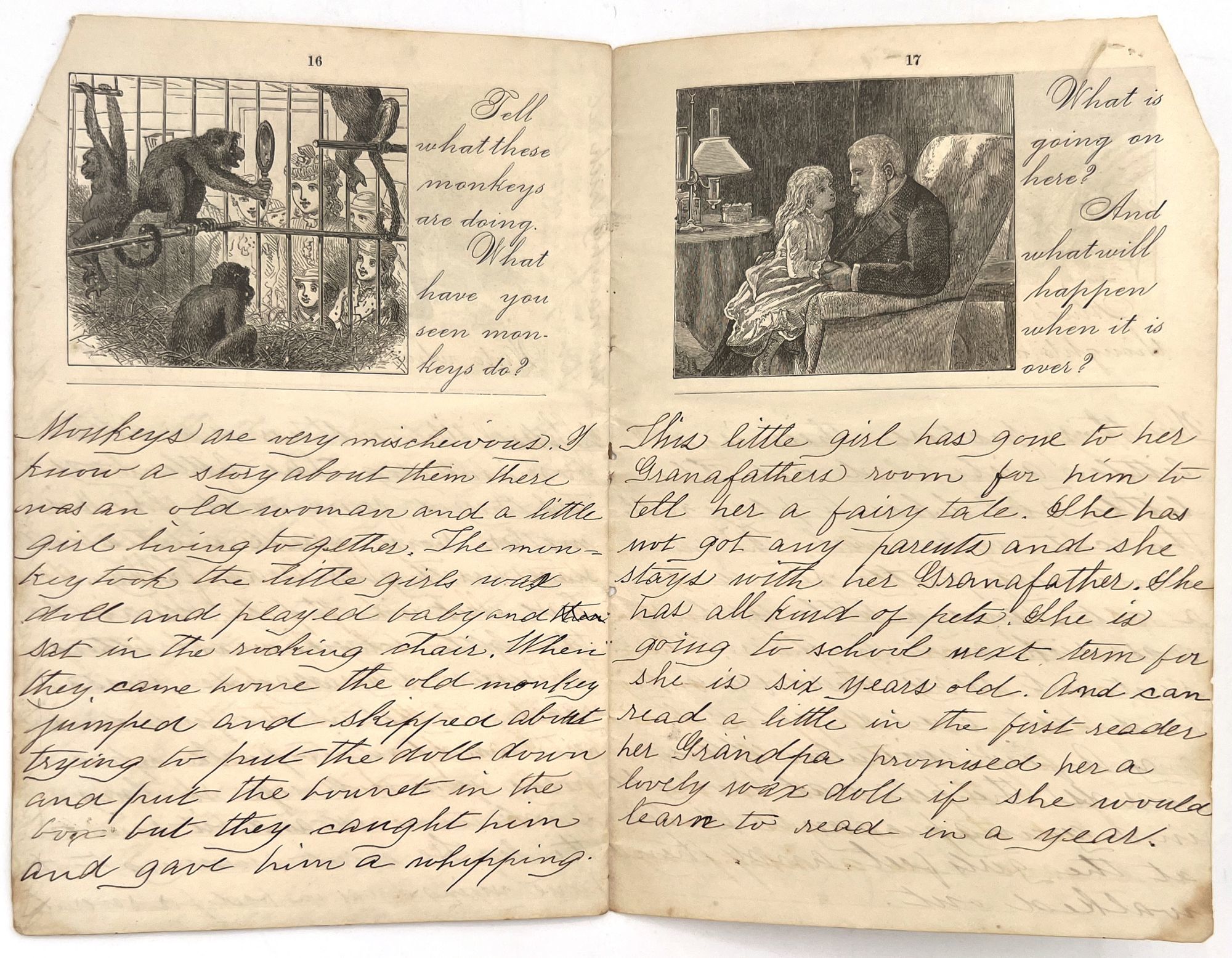 United States, 1890. Poor. Worn, lacking covers and first leaf (p.1-2).. An endearing composition book for children, this example completed on every page by a child in ink manuscript. Each page has a different prompt for the child in the form of a black and white image and either a description, a question, or other prompt. Below the child writes their response or summary. An example of the prompts: an image of a working mill with questions ("Where does the water come from? How does turning a wheel help to do work?"). Note how Victorian gender roles are taught here. Page 7 depicts a little girl sweeping the front step of a house. The answer to the prompt begins, "In this picture there is a little girl sweeping which she does to help her mother...". Single vol. (8.25" by 5.25"), pp. 3-18, illus., lacking original covers and first leaf (p.1-2).