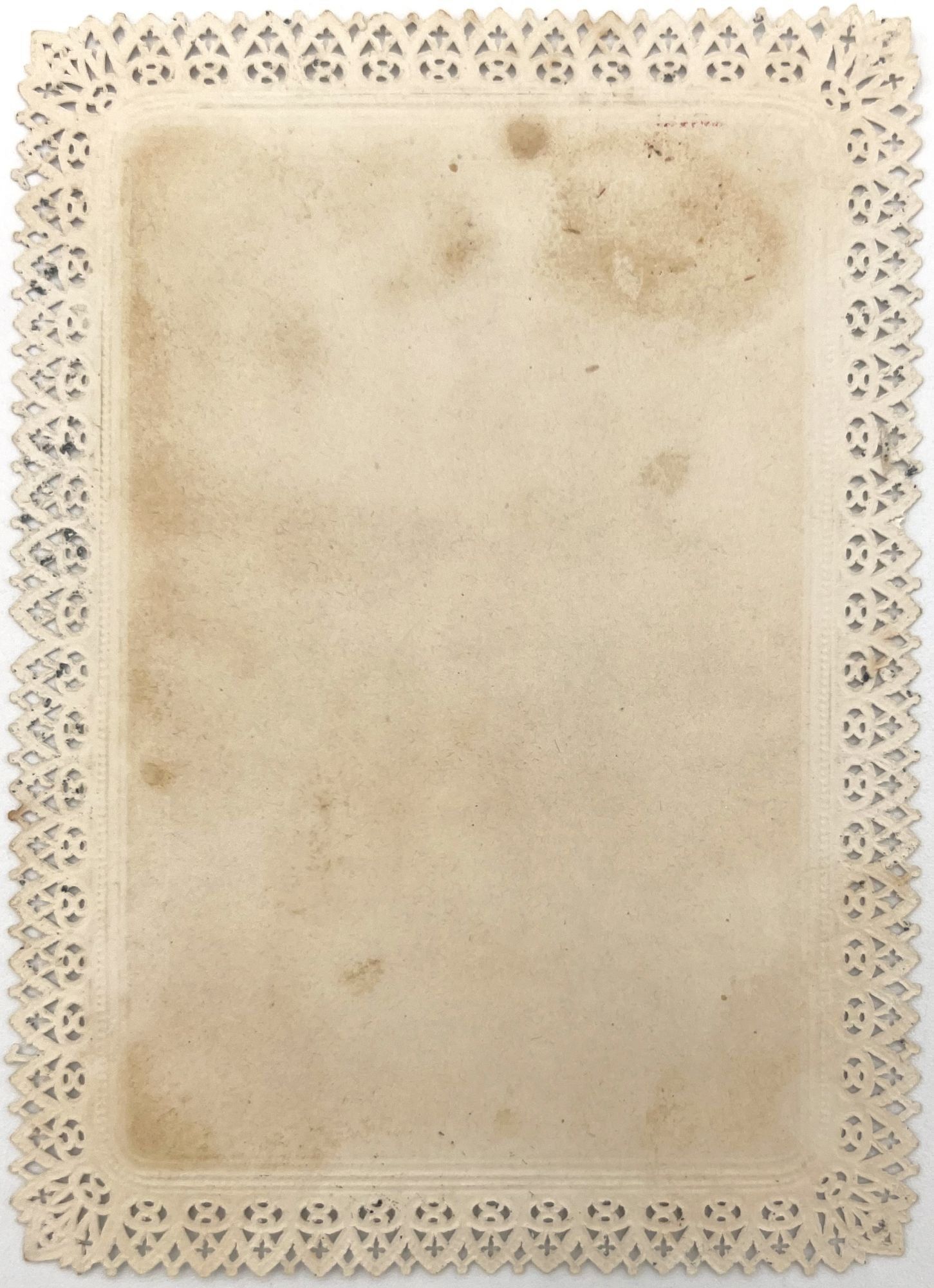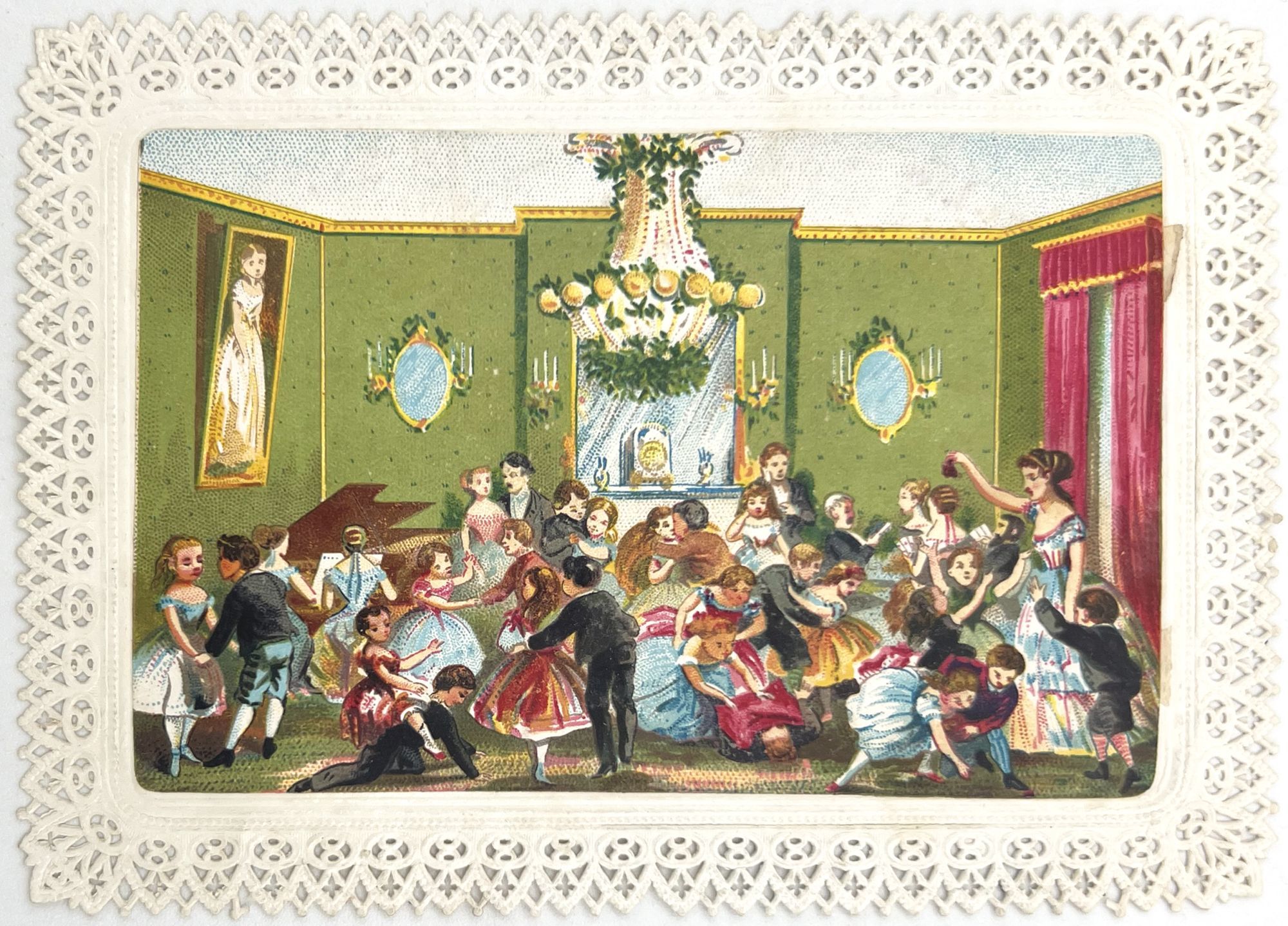 England, 1870. Very good. Toning/discoloration to verso, a couple nicks to lace paper edge, small modern tape repairs to right-hand of image edge.. A charming holiday card consisting of a chromolithographed illustration pasted to coated lace paper with decorative embossed border. The image depicts a spirited holiday party in a parlor decorated for Christmas, with much going on at once: children at play, adults dancing, young ladies playing the piano, and what appears to be a couple sneaking a kiss. Measures approx. 3.5" by 4.75