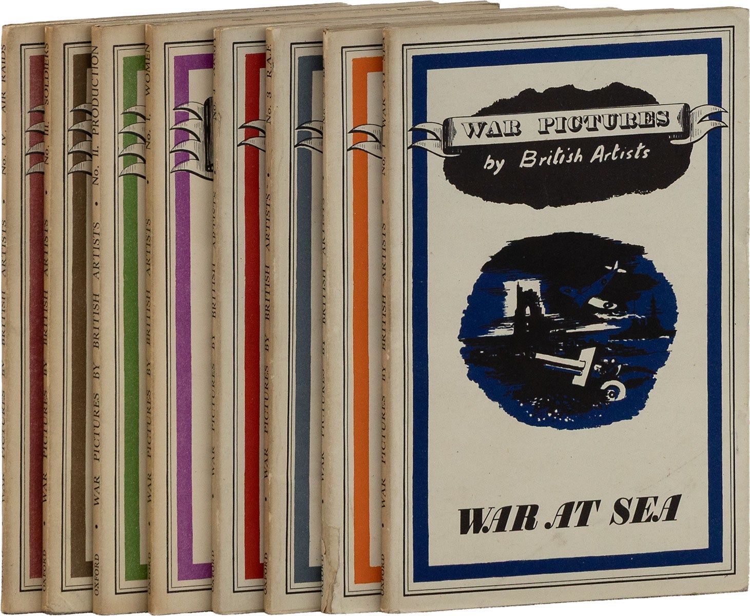Uncommon complete run of this series of WW2-era chapbooks, reproducing in halftone numerous documentary artworks by prominent British painters and illustrators including Edward Ardizzone, Robert Austin, Barnett Freedman, Eric Ravilious, and others. Each book in the series is on a specific martial theme - Series I includes "War At Sea," "Army," "R.A.F.," and "Blitz;" Series II comprises "Women," "Production," "Soldiers," and "Air Raids." Well-known authors were commissioned to write the Introductions, among these Stephen Spender, Cecil Beaton, Laura Knight, H.E. Bates, etc., together comprising an impressive gathering of talent, all arrayed towards rallying morale on the British home front. These copies from the library of noted poet and translator Nathaniel Tarn (1928-2024), who was an undergraduate at Cambridge (under his given name, Edward Michael Mendelson) during the period the series was being produced.