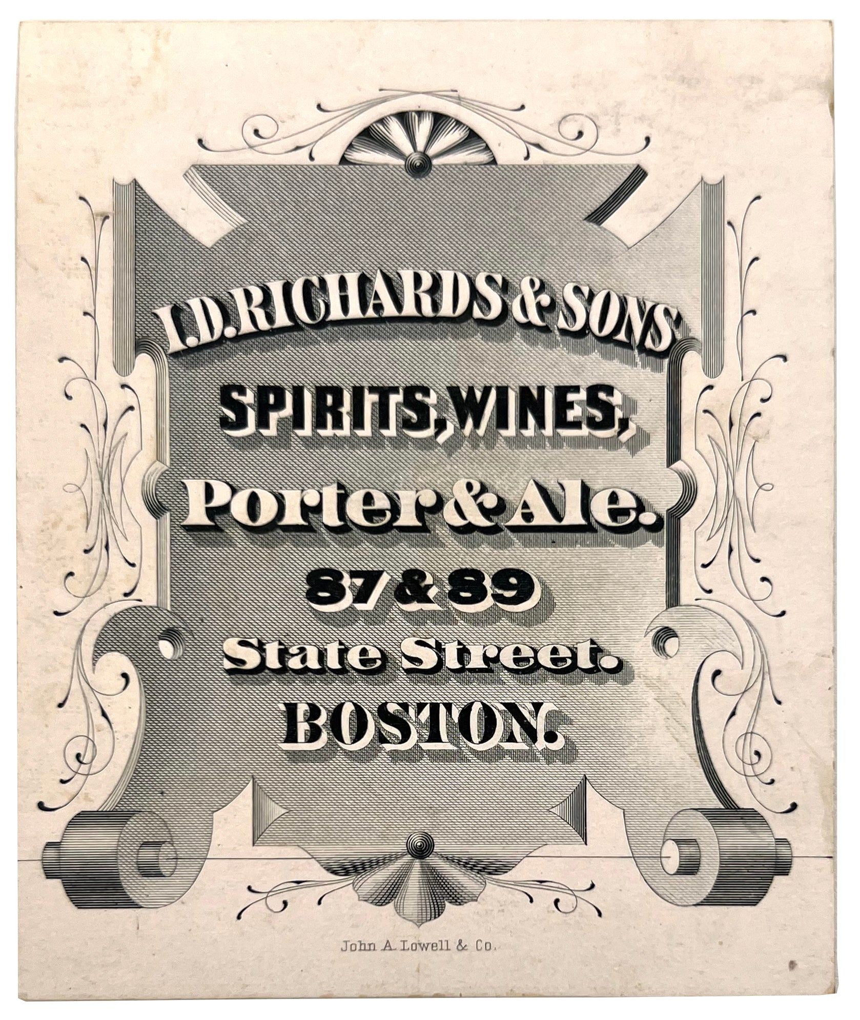 Boston, Massachusetts: John A. Lowell & Co, 1890. Good. Toned with dust soiling, remnants of scrapbook adhesive to verso.. Lithographed advertising card for I.D. Richards & Sons Spirits, Wines, Porter & Ale, of 87 and 89 State Street in Boston. Attractively designed to resemble a steel engraving. Measures approx. 3.25". by 2.5", verso blank.