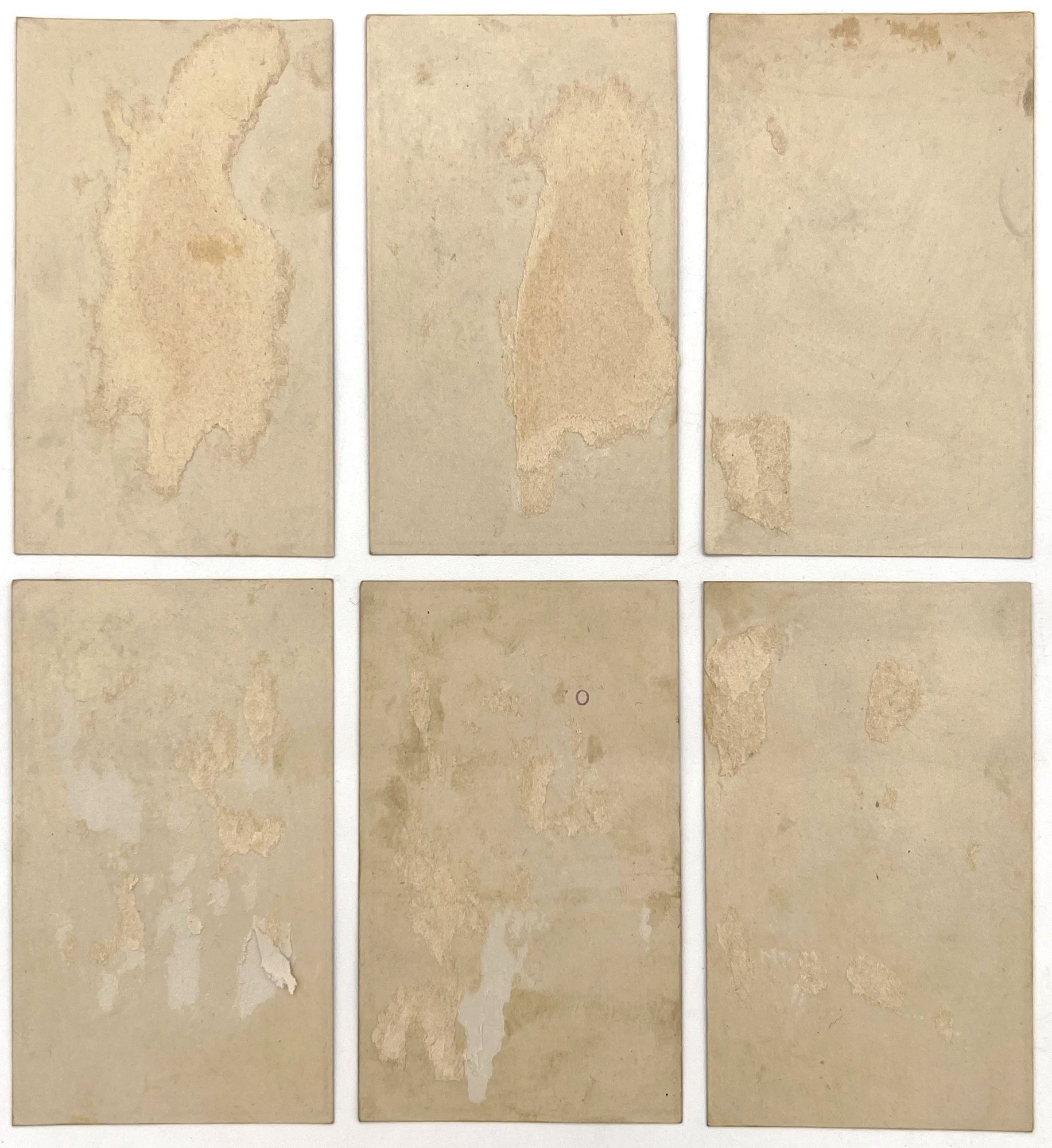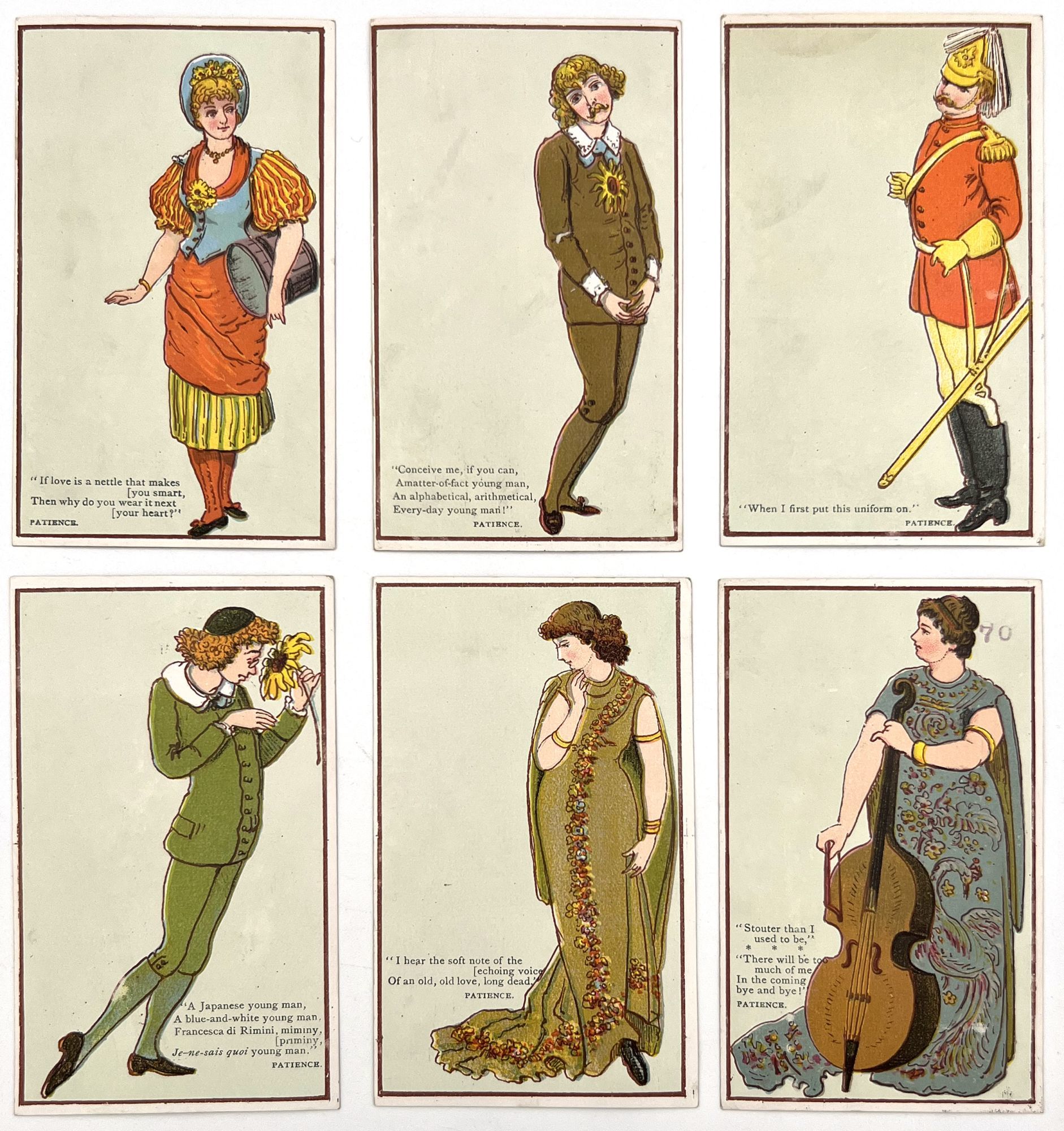 N.pl, 1880. Very good. Surface wear, adhesive remnants to versos, a little dust soiling/toning. Stamps.. A set of six (6) album cards, each with a different character and quote from Gilbert and Sullivan's opera "Patience". The opera pokes fun at contemporary (1880's) aesthetics and vanity. The characters here include: Jane; Grosvenor; the Colonel; Ella; Patience; and Bunthorne. Each measures approx. 4.5" by 2.5