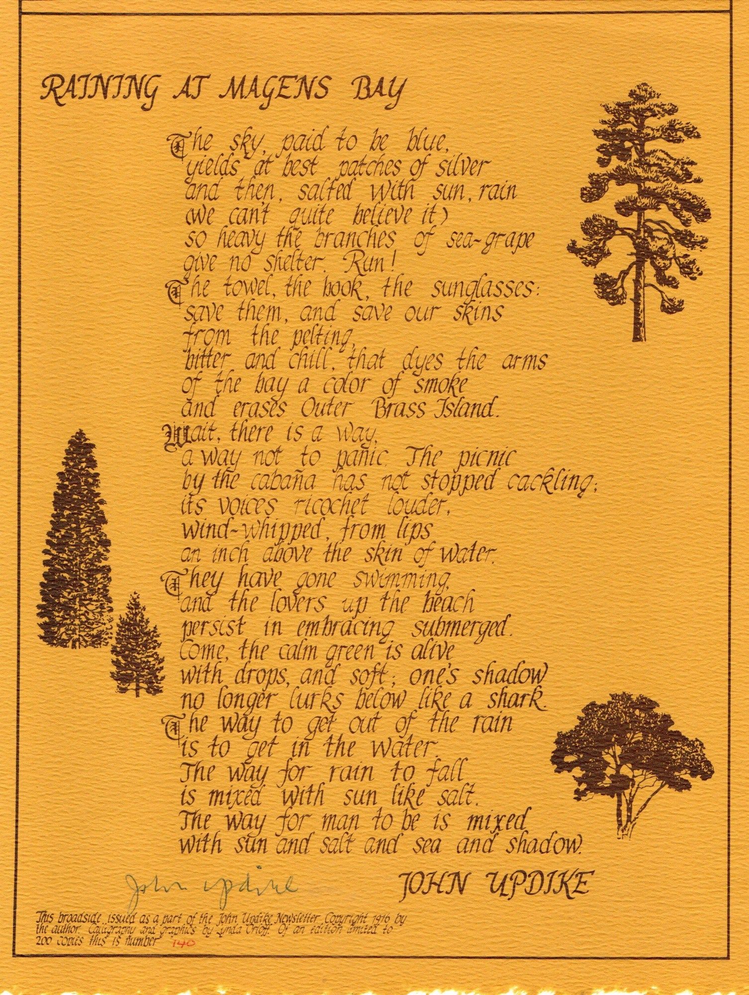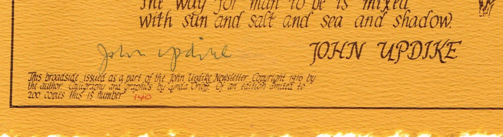 [Northridge, California]: John Updike Newsletter, 1976. Limited Edition. Near Fine binding. Signed. 8.5” x 11.5”; printed on goldenrod stock with the bottom edge deckled, and limited to 200 copies of which this is No. 140. This copy is signed by John Updike above the limitation statement, and is uncommon thus. Near Fine binding.