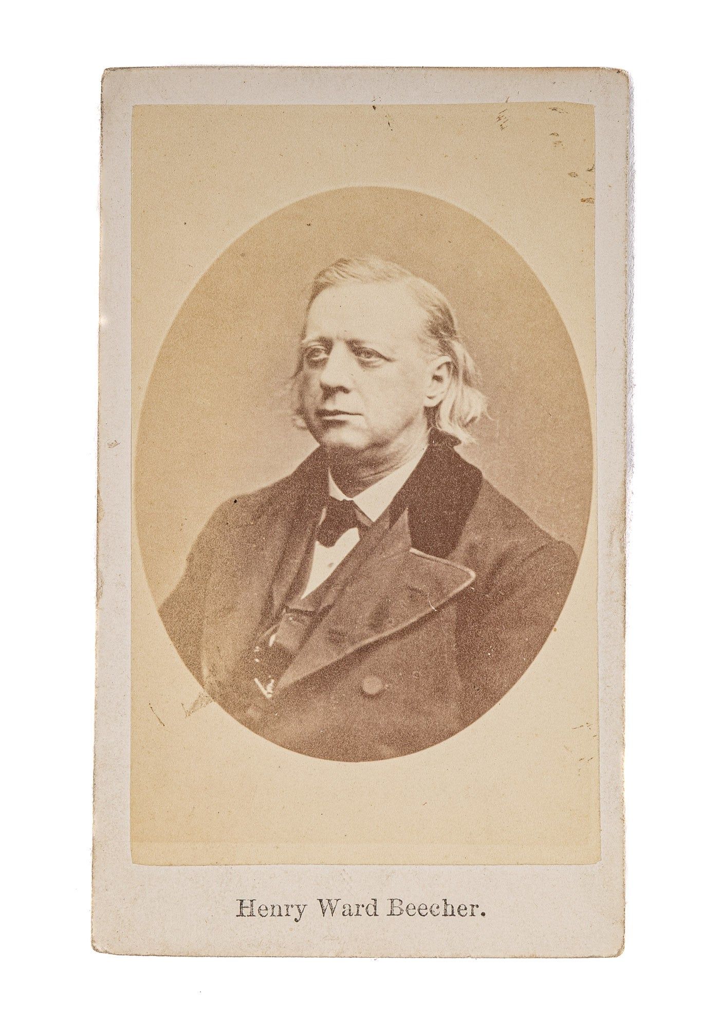 1870. An Important American Minister, Abolitionist and Orator Beecher, Henry Ward [1813-1887]. [Carte de Visite of Henry Ward Beecher]. [Boston?, c.1859-1870]. Paper-print photograph mounted on 4" x 2-1/2" (10 x 6.35 cm) card, caption below image. Light toning, negligible wear, minor soiling. $150. * Beecher was a Congregational minister and activist from a distinguished family. He was the son of Lyman Beecher, a minister and reformer, and the brother of Harriet Beecher Stowe, the abolitionist and author of Uncle Tom's Cabin. He was nationally famous for his oratorical talents, distinctive theology and support for a wide range of social causes, most notably abolition. Famously musing that a rifle was more useful there than "a hundred Bibles," he raised money to send rifles to fellow abolitionists in Kansas during the 'Bleeding Kansas' period. These were known as "Beecher's Bibles.