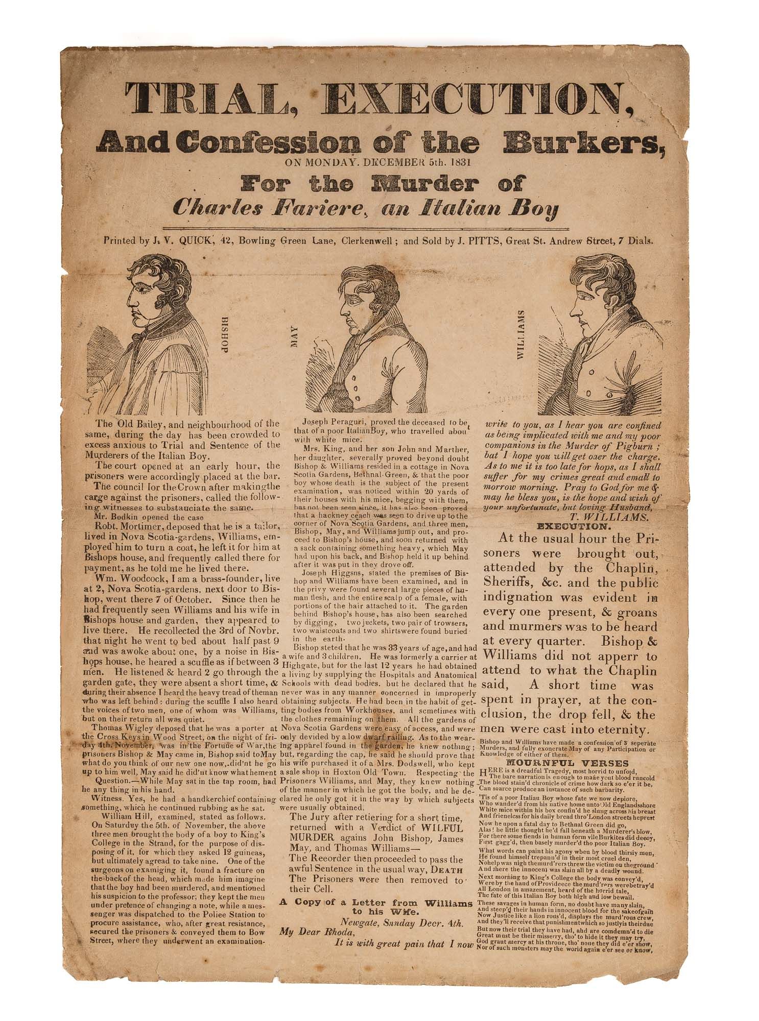 1831. London: J. V. Quick; and Sold by J. Pitts, [1831].. London: J. V. Quick; and Sold by J. Pitts, [1831]. The Trial and Execution of the "London Burkers" [Broadside]. [Executions]. Bishop, John [d.1831]. Williams, Thomas [d.1831]. May, [James]. Trial, Execution, And Confession of the Burkers, On Monday, December 5th, 1831 for the Murder of Charles Fariere, An Italian Boy. [London]: Printed by J[ohn] V[andenburg] Quick, 42, Bowling Green Lane, Clerkenwell; And Sold by J. Pitts, Great St. Andrew Street, 7 Dials, [1831]. 15" x 10" (38 x 25.5 cm) broadside, text in three columns below headline and three woodcut vignettes of the defendants. Light browning, minor edgewear, a few faint stains, horizontal and vertical fold lines with slight creasing along them, clean tear to central horizontal fold affecting text without loss to legibility. $1,750. * Known as the "London Burkers," Bishop, May and Williams were body snatchers whose activities recalled those of the murderous Edinburgh "resurrection men" William Burke and William Hare. Not content to limit themselves to exhumed corpses, they also lured people to their home and then drugged and murdered them in their sleep. Their career came to an end in early November, 1831, with the "Italian Boy Murder," so called because people assumed the victim was an Italian child who had been recently reported as missing. While attempting to sell the body, the anatomist determined that it showed no signs of burial. He initiated an investigation, which led to the discovery of the murder, evidence of other murders and the December 3, 1831 conviction of all three men. Bishop and Williams were sentenced to hang and May was sentenced to transportation to Van Diemen's Land. This sensational event received a great deal of attention in the serious and popular media of the day. The language of our broadside assumes that the reader is familiar with the case. It records the events of the trial and execution, along with a purported letter from Williams to his wife and seven stanzas of verse. OCLC locates 1 copy of this rare broadside (Harvard Law School). No copies added by Library Hub, or by our searches of institutional catalogues.