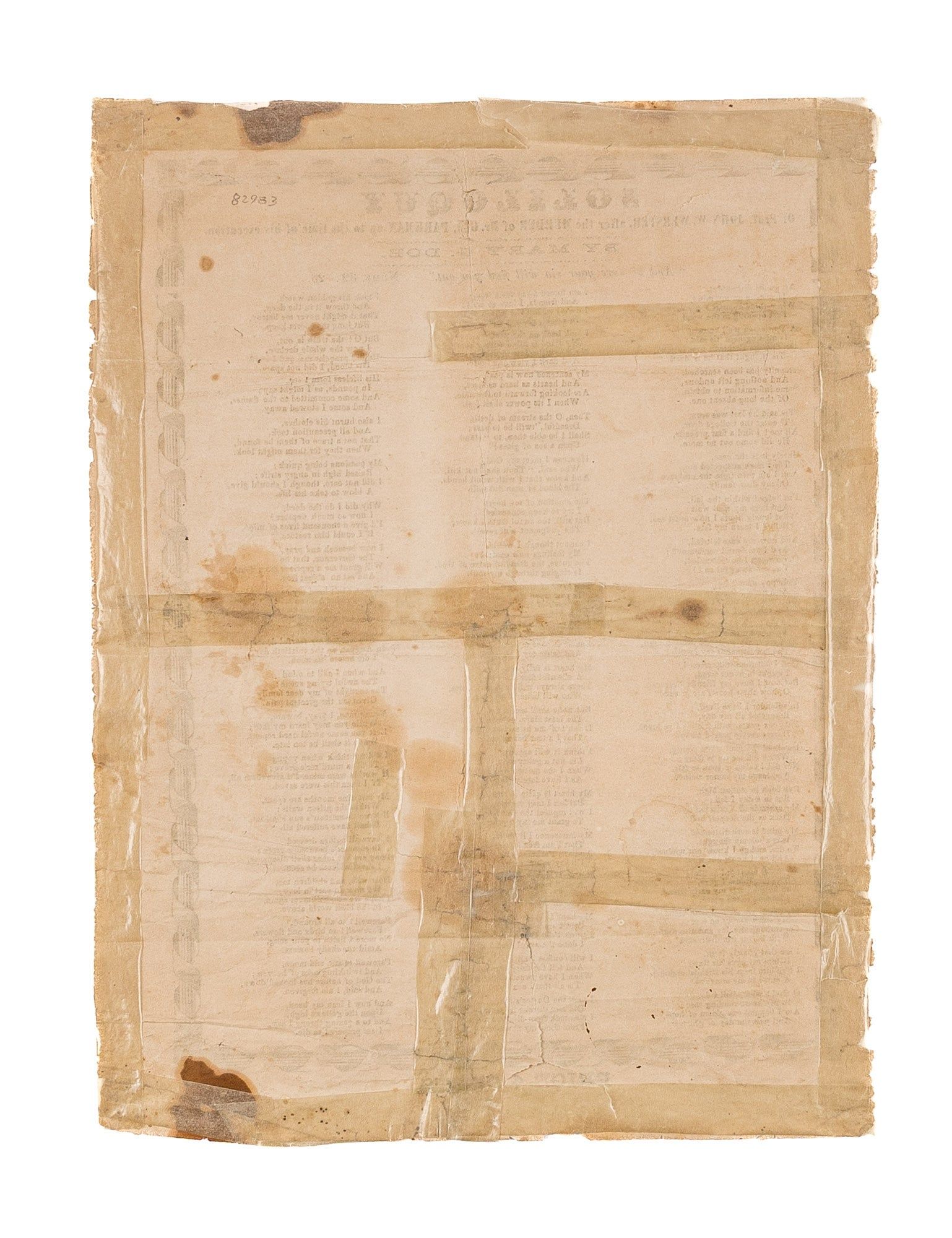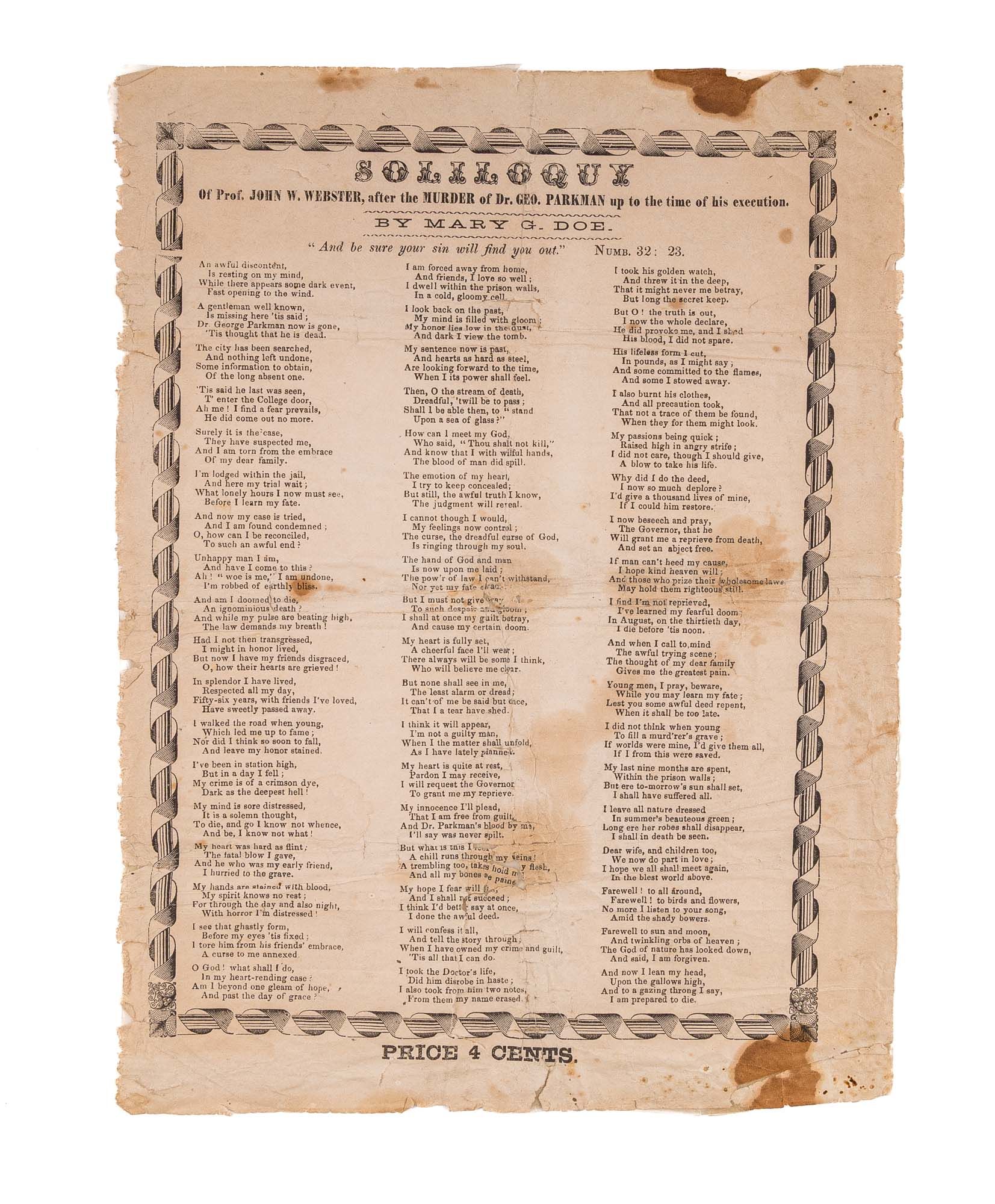 1850. [N.p: S.n., (1850)].. [N.p: S.n., (1850)]. A Verse Broadside by a Female Poet About the Sensational Parkman-Webster Murder [Broadside]. [Murder]. Doe, Mary G. [1801-1870]. [Webster, John White (1793-1850)]. Soliloquy of Prof. John W. Webster, After the Murder of Dr. Geo. Parkman up to the Time of His Execution. [N.p: S.n., (1850)]. 12" x 9" (31 x 23 cm) broadside, headline and three-column text within decorative border. Moderate toning and a few small stains, edges and fold lines reinforced with cellotape on verso, some chips and wear to edges, several tears, mostly invisible, minor loss to text in two places, legibility not affected. $450. * This verse broadside concerns one of the most sensational events in Antebellum America: the murder at Harvard Medical School of Dr. George Parkman, a prominent Boston business man and Harvard alumnus, by Professor John W. Webster, who was deeply in debt to him. This case attracted attention due to its gruesome nature and the high social status of the victim and murderer. Doe was a Maine poet. There are three other issues of her Webster broadside: one with the imprint "Advertiser Press, Biddeford, Maine"; one with a slightly different title, Soliloquy, Of Prof. John W. Webster, After the Disappearance of Dr. Geo. Parkman up to the Time of His Execution, and an Advertiser Press imprint; and one with the latter title and no imprint. All are rare. OCLC locates 5 copies of our imprint (American Antiquarian Society, Brown, Harvard, Harvard Law School, University of Michigan). Not in Sabin.