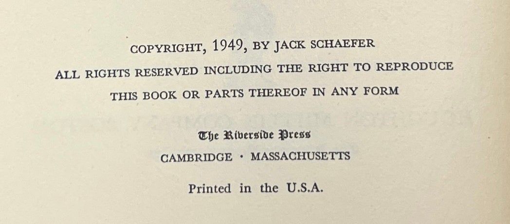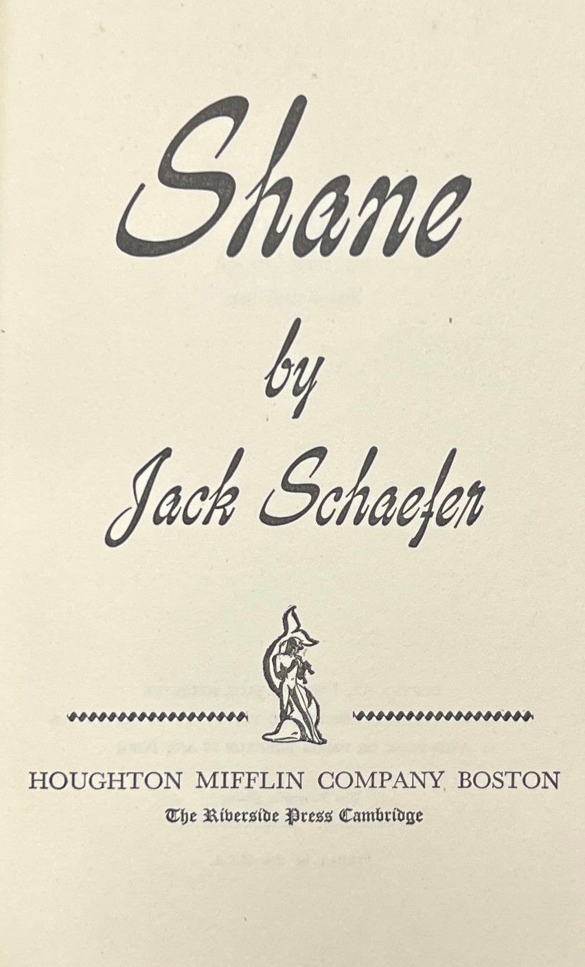 Boston: Houghton Mifflin Company, 1949. Hardcover. Very Good/Very Good. Early Printing. Very Good in a Very Good jacket, clipped, generally rubbed and scuffed, with some creases and shallow chips and tears. Blue boards with brown ink lettering on the spine and front board. Square and firmly bound, foxed at the edges, one page with a shallow chip to the fore-edge, clean otherwise. Schaefer's Western classic, adapted into the 1953 film starring Alan Ladd.