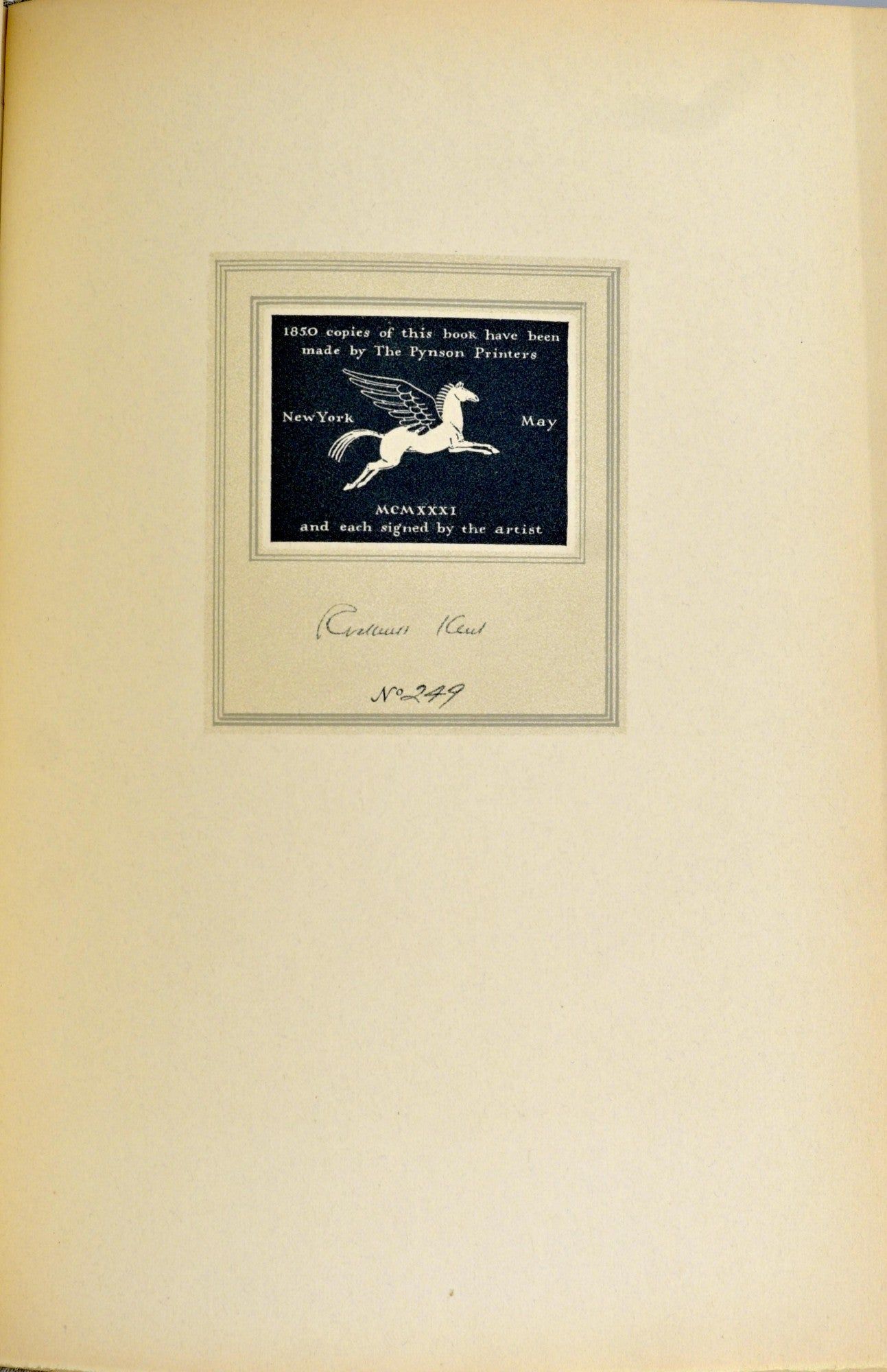 New York: Random House, 1931. First Edition. Hard Cover. Very Good binding. Signed. In pictorial cloth with silk endsheets; unpaginated; a touch of loss to the top and bottom of the spine; a bit of wear to the edges.~~Limited to 1850 copies printed by the Pynson Printers of which this is number 249 signed by Rockwell Kent on the colophon. Very Good binding.