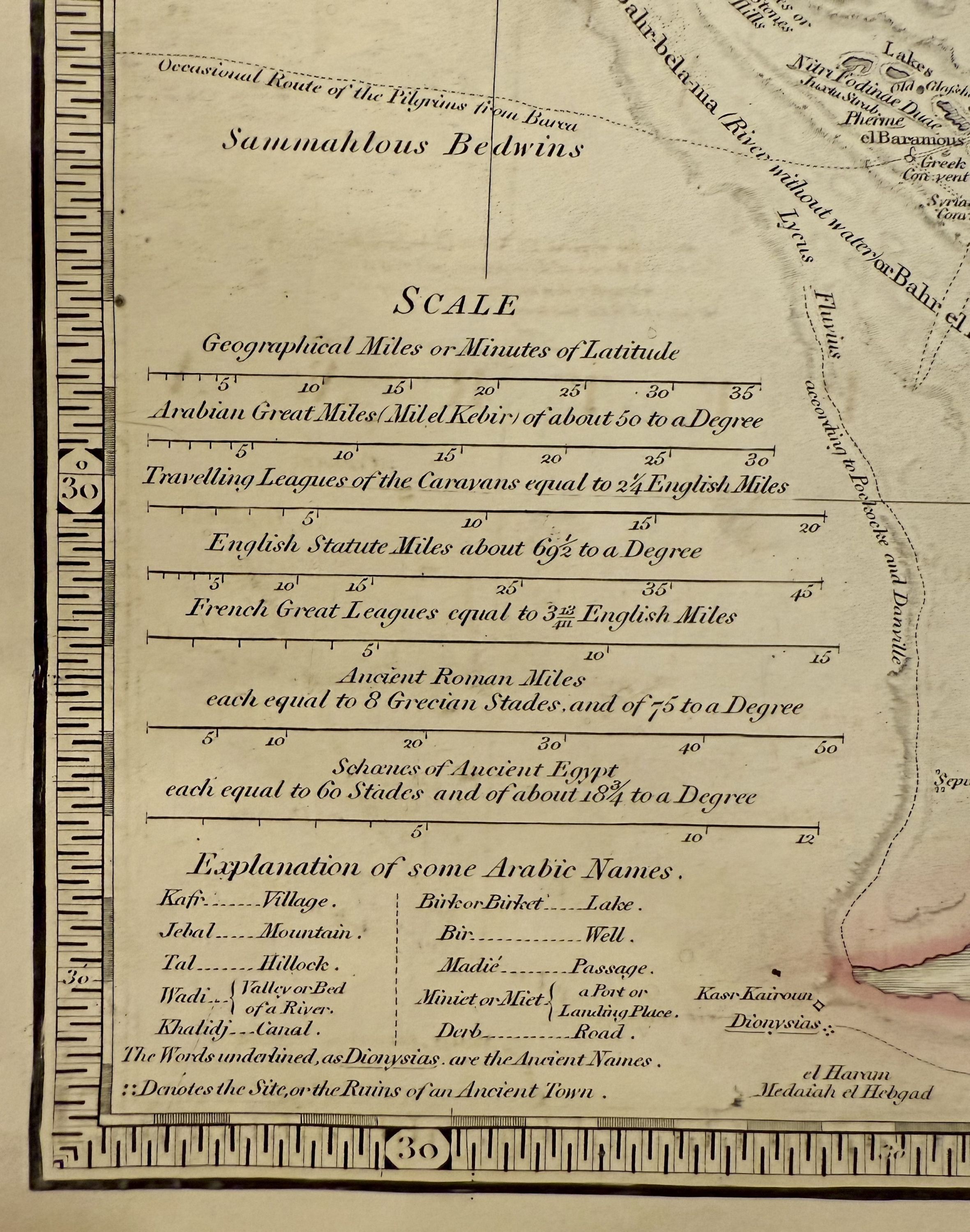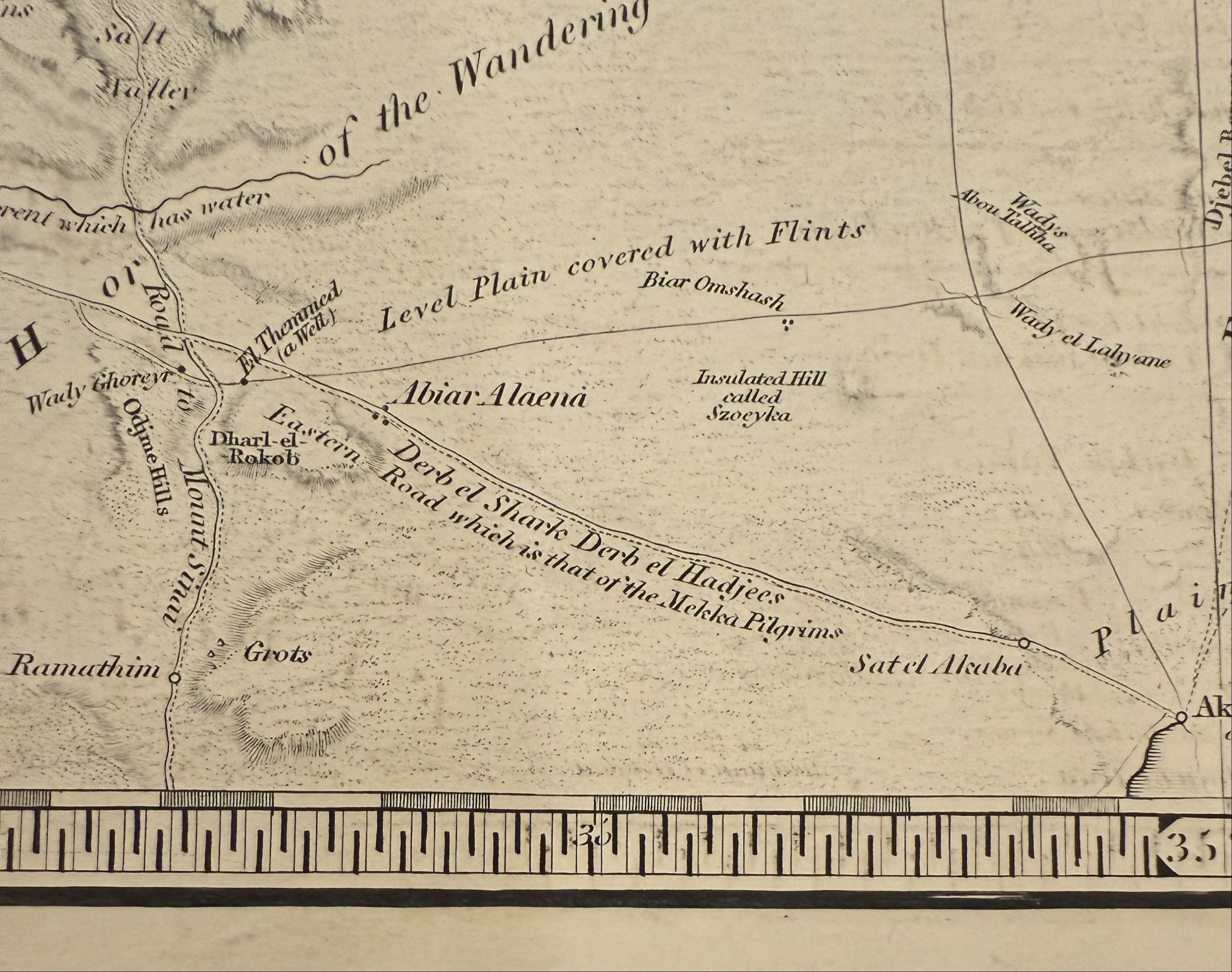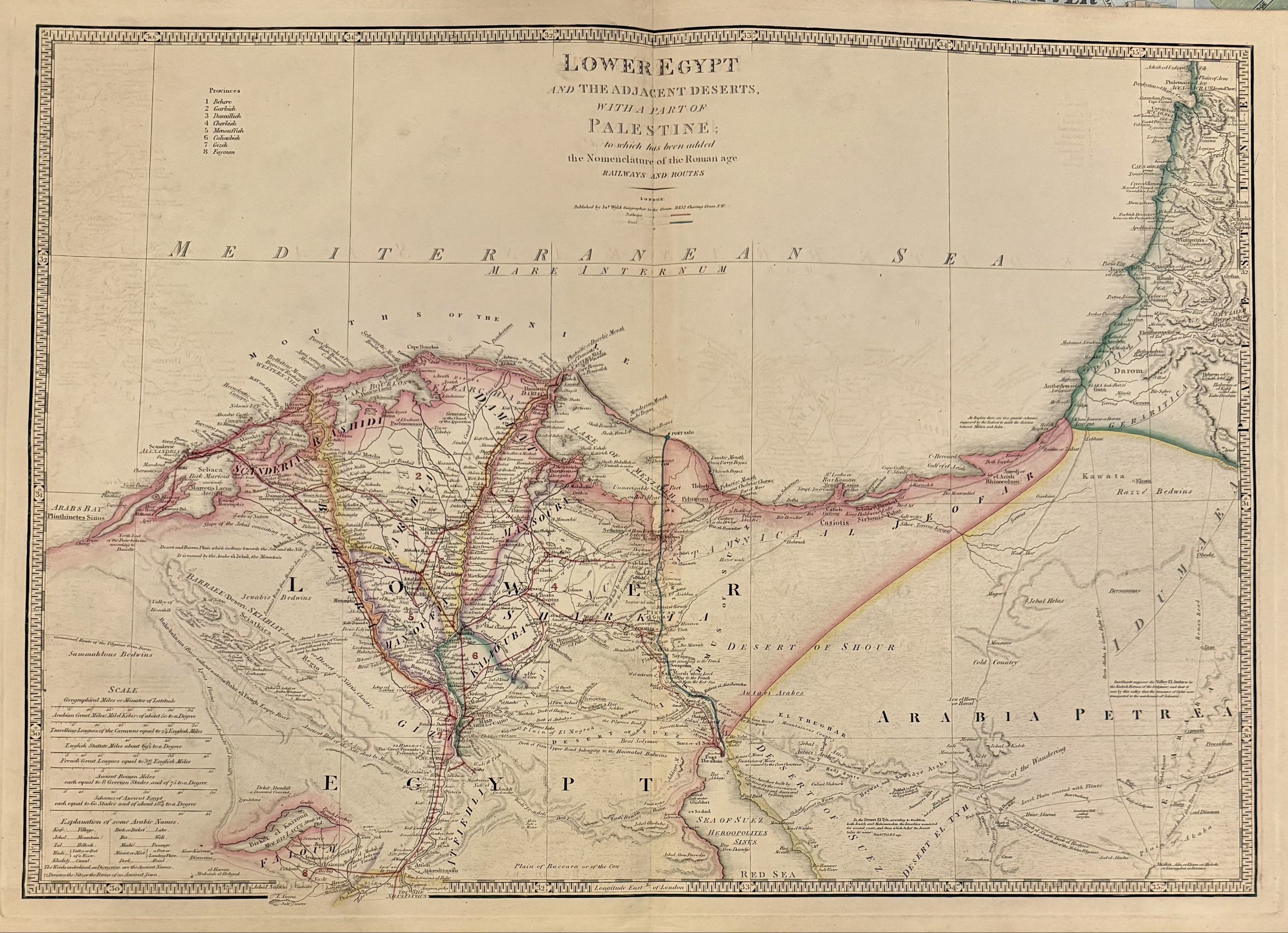 Beautiful desert and railway map of Egypt centered on the Nile and the 120 mile proposed Suez canal. Provinces are listed and noted in color. Sand dunes are finely engraved with many camel routes and trails included. Arabs Bay (Plinthimetes Sinus) and 'Bedwin' routes noted in the West. Part of the Levant in the Eastern Mediterranean is included and hand colorized in green. Part of Saudi Arabia and Akaba (Jordan) noted. As well as the Eastern road to 'Mekka'. Seven distance scales and a table gives the translation for ten Arabic names. James Wyld Senior (1790-1836) was a distinguished British mapmaker known for producing maps and globes. He served as Geographer to George IV and William IV. He was a founding member of the Royal Geographical Society and introduced lithography techniques to his production. His son James Wyld Junior (1812-1887) was the official geographer to Queen Victoria. This lovely map of is a fine example of his work.