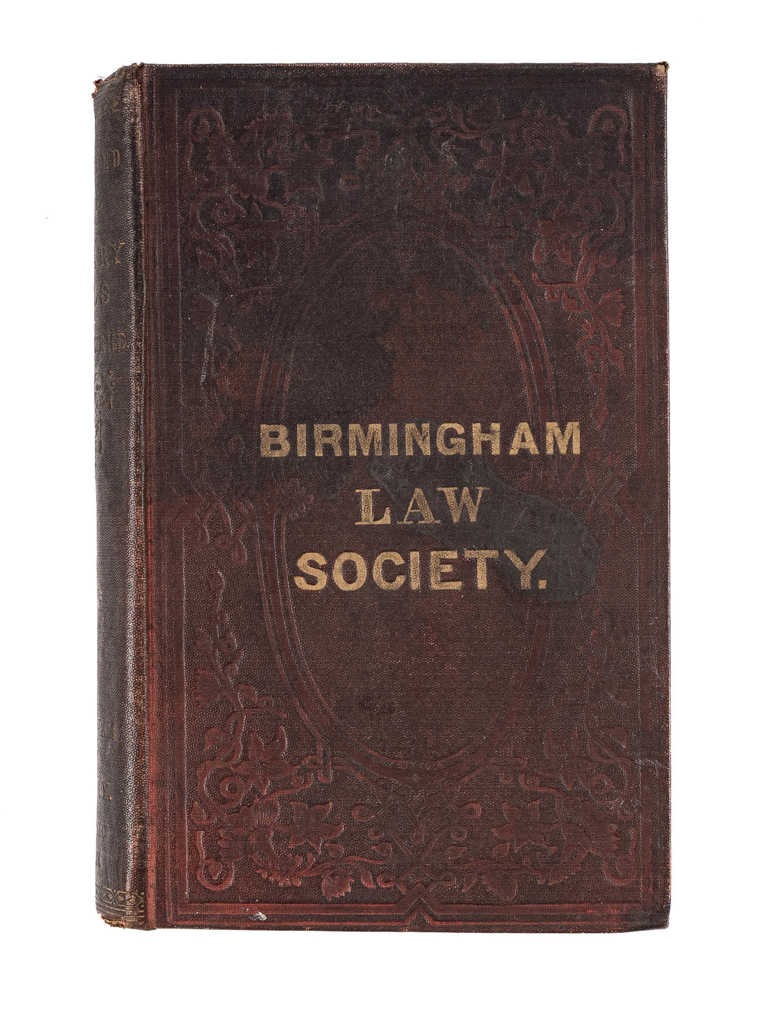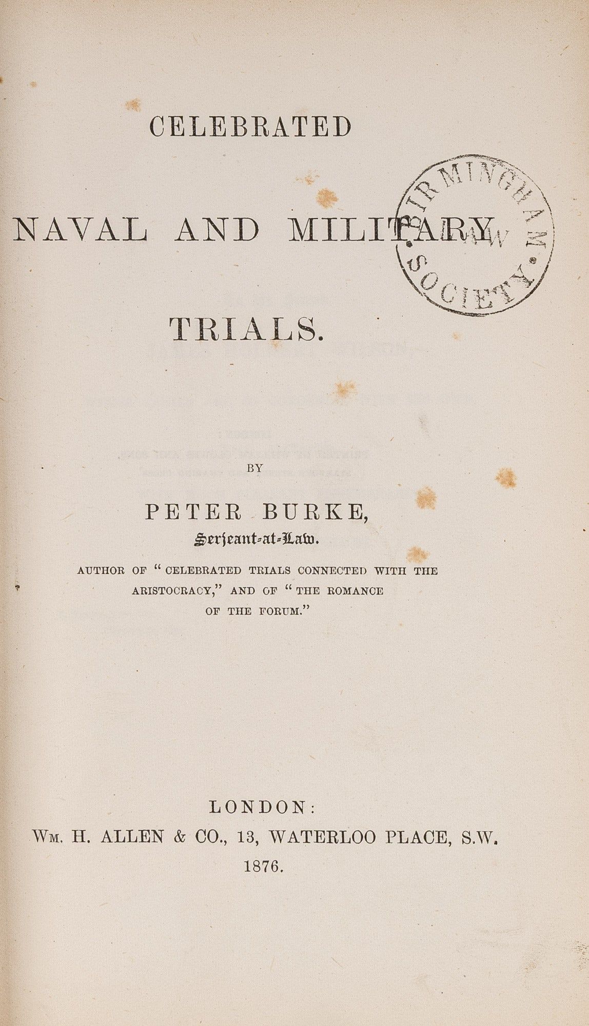 1876. Burke, Peter. Celebrated Naval and Military Trials. London, W.H. Allen, 1876. 510 pp. Decorative crimson cloth with gilt stamped spine. Birmingham Law Society stamped in gilt to boards and spine. Spine and front cover heavily soiled. Ex-library with bookplate to front pastedown, stamp to title and preliminary pages. Some foxing. Worn. $75.