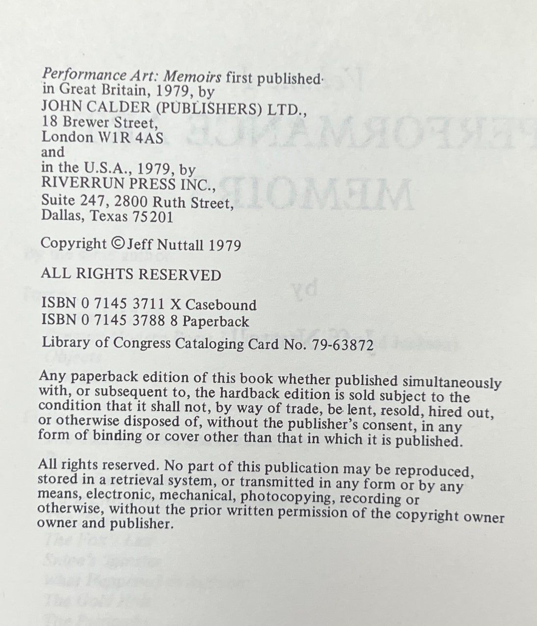 London: John Calder Ltd, 1979. First Edition. Paperback. Very Good. Very Good. Wraps rubbed, price and ISBN sticker on the back cover. Square and firmly bound, some dog-earred pages, clean otherwise. Nuttall's story of and theory behind his art.