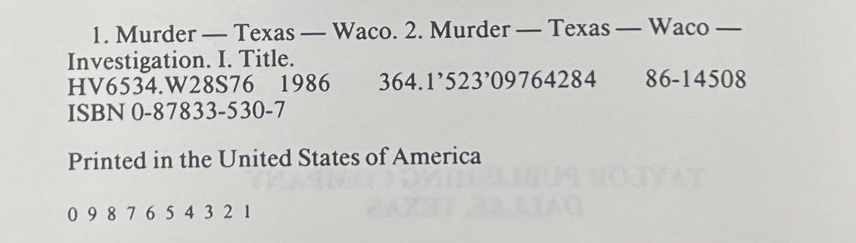 Dallas: Taylor Publishing Company, 1986. First Edition. Hardcover. Fine/Fine. Fine in a Fine jacket, unclipped ($18.95). Glossy beige boards with black ink lettering on the spine. Square and firmly bound, clean internally. A true crime book about the triple murder of three teens and Sergeant Truman Simons's search for the killer.