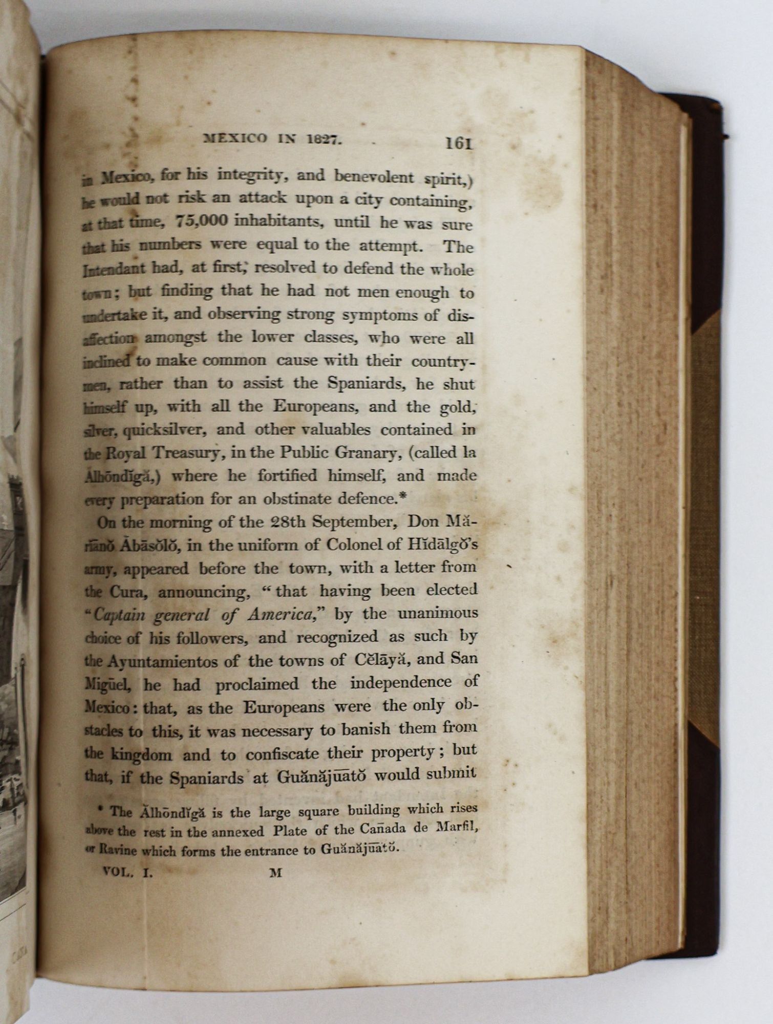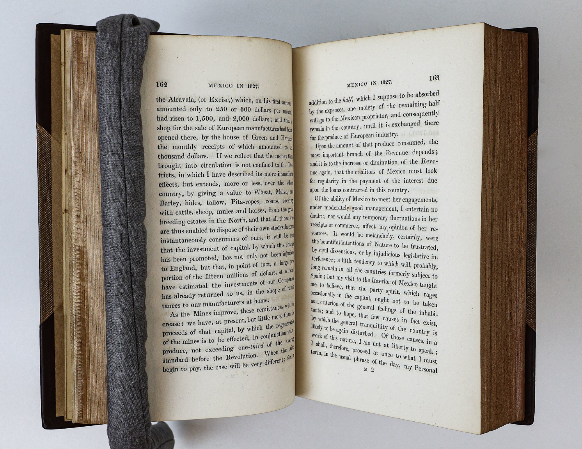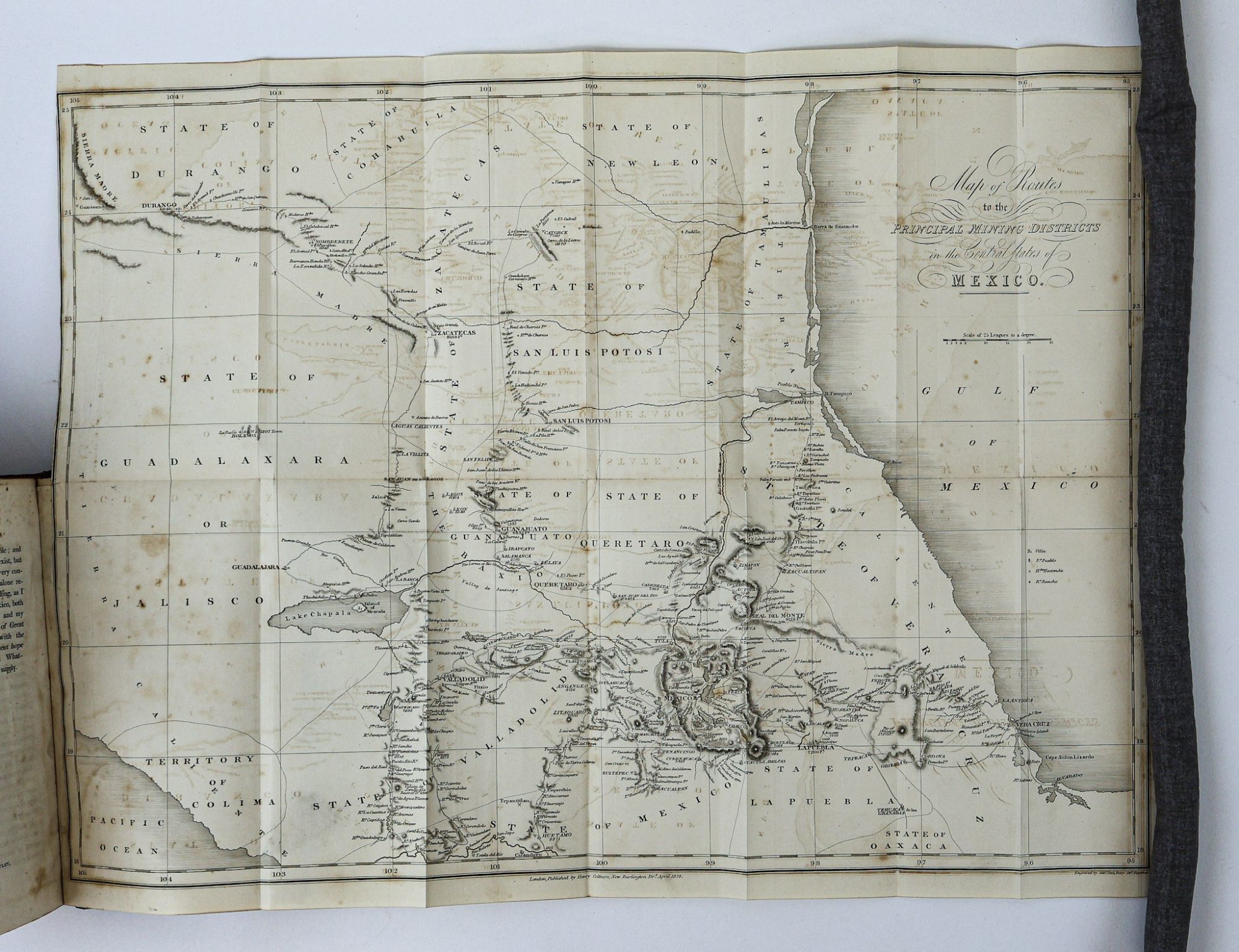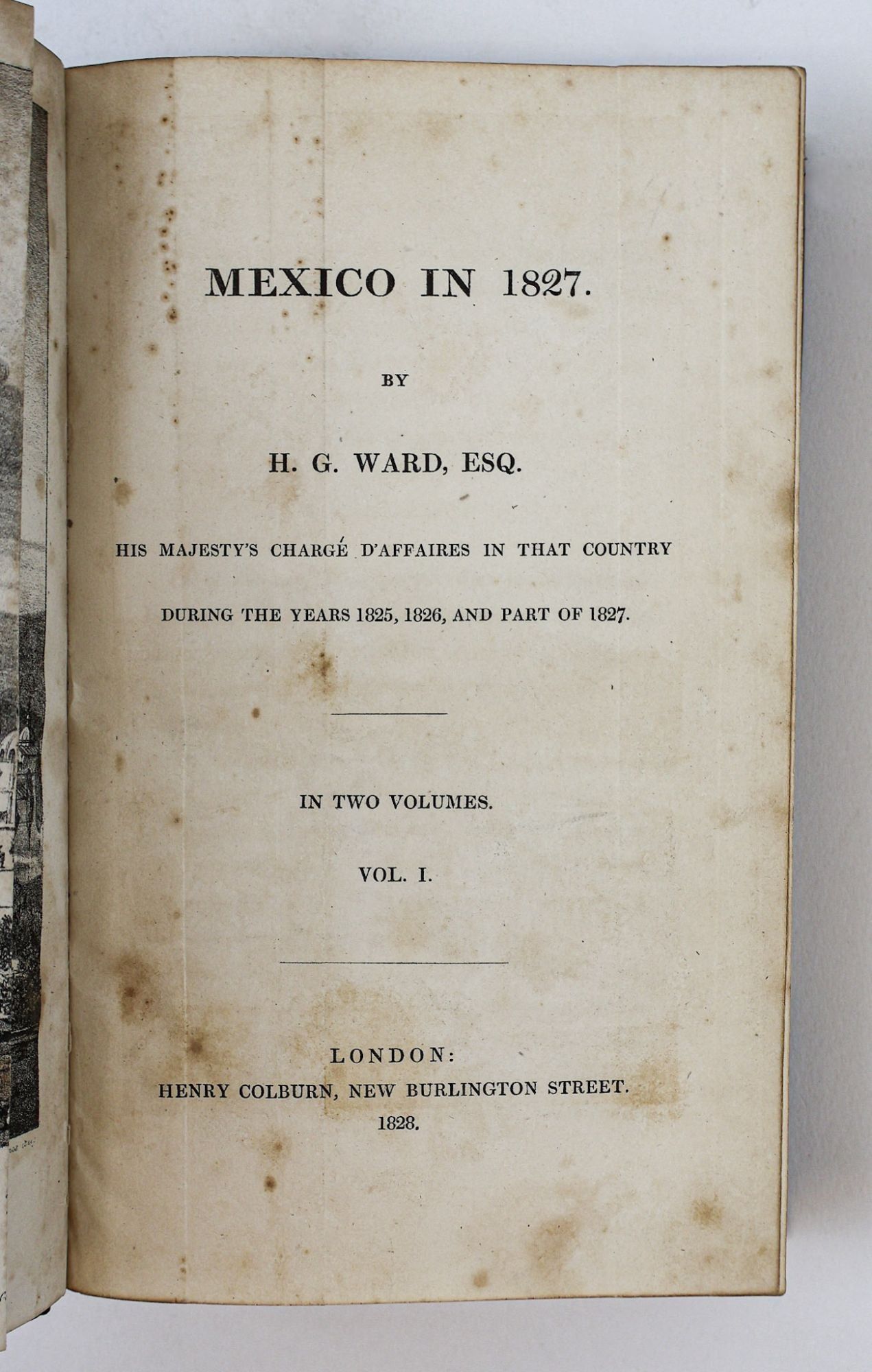 VOL I: (xix, [1], 591, [1] pages, plus a foldout illustrated frontispiece, four illustrated plates, and a foldout map);-- VOL II: (viii, 730 pages, plus a foldout illustrated frontispiece, seven plates, and a foldout map). Henry George Ward (1797–1860) was an English diplomat, politician, and colonial administrator. He served as the British Charge d'affaires to Mexico. Ward's "Mexico in 1827" is one of the most exhaustive accounts of Mexico and its mining activities in the years following its independence from Spain. It provides a unique first-hand interpretation both of Mexico's early governments’ achievements and of the not insignificant problems they had as yet to overcome. It highlighted the risks and opportunities Mexico presented to potential British investors. 1401742. Special Collections.