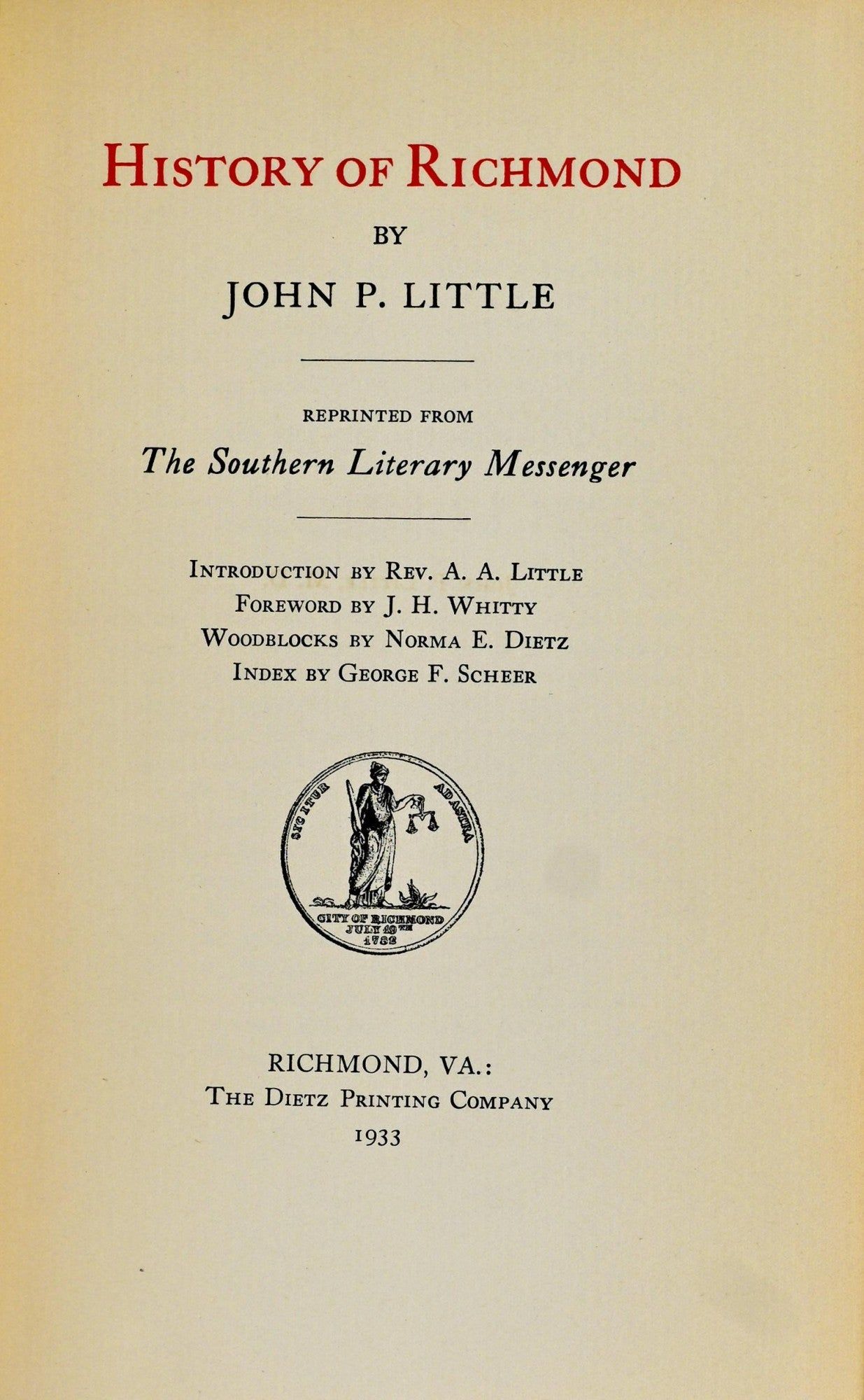 Richmond, VA: The Dietz Printing Company, 1933. Limited Edition. Hard Cover. Very Good binding/Very Good dust jacket. 8vo; in the publisher’s cloth binding with the Richmond seal on the upper board stamped in gold; in the dust jacket; xiii; 303 pages including the Index; a bit of foxing to the spine; the top of the spine is lightly bumped; dust jacket is toned with a few chips and trivial closed tears: a previous owner’s signature on the front end paper; Limited Edition, numbered 682 copies, of which this is number 390. ~~Reprinted from the Southern Literary Messenger. Overall a nice copy, scarce in jacket. Very Good binding / Very Good dust jacket.