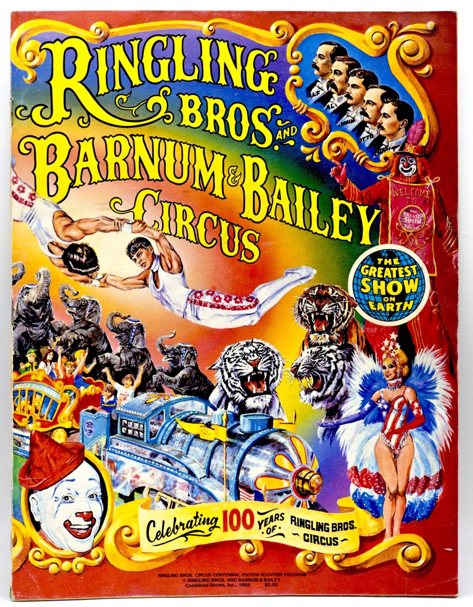 [Ringling Brothers], 1984. Stapled Pamphlet. Very Good binding. 13”x 10” Large colorful program, for the 100th anniversary of Ringling Brothers. With folded poster stapled in at the centerfold. Just a trace of wear. Very Good binding.