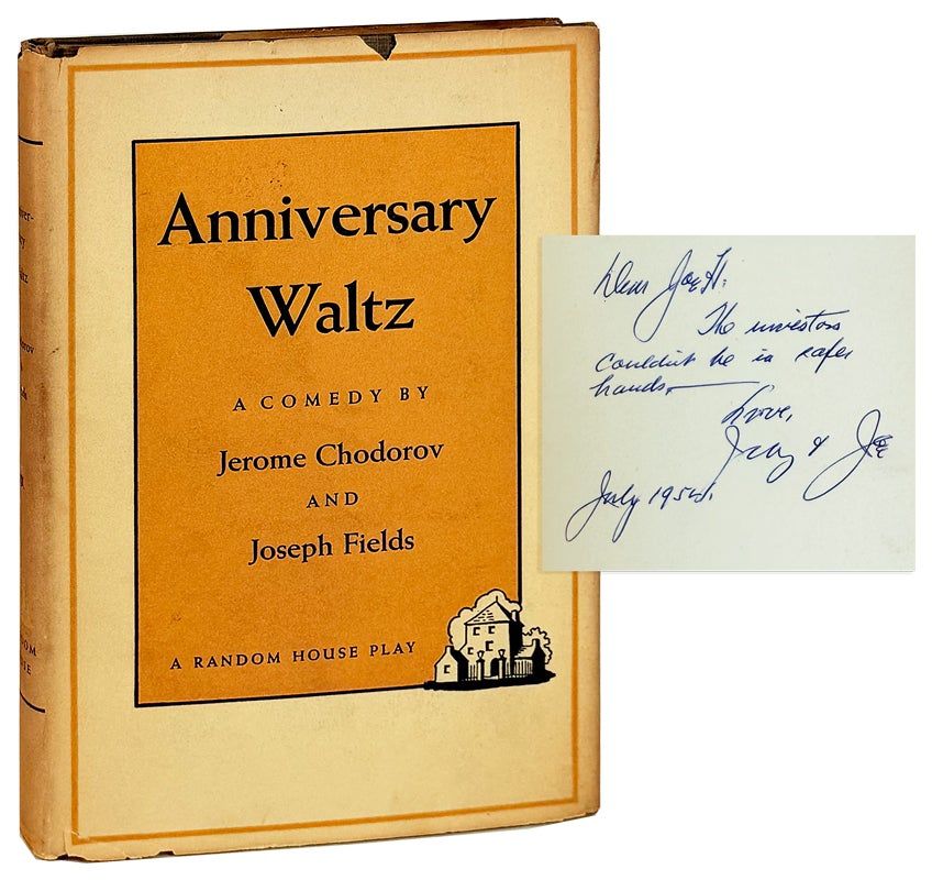 Inscribed and signed "Dear Joe H: The investors couldn't be in safer hands-- Love, Jerry & Joe / July 1954." Presumably inscribed by the authors to Joseph H. Hyman who co-produced "Anniversary Waltz" on Broadway at the Broadhurst Theatre, opening just a few months prior to this inscription on April 7th, 1954.