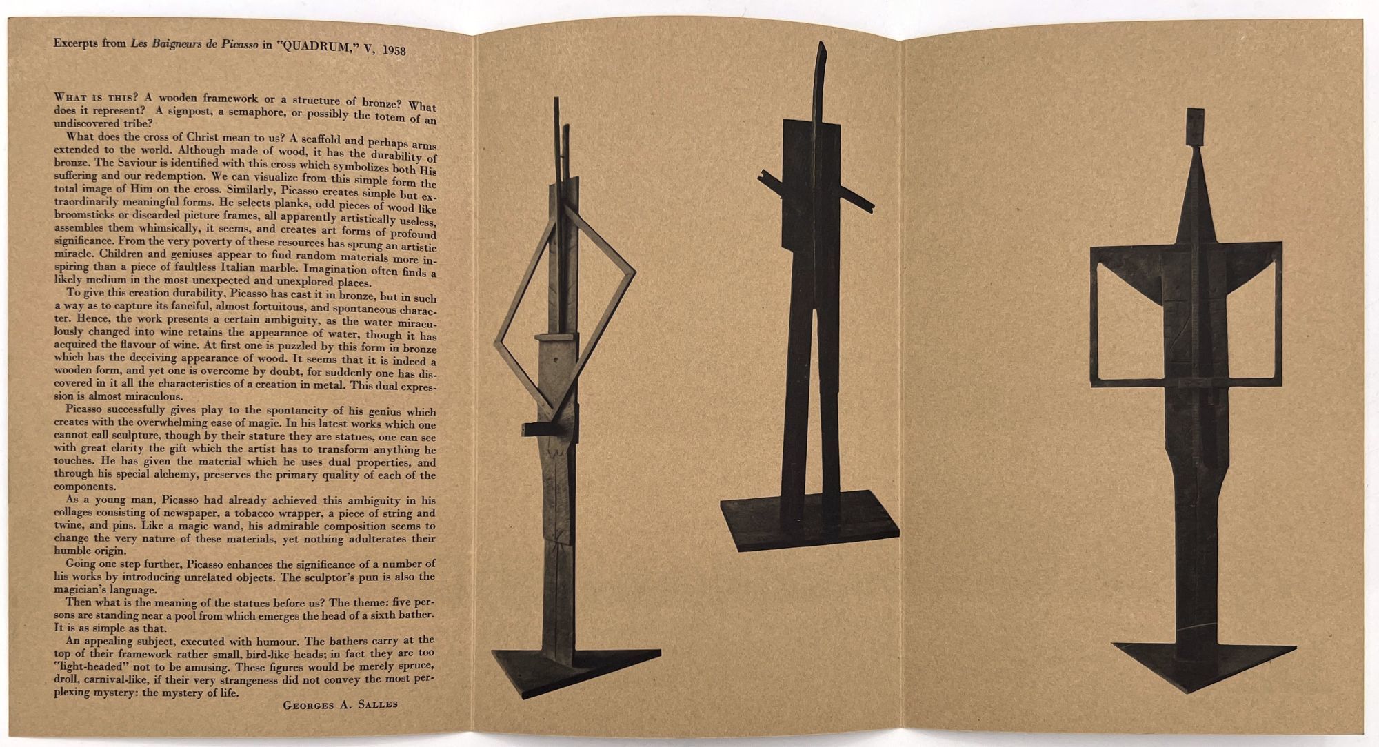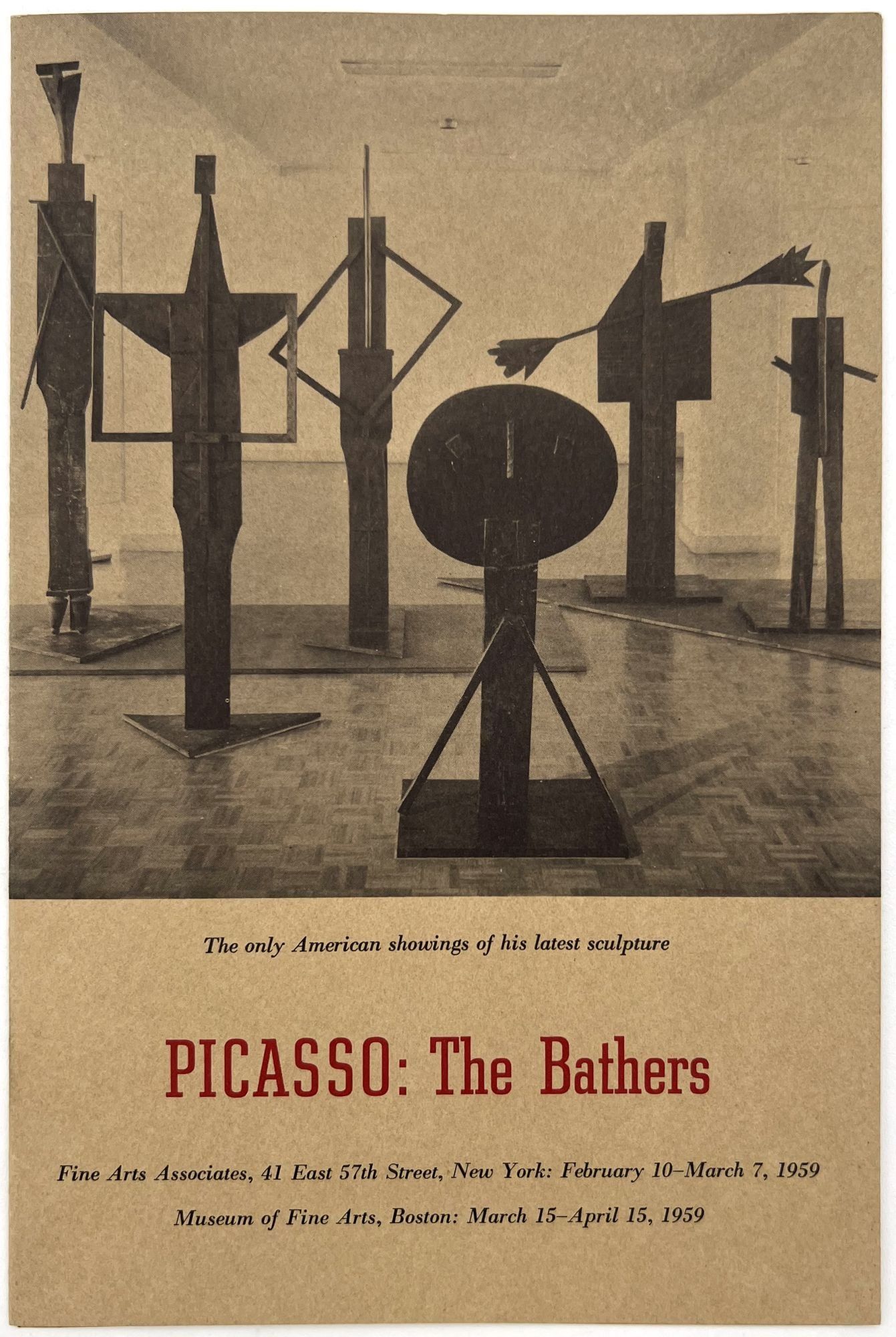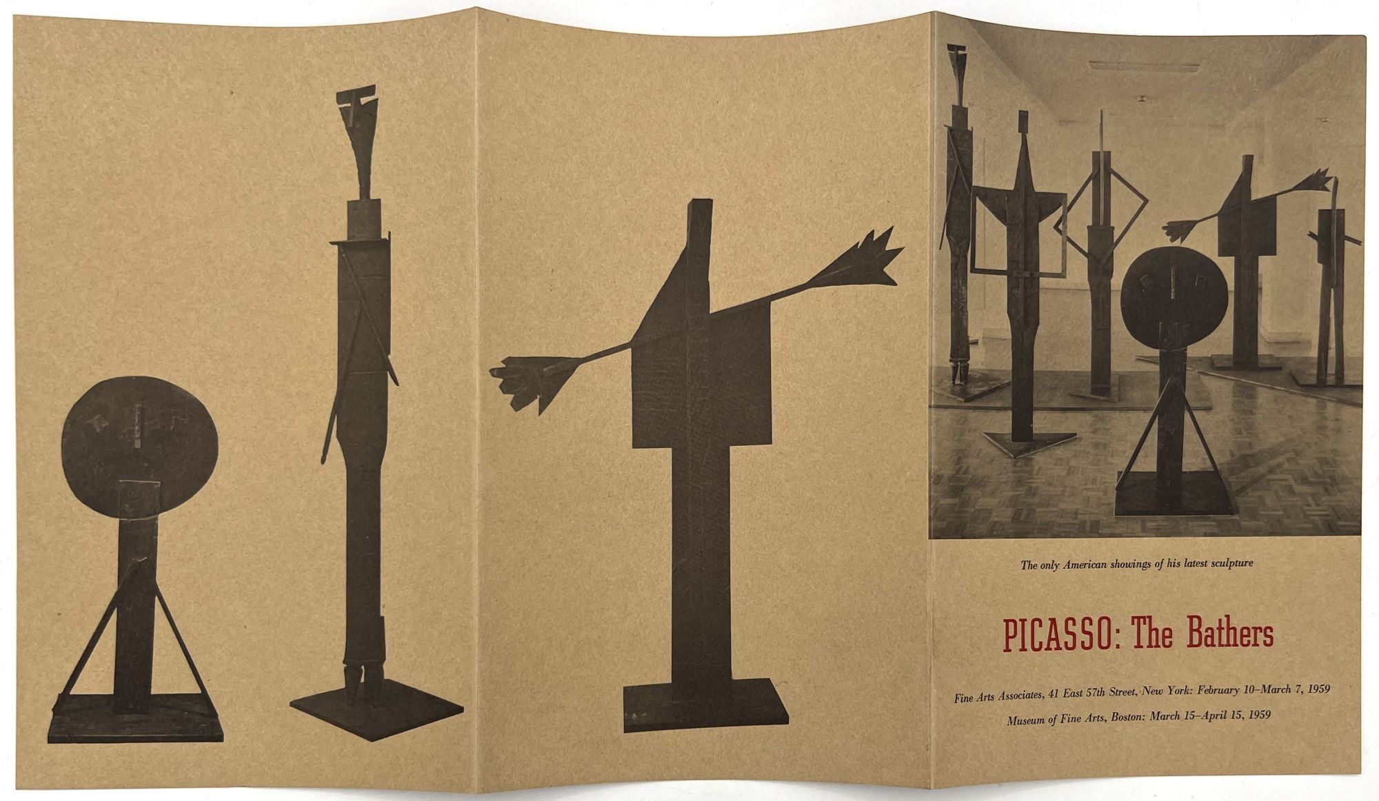 1959. Advertising pamphlet for "The only American showings" of Picasso's "The Bathers" in 1959 at the Museum of Fine Arts, Boston, and Fine Arts Associates in New York. Includes a brief introduction by the French art critic Georges Salles (1889-1966). Folding pamphlet with photo illustrations of the sculptures measuring approx. 8.5" by 5.5" folded.