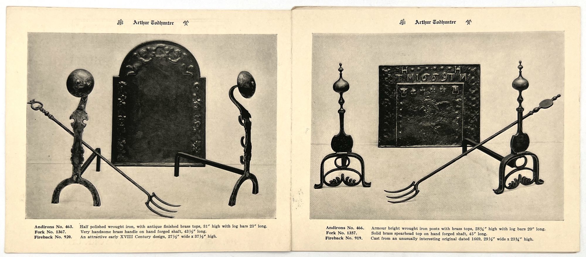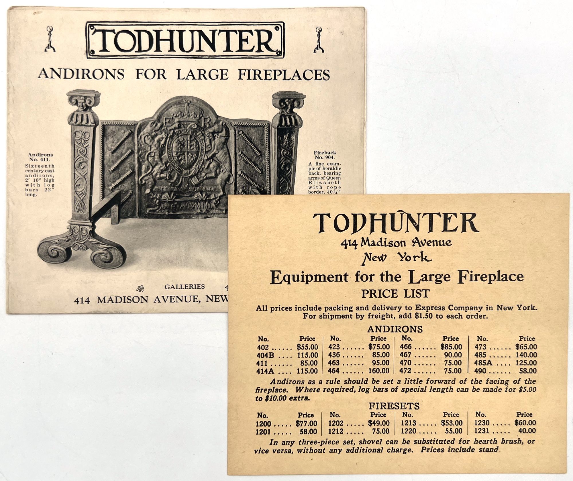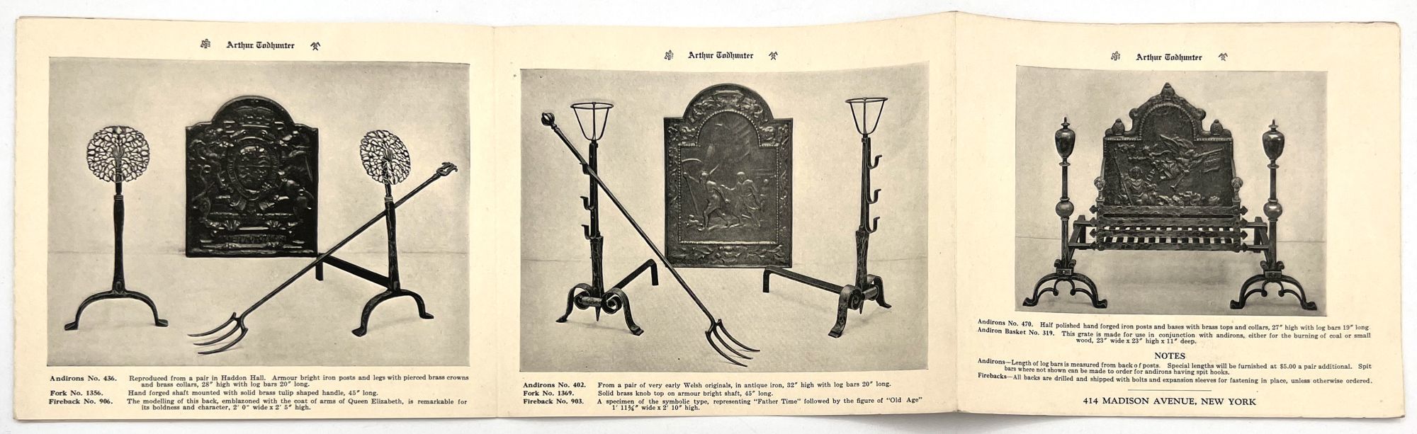 New York, New York: Todhunter, 1920. Good. Light dust soiling, a couple short tears (closed).. Photo-illustrated trade catalogue advertising "Andirons for Large Fireplaces" by the New York ironwork gallery "Arthur Todhunter". Each item is sumptuously designed, clearly marketed towards the upper classes, and reference "Old World" style designs cast from original antiques. Each item is illustrated with an item number and brief description with dimensions. There are nine (9) total illustrated panels, the last panel being a title-page panel. Measures approx. 5.5" by 6.5". Accompanied by loose 5" by 6" printed price list of andirons, fire sets, tools, grates and fire backs.