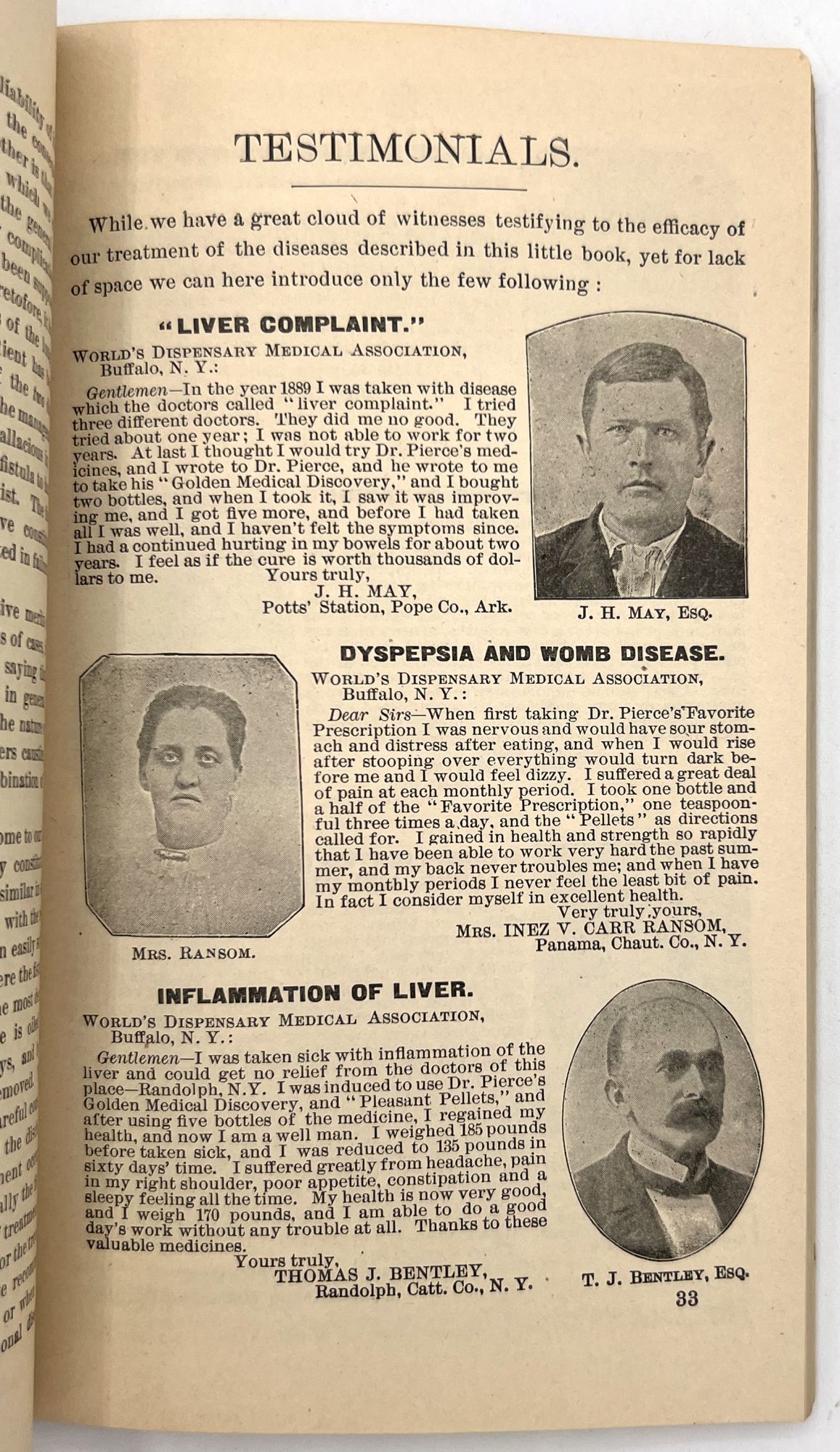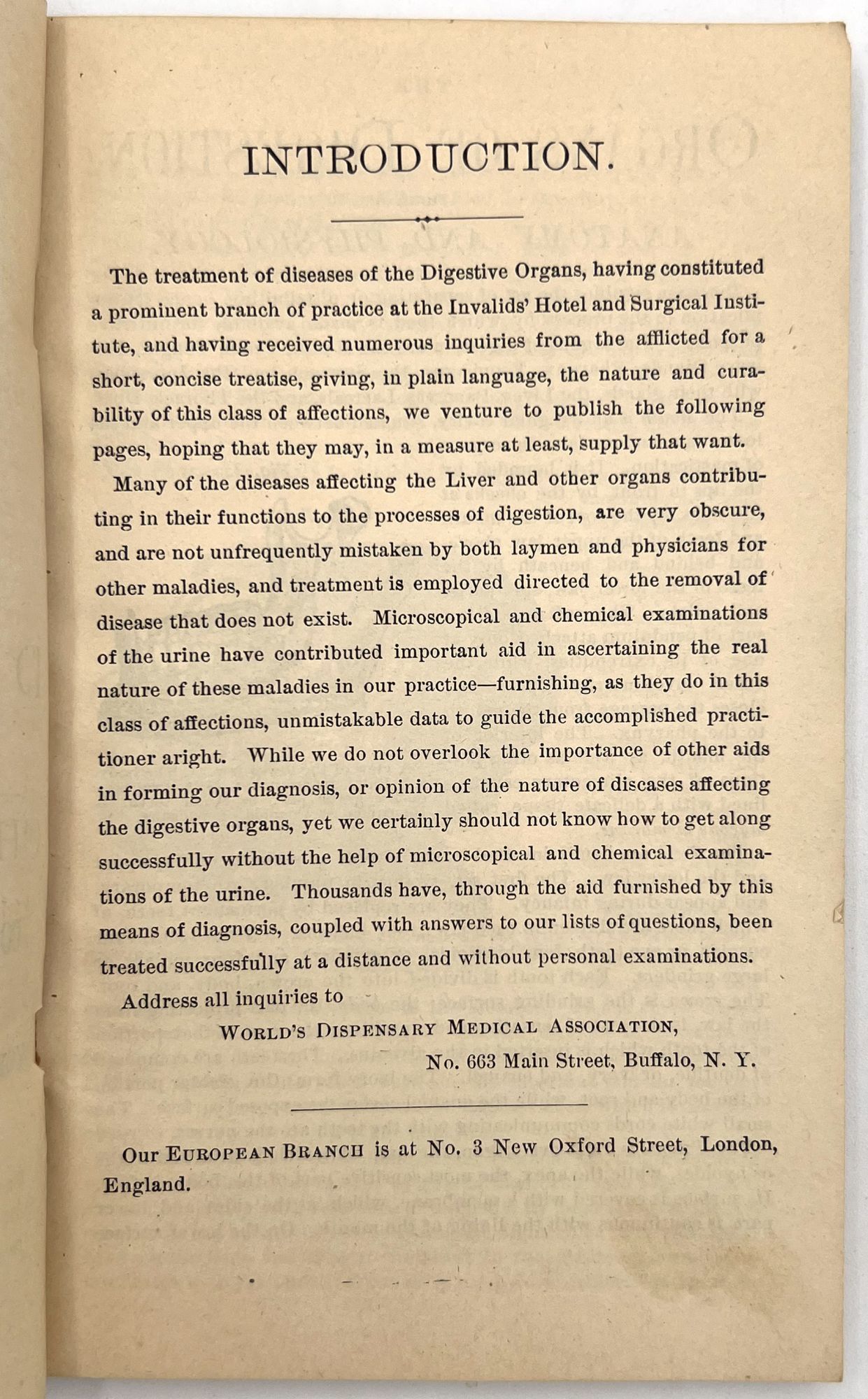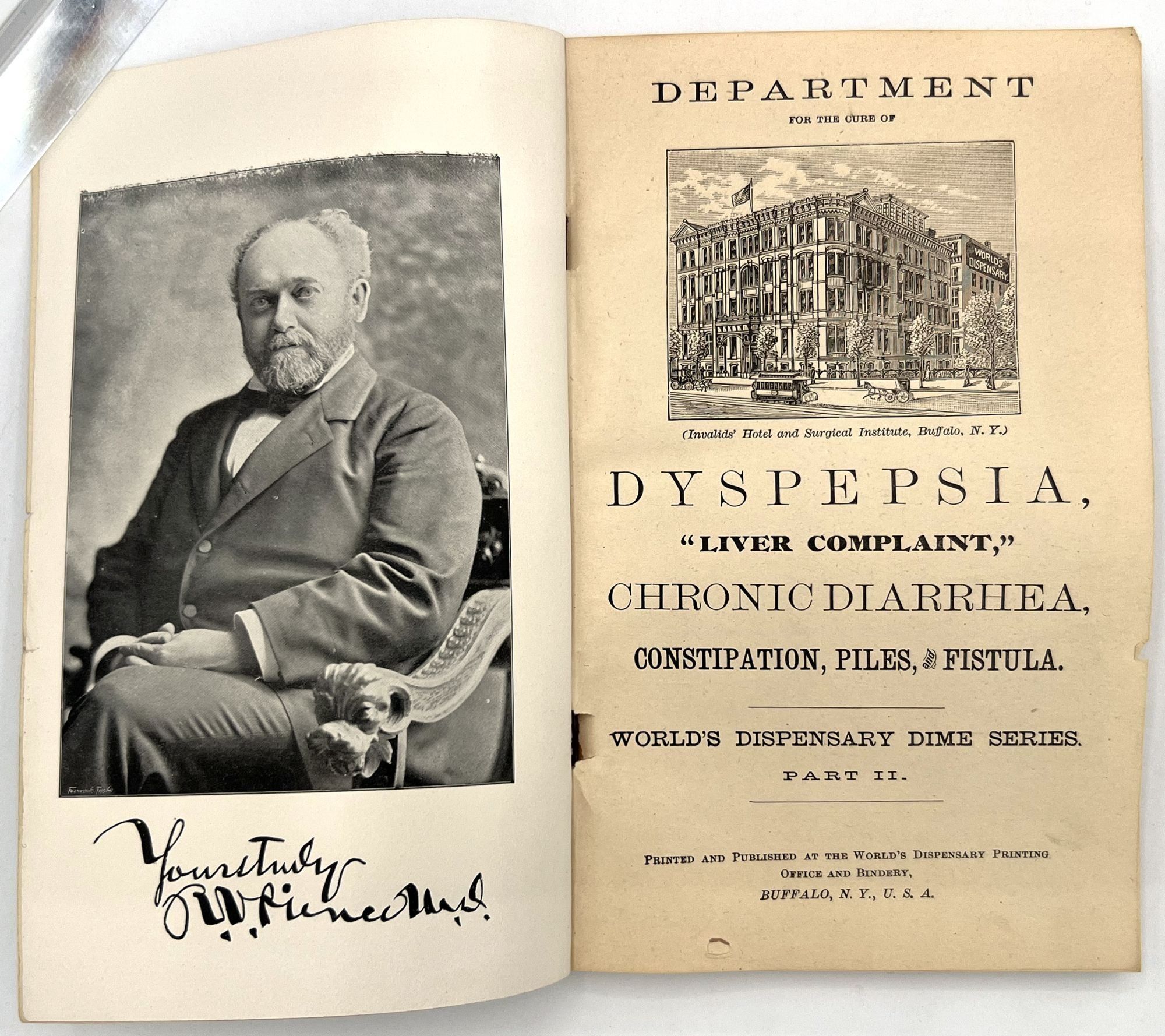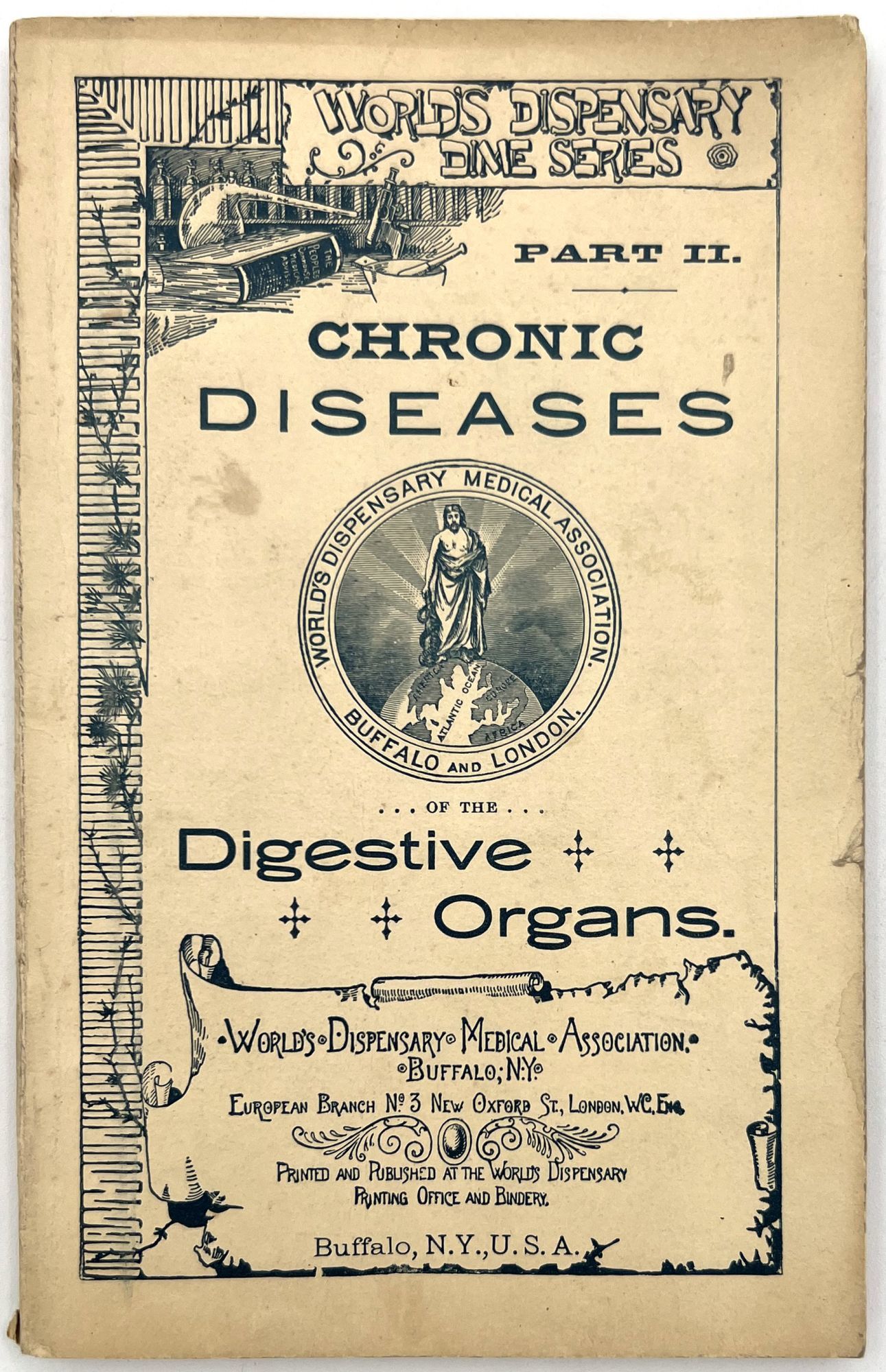 Buffalo, New York: World's Dispensary Medical Association, 1895. Very good. Light toning and dust soiling, short tears, rust staining from staples, extremities rubbed/nicked. Upper right-hand corner chewed.. Part two in a "dime series" of cheap publications promoting medicines sold by a Buffalo-, New York patent medicine company. Nostrums, snake oil remedies, patent medicines and other dubious cure-all products were an important part of the fabric of everyday life in America in the late 19th and early 20th century. Companies would have to compete for the attention of American families by issuing all kinds of flashy cheap literature through the mail and in pharmacies, including everything from magazines and almanacs to poetry and joke books. This particular example includes the following content: a lengthy overview of the digestive organs and their afflictions; testimonials for the patent medicines on offer with photos; and a history of and pitch for the company's Invalid's Hotel and Dispensary with large in-text line drawing illustrations; and close-up line illustrations of tissues and microscopic objects under a microscope. Single vol. (7.75" by 4.75"), pp. 72, illus., in original illus. yellow wrps with seal of company on front and decorative border, printed in dark blue-green. The World's Dispensary Medical Association was founded by Dr. Ray Pierce, a Buffalo doctor who had been making and selling patent medicines for patients from the 1860s.