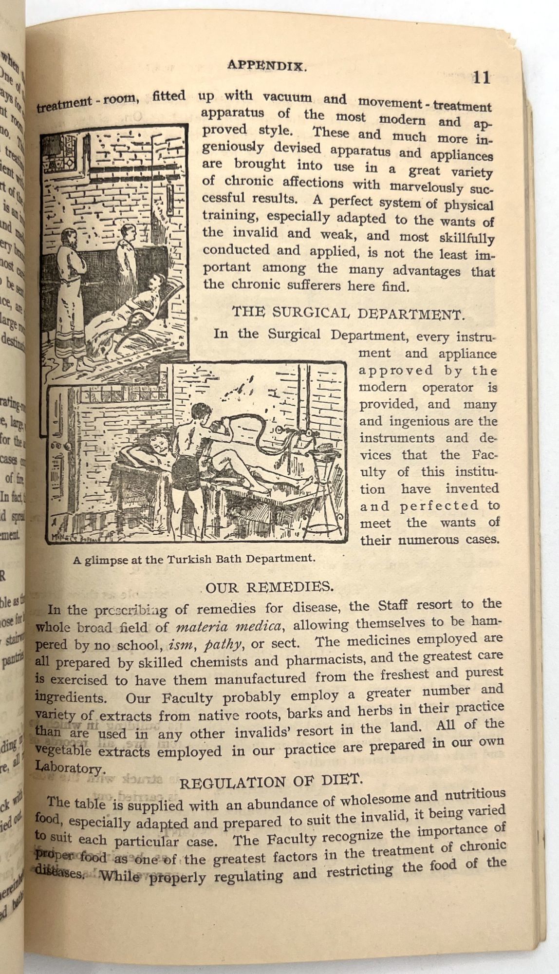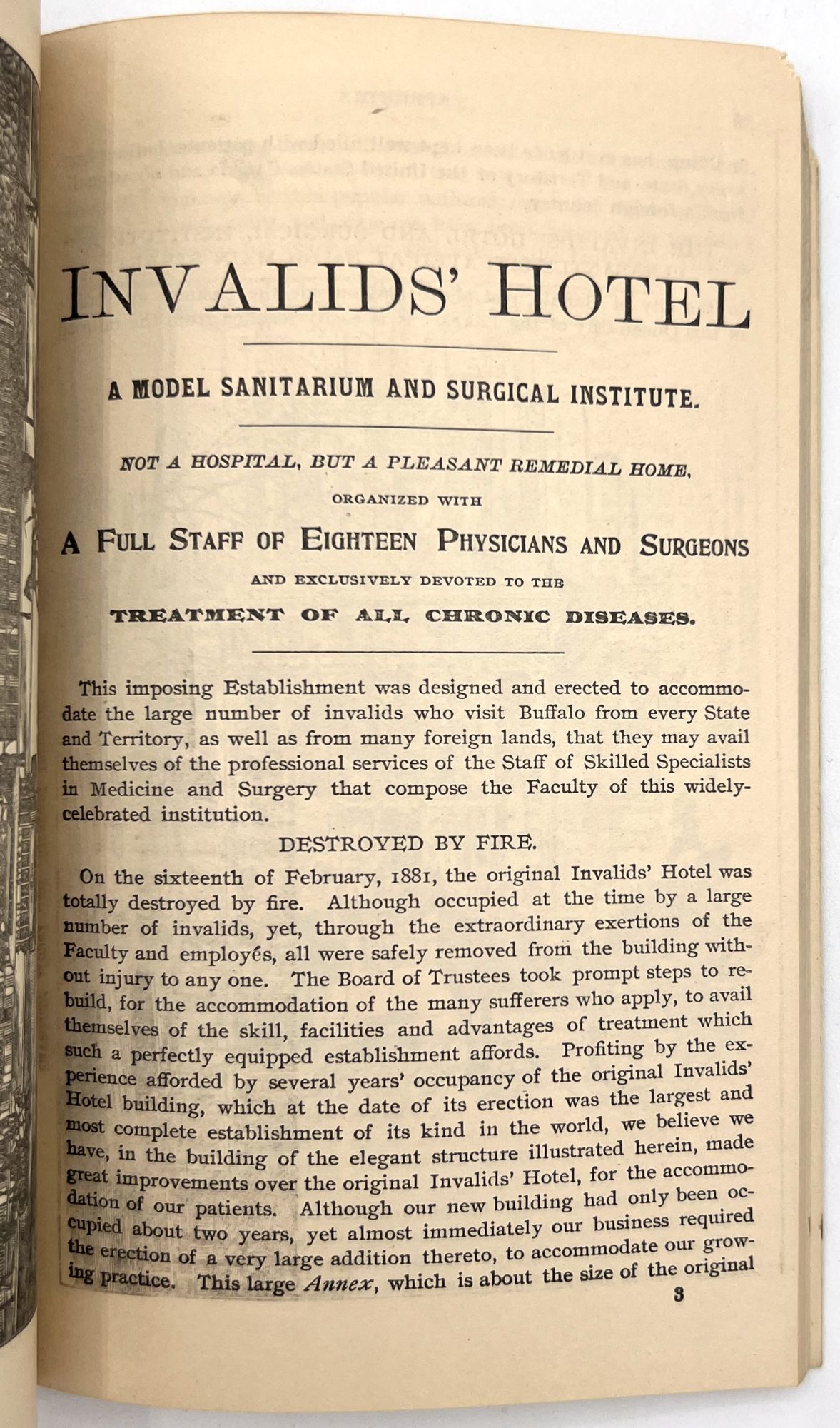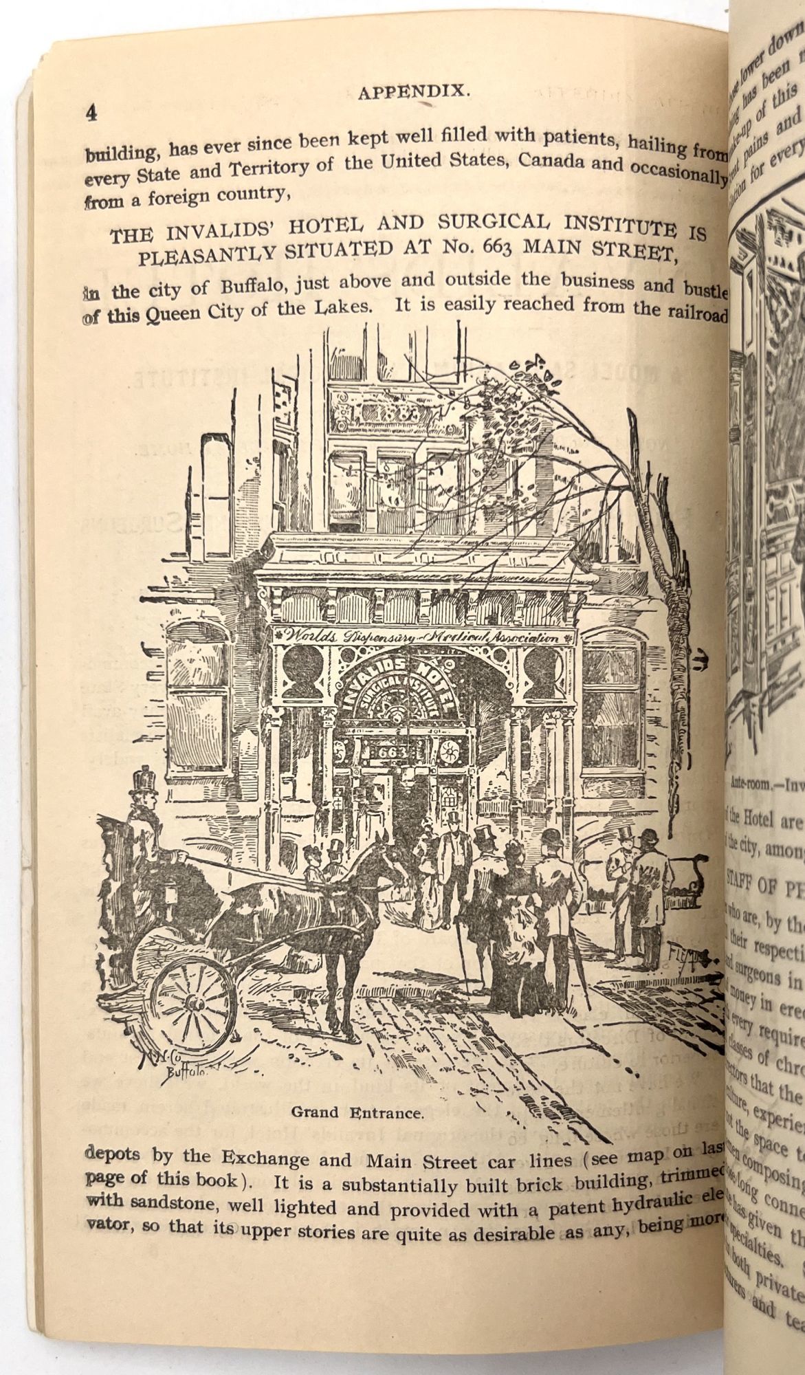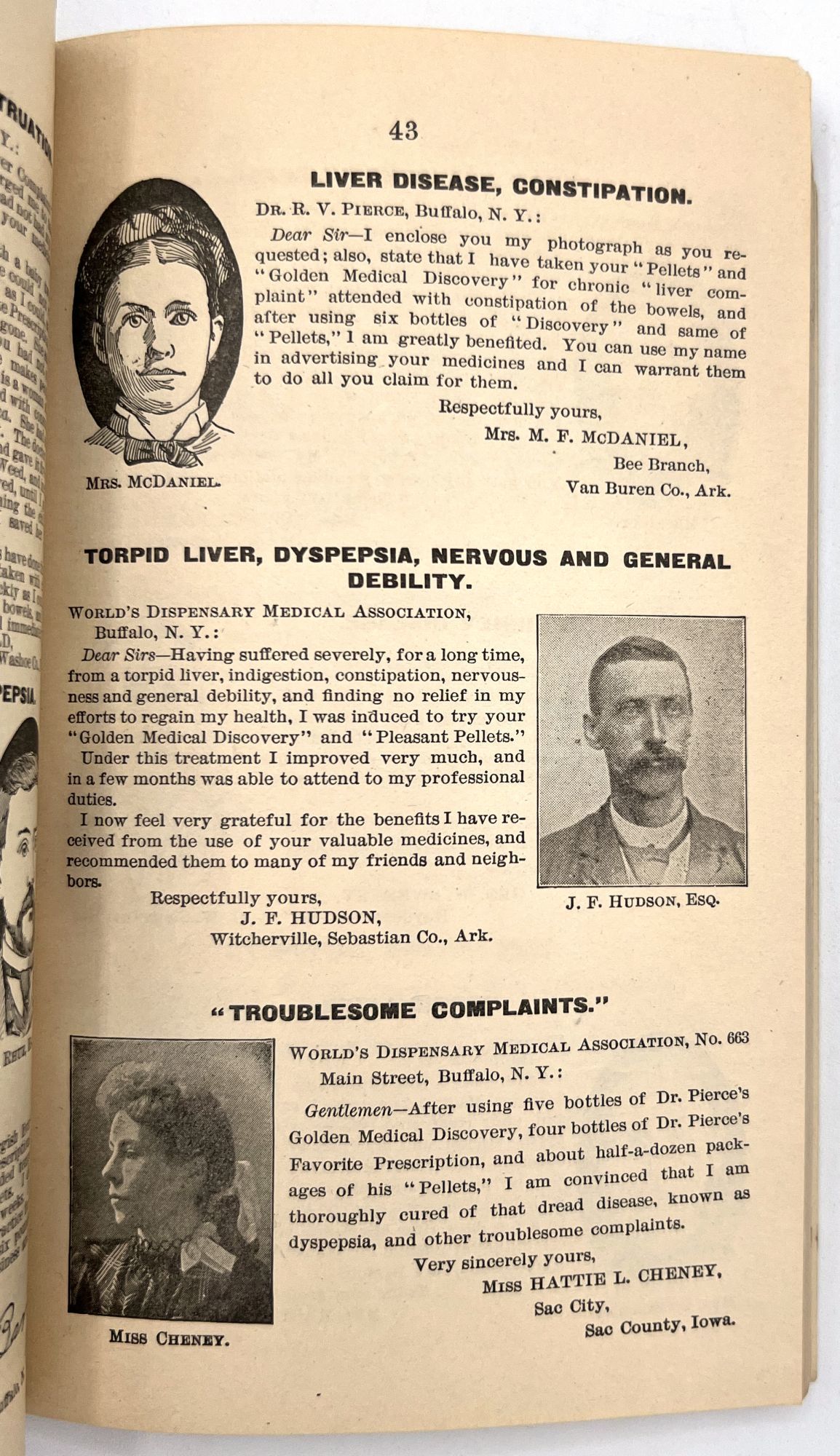 Buffalo, New York: World's Dispensary Medical Association, 1895. Very good. Light toning and dust soiling, short tears, rust staining from staples, extremities rubbed/nicked. Upper right-hand corner chewed.. Part two in a "dime series" of cheap publications promoting medicines sold by a Buffalo-, New York patent medicine company. Nostrums, snake oil remedies, patent medicines and other dubious cure-all products were an important part of the fabric of everyday life in America in the late 19th and early 20th century. Companies would have to compete for the attention of American families by issuing all kinds of flashy cheap literature through the mail and in pharmacies, including everything from magazines and almanacs to poetry and joke books. This particular example includes the following content: a lengthy overview of the digestive organs and their afflictions; testimonials for the patent medicines on offer with photos; and a history of and pitch for the company's Invalid's Hotel and Dispensary with large in-text line drawing illustrations; and close-up line illustrations of tissues and microscopic objects under a microscope. Single vol. (7.75" by 4.75"), pp. 72, illus., in original illus. yellow wrps with seal of company on front and decorative border, printed in dark blue-green. The World's Dispensary Medical Association was founded by Dr. Ray Pierce, a Buffalo doctor who had been making and selling patent medicines for patients from the 1860s.