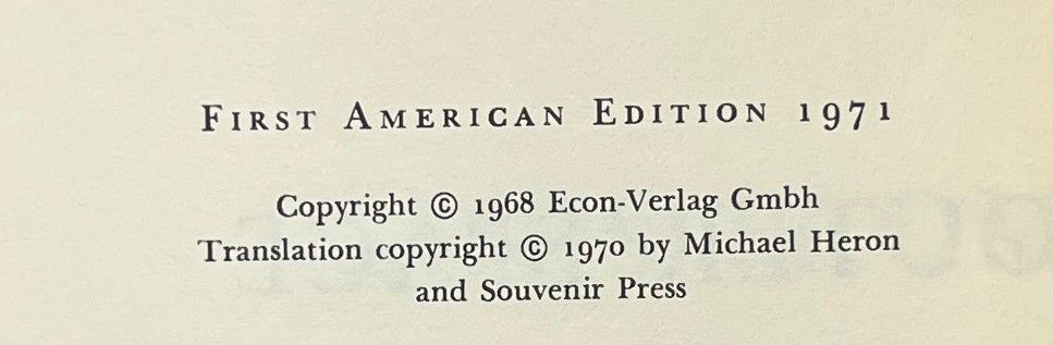 New York: G.P. Putnam's Sons, 1971. First Edition. Hardcover. Near Fine/Very Good. Translated by Michael Heron. Near Fine in a Very Good jacket, unclipped ($5.95), faded at the spine, rubbed and soiled at the surface and edges. Quarter black cloth with red paper on the boards. Square and firmly bound, ownership signature of Tom Benson on the front endpaper, clean otherwise. From the collection of ufologist Tom Benson.