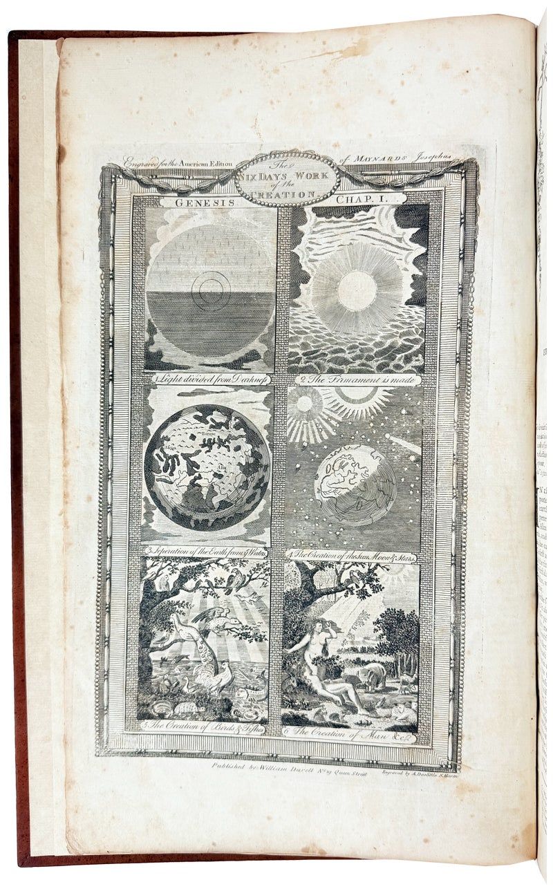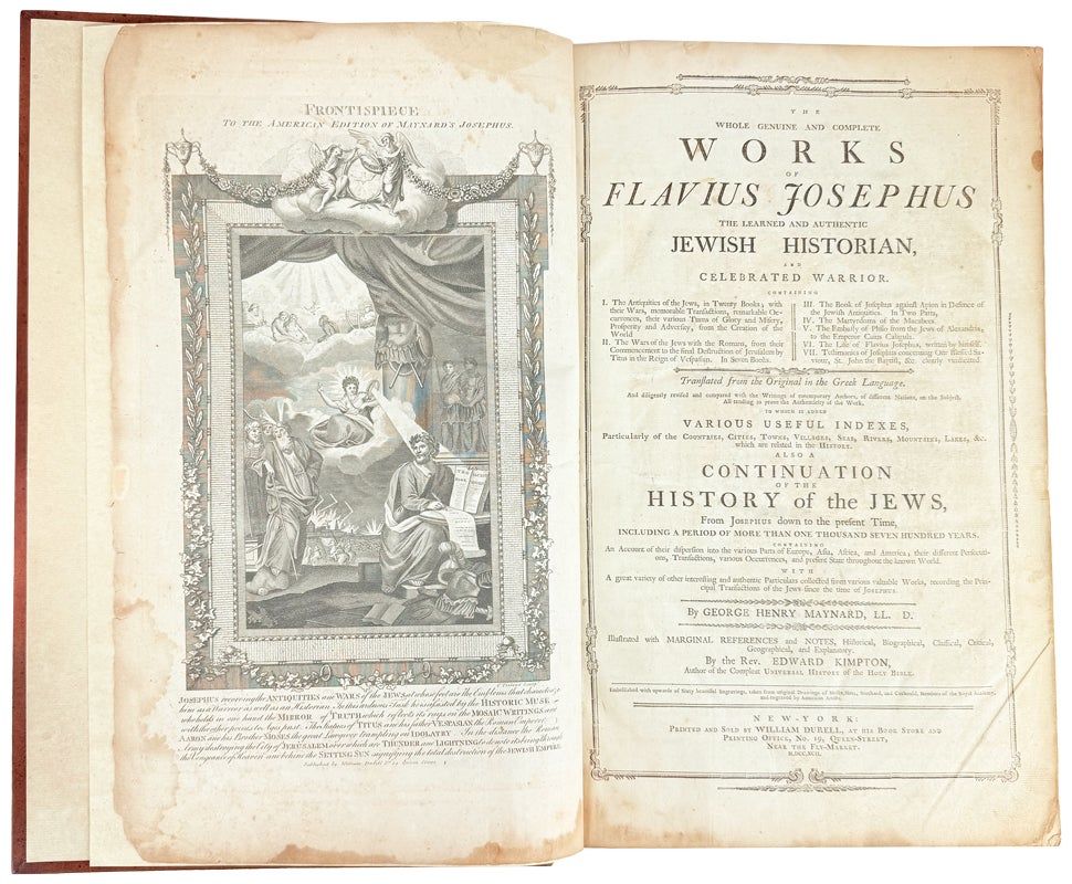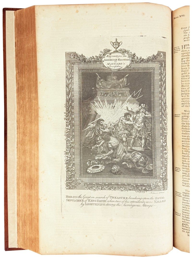 The Maynard Josephus is not only a fascinating illustrated tour of the ancient world, but, per Sabin, it is "worthy of notice for the specimens of early engraving in the United States." Tiebout and Anderson, the latter responsible for the fold-out map of Jerusalem in this volume, were barely 20 years old at the time. An impressive and striking production.