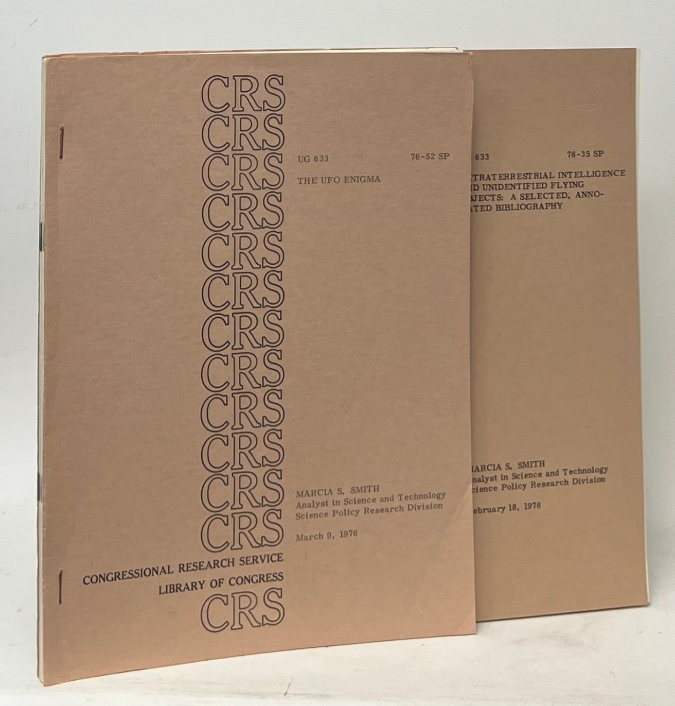 Washington DC: Congressional Research Service, 1976. Staplebound. Near Fine. UG 633 76-52 SP and 76-35 SP. Two volumes. Near Fine. Light wear and some creases to UFO Enigma. Square and firmly bound with two staples, clean internally. Both volumes of this work created for inquiring Congresspeople. From the collection of ufologist Tom Benson. [Rasmussen 904-905].