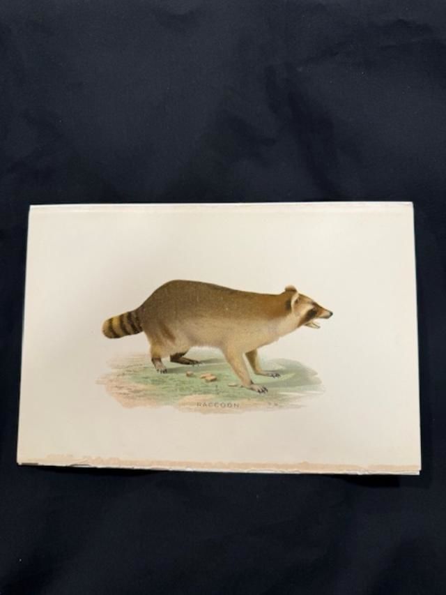 Print, chromolithograph, about 10" X 6 1/2". Bright and clean. This plate features a Raccoon in active position. Attrative print with really nice colors.