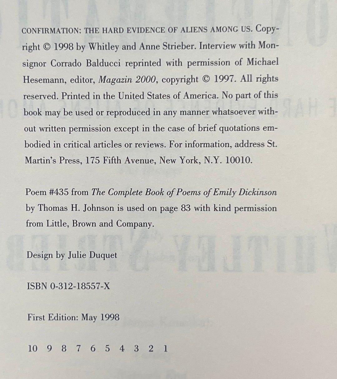 New York: St. Martin's Press, 1998. First Edition. Hardcover. Near Fine/Near Fine. Signed by Strieber on the half-title. Near Fine in a Near Fine jacket, unclipped ($23.95), bumped at the edges, rubbed at the surface. Black paper on the boards, bumped at the head and foot of the spine, with silver gilt lettering on the spine. Square and firmly bound, clean internally. From the collection of ufologist Tom Benson.