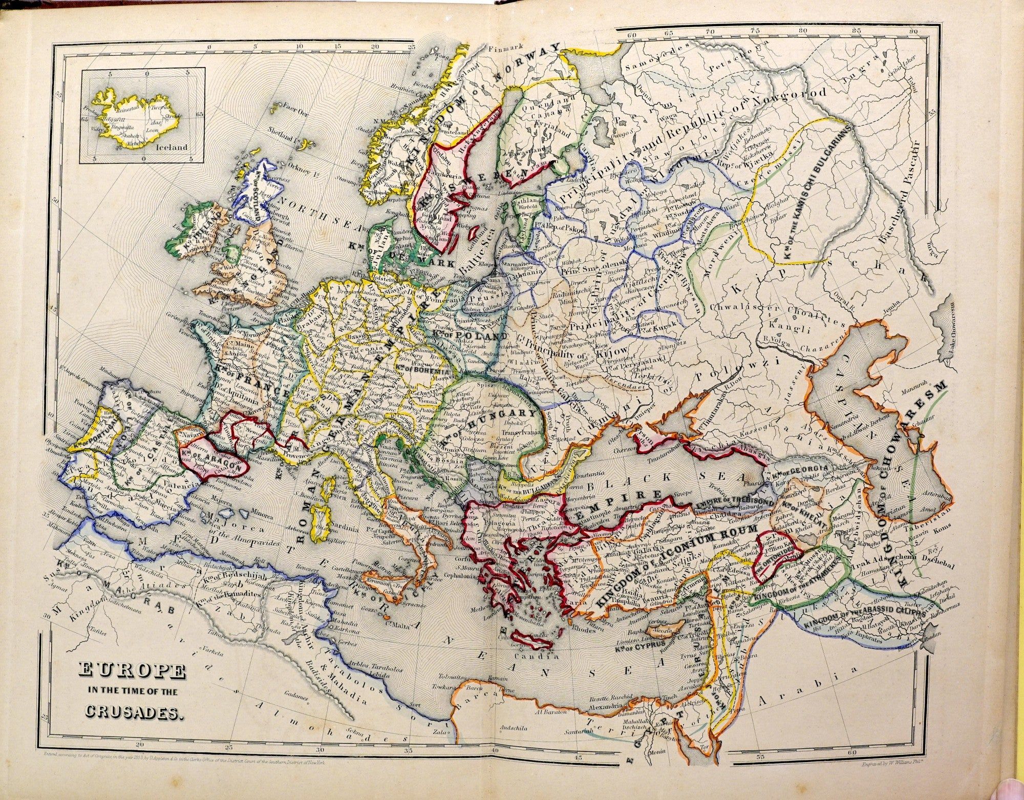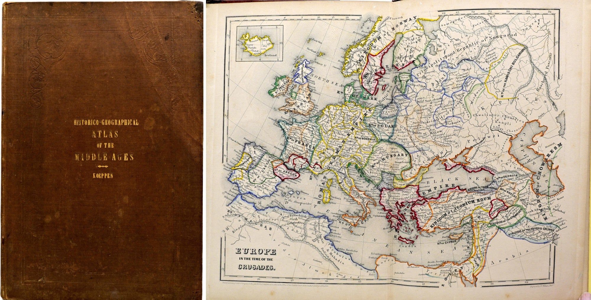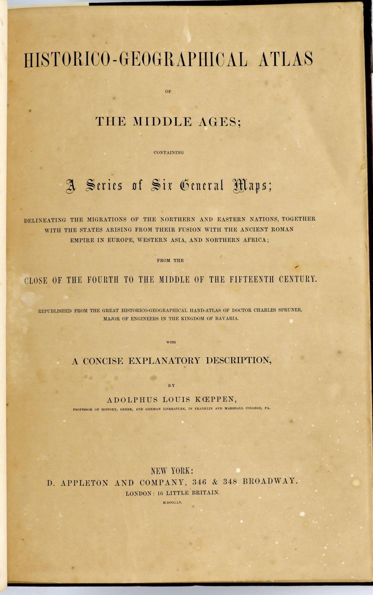 [ATLAS] HISTORICO-GEOGRAPHICAL ATLAS OF THE MIDDLE AGES; CONTAINING A SERIES OF SIX GENERAL MAPS; DELINEATING THE MIGRATIONS OF THE NORTHERN AND EASTERN NATIONS, TOGETHER WITH THE STATES ARISING FROM THEIR FUSION WITH THE ANCIENT ROMAN EMPIRE IN EUROPE, WESTERN ASIA, AND NORTHERN AFRICA; FROM THE CLOSE OF THE FOURTH TO THE MIDDLE OF THE FIFTEENTH CENTURY. REPUBLISHED FROM THE GREAT HISTORICO-GEOGRAPHICAL HAND-ATLAS OF DOCTOR CHARLES SPRUNER, MAJOR OF ENGINEERS IN THE KINGDOM OF BAVARIA. WITH A CONCISE EXPLANATORY DESCRIPTION