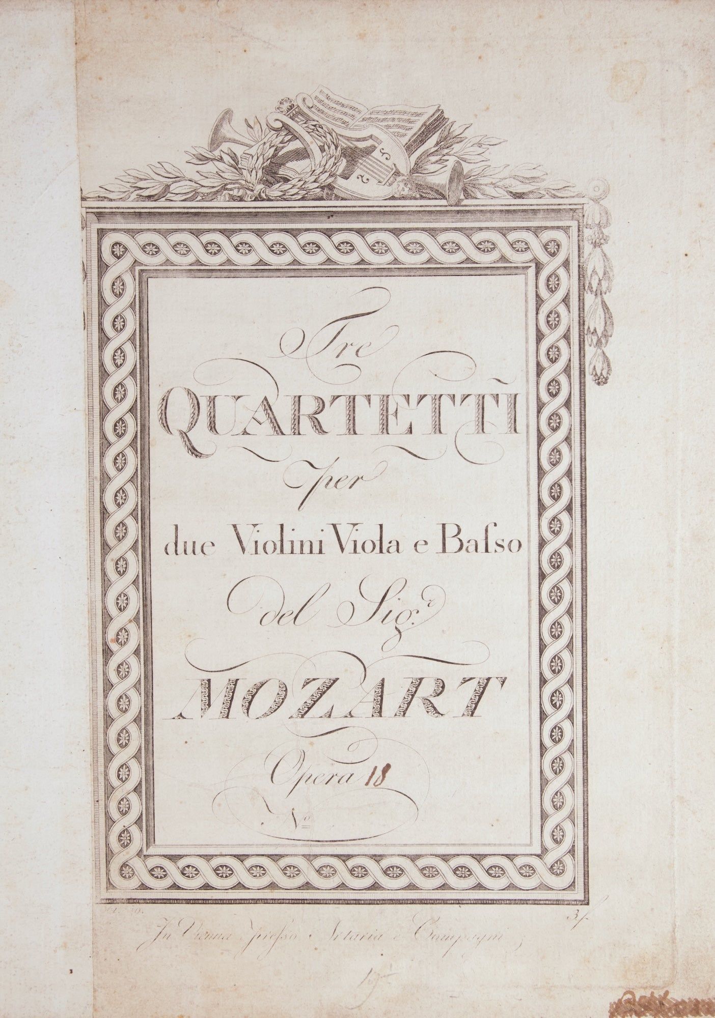 Slightly worn and thumbed; inner margin of title guarded just affecting edge of printed border; occasional markings in pencil and crayon; early signature to lower outer corner of title crossed out. First Edition, 4th issue of the Prussian Quartets. Haberkamp Text p. 326. BUC p. 709. RISM M6169 (not distinguishing among issues).