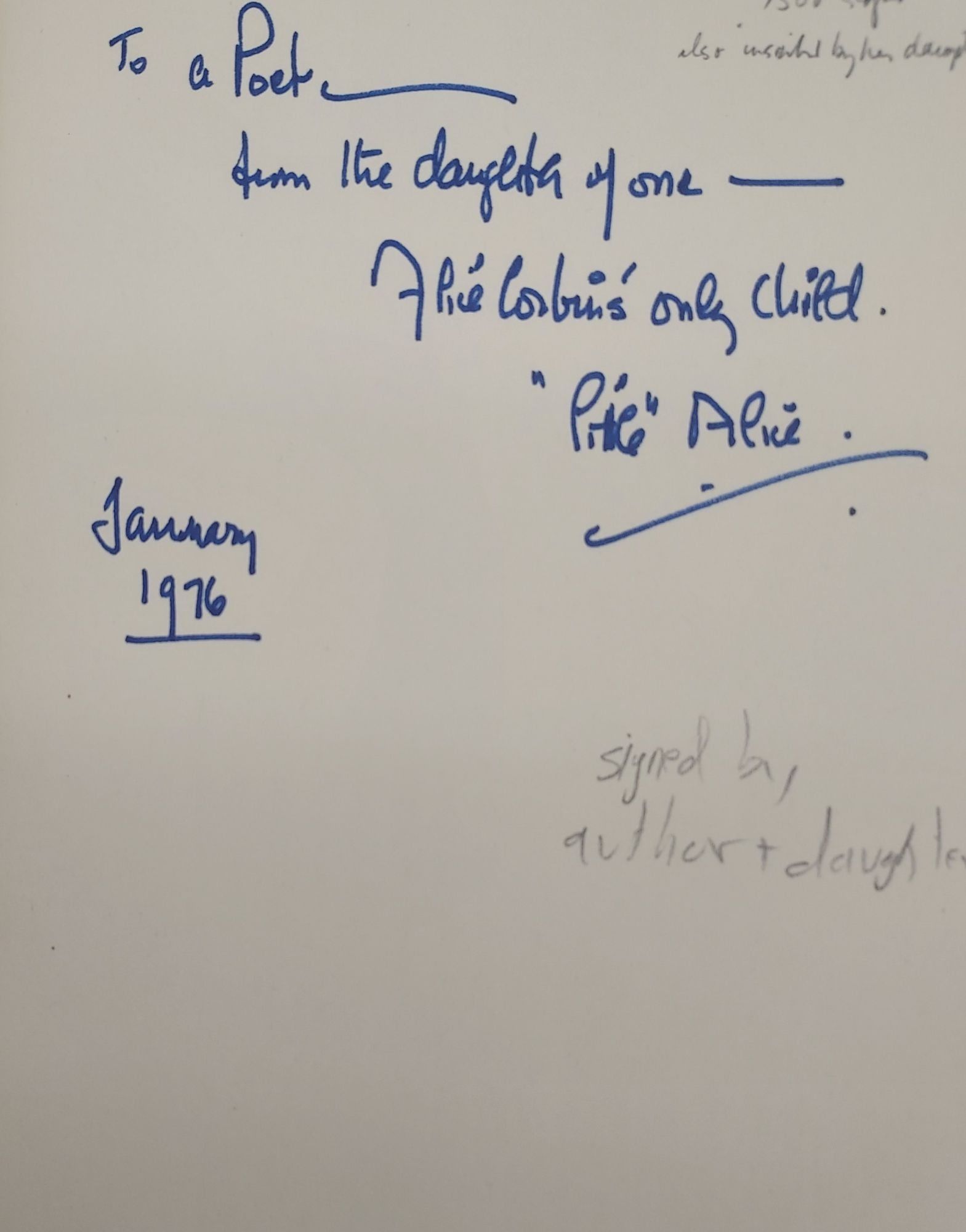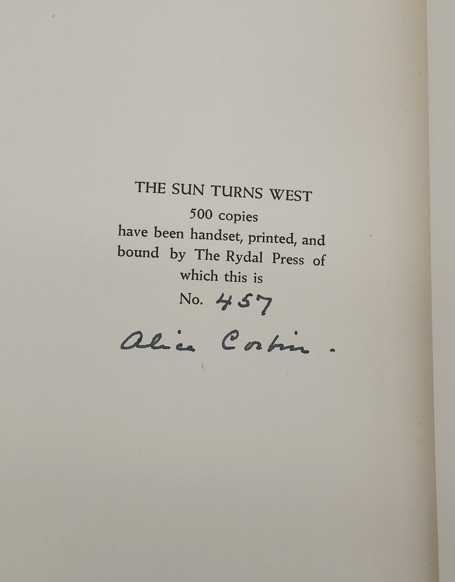 Santa Fe, NM: Writers' Editions, 1933. Limited Edition. Hardcover. Very Good +/Very Good. SIGNED. 75pp. Small octavo [21 cm] Yellow cloth over boards with the title stamped in red on the backstrip and front board. Ink lettering on front board just a trifle rubbed. Very minor toning at foot of spine. In the dust jacket, with a small stain on the surface of the spine. Number 457 in an edition limited to 500 copies. Signed by Alice Corbin on the limitation page. This copy is additionally inscribed by Alice Corbin's daughter on the front free endpaper: "To a Poet- / from the daughter of one - / Alice Corbin's only child. / 'Little' Alice / January / 1976."