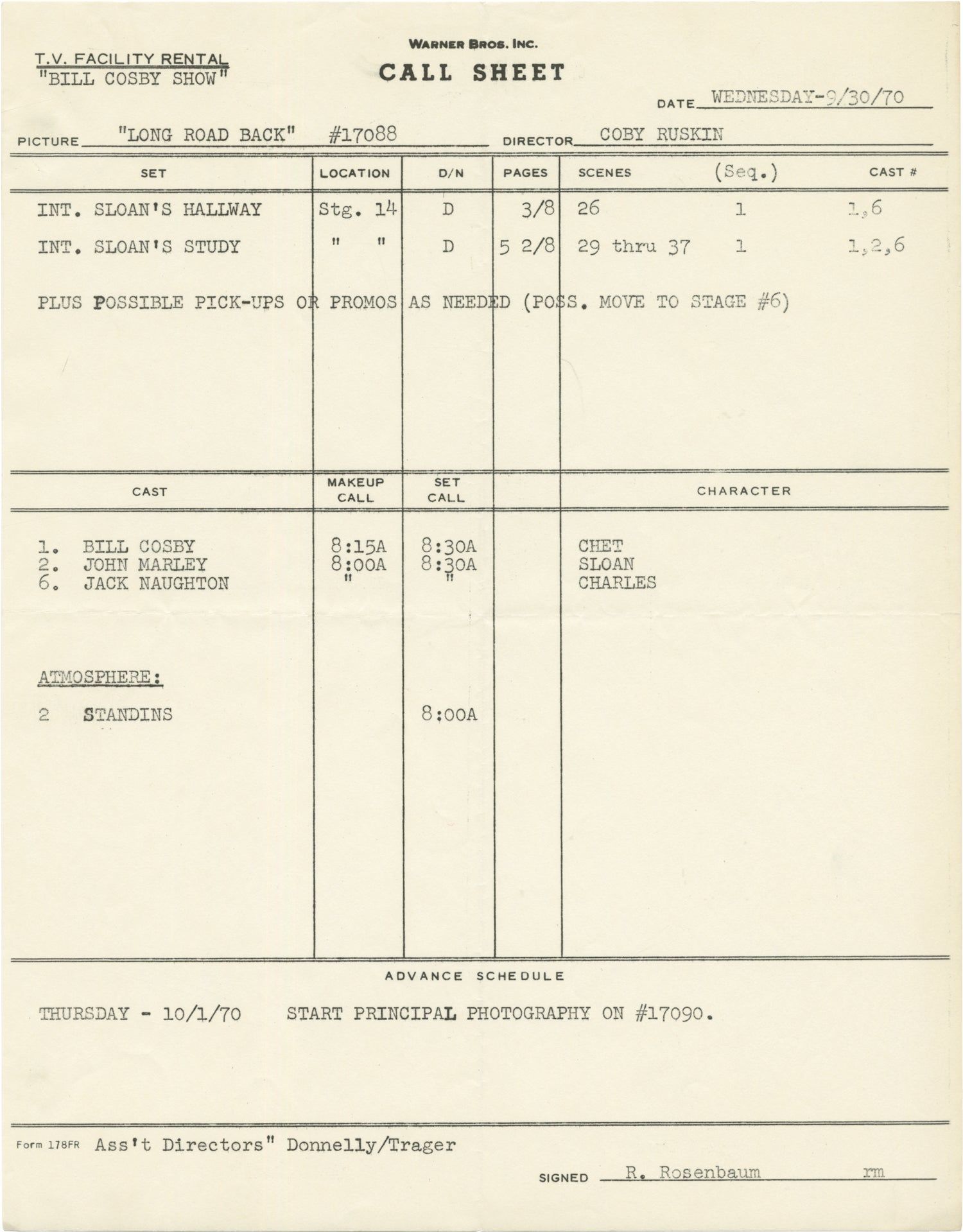 The Bill Cosby Show: The Long Road Back (Original screenplay for the 1971 television episode, copy belonging to actor Jack Naughton)